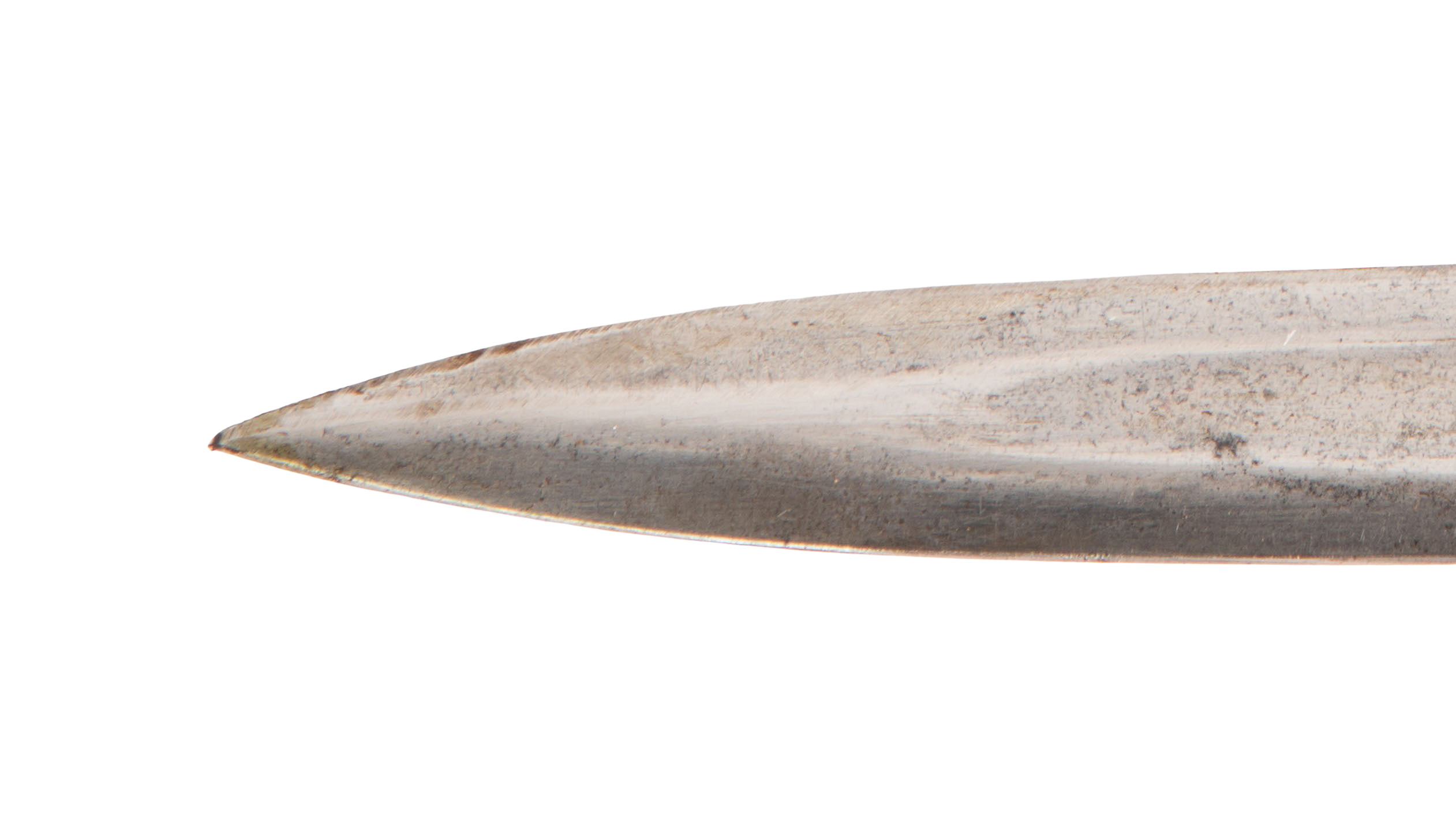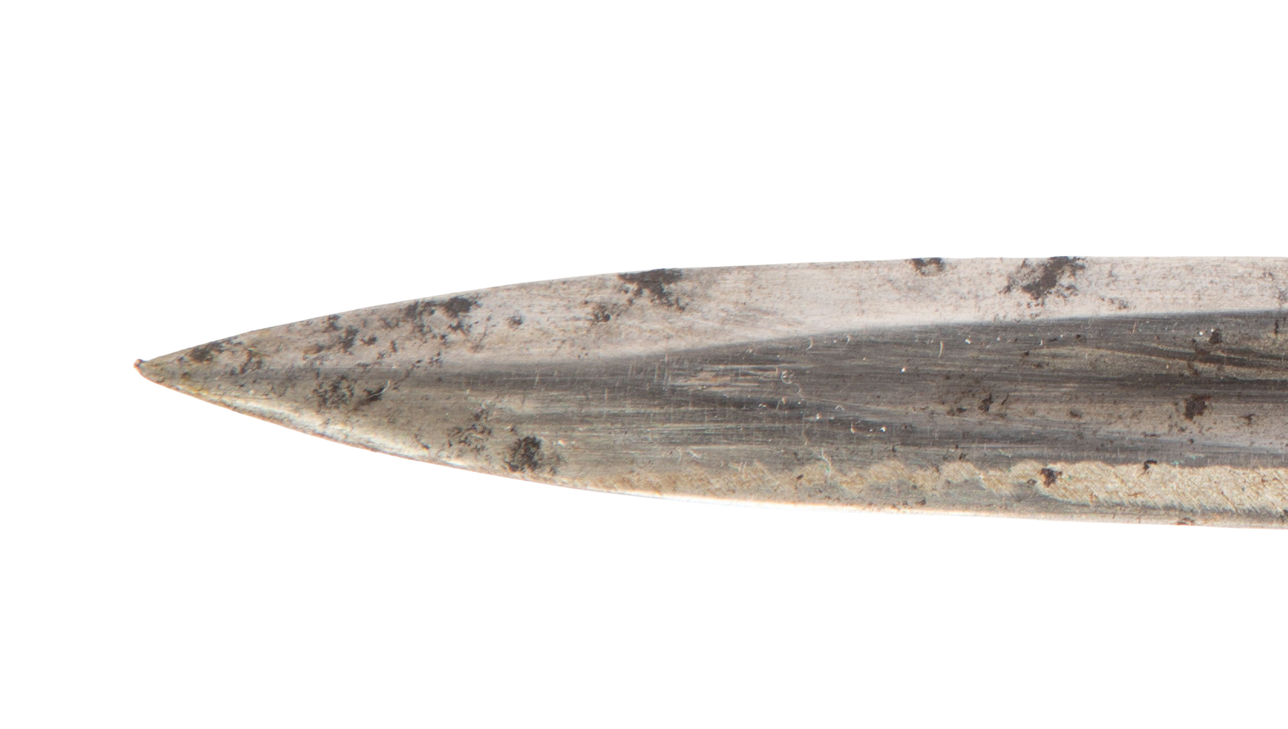 blade having some dark spots and nicks, hilt and blade tight and strong with no movement, scabbard having cracking and missing leather, brass having some rust