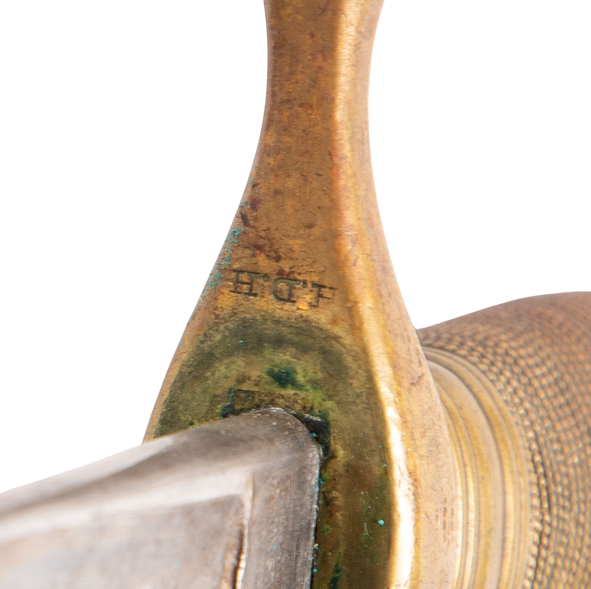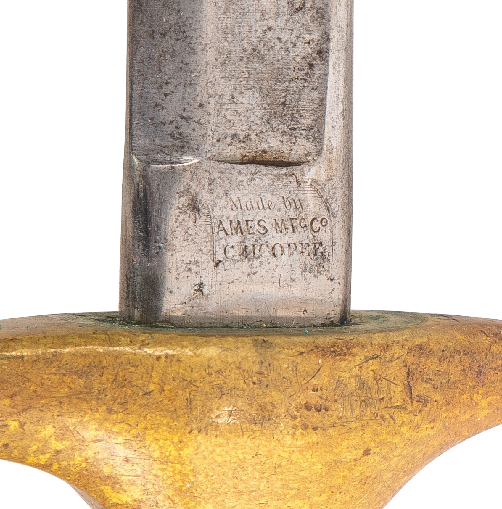 An Ames maker mark to the forte and to the reverse dated 1864 having a brass D-Shaped hilt, ribbed brass grip, plain blade with single-fuller and a leather and brass scabbard