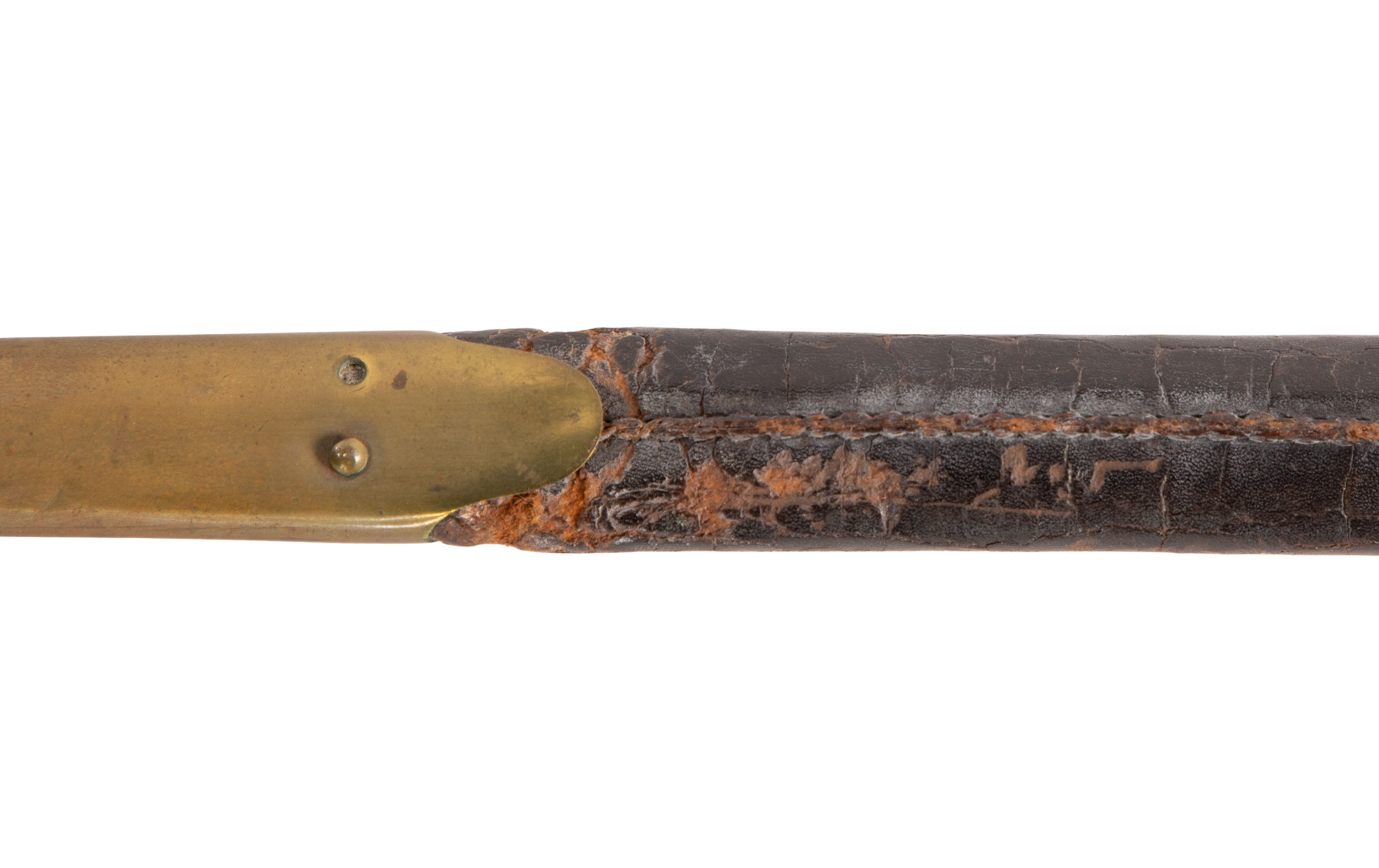 Condition: blade having some dark spots and nicks, hilt and blade tight and strong with no movement, scabbard having cracking and missing leather, brass having some rust