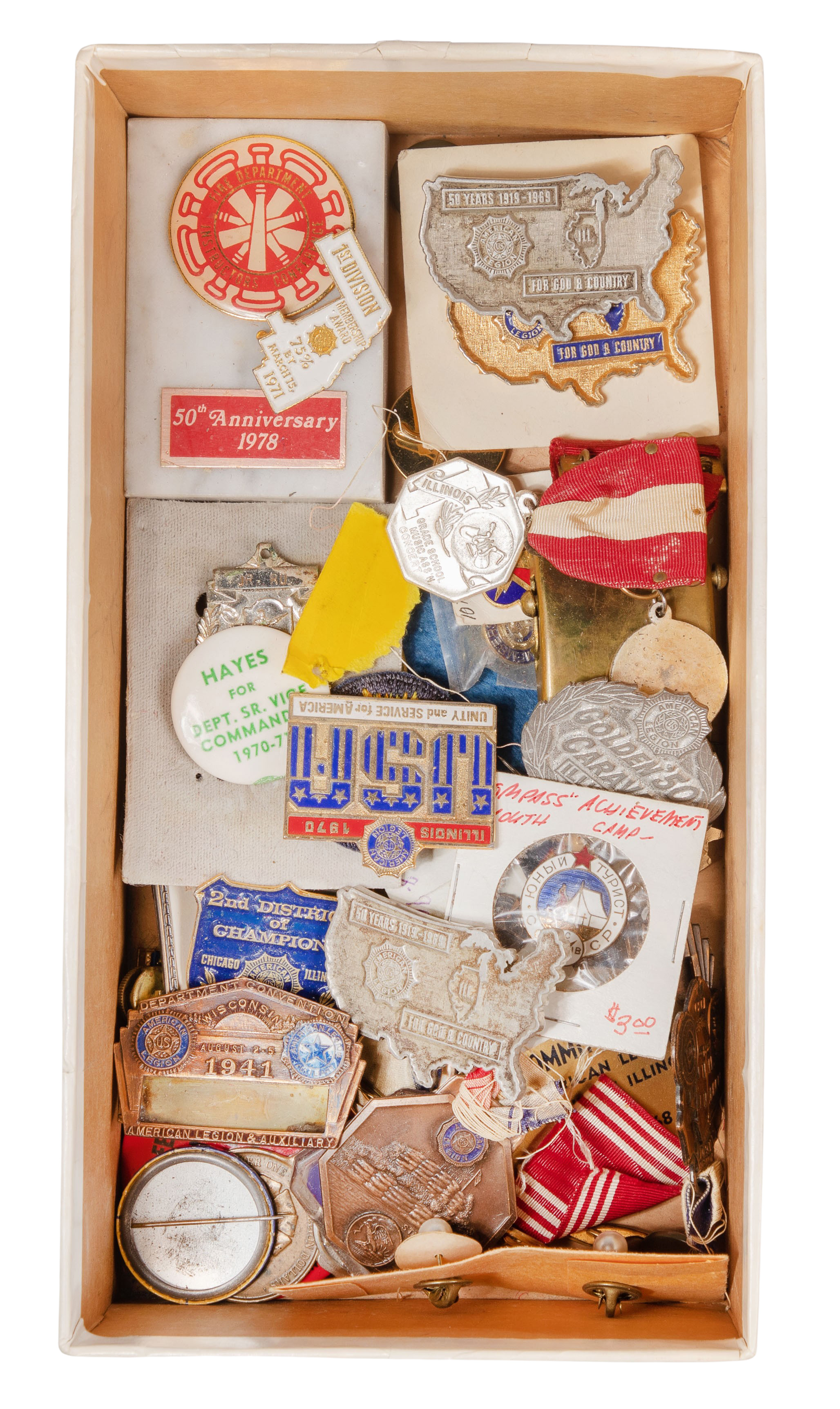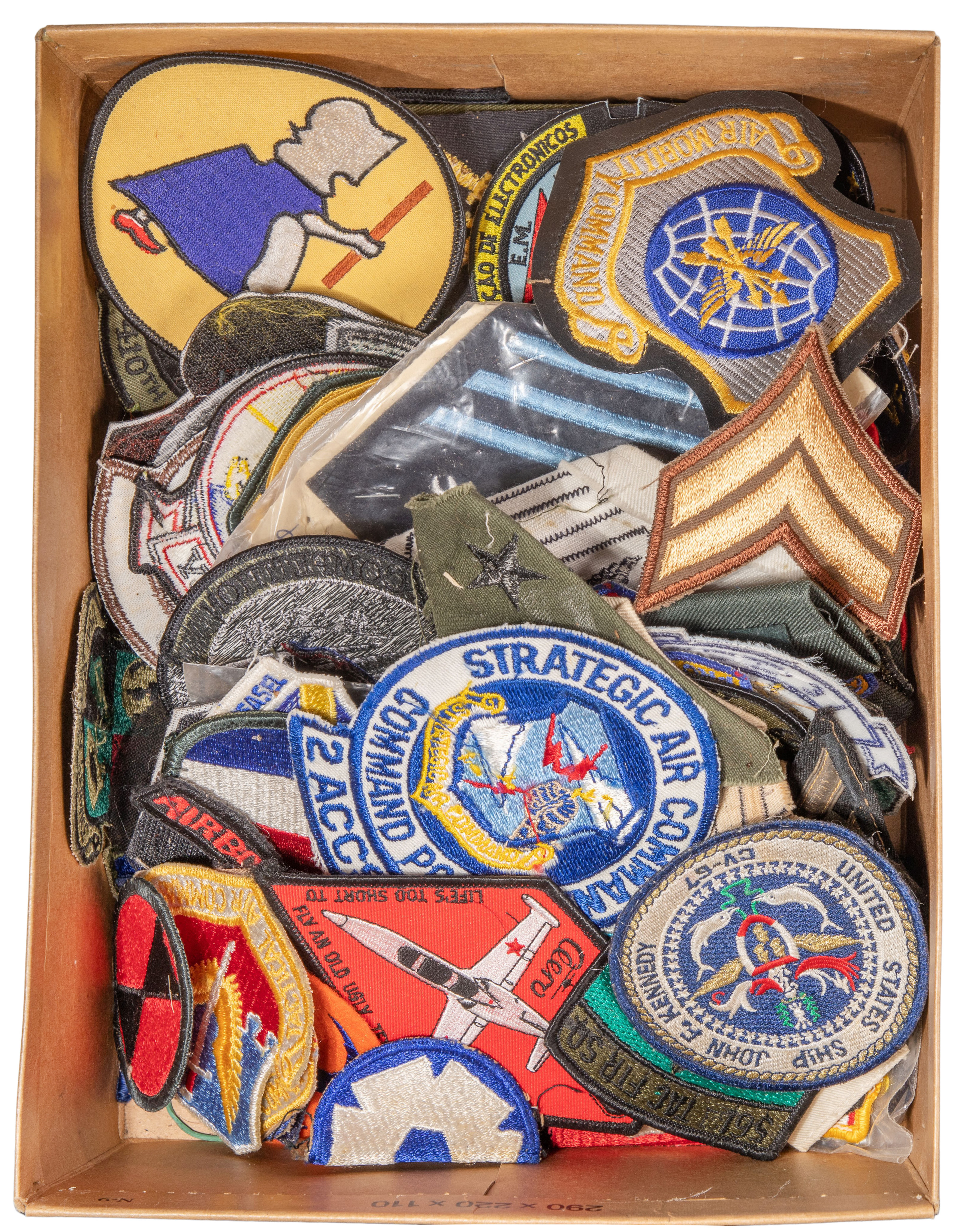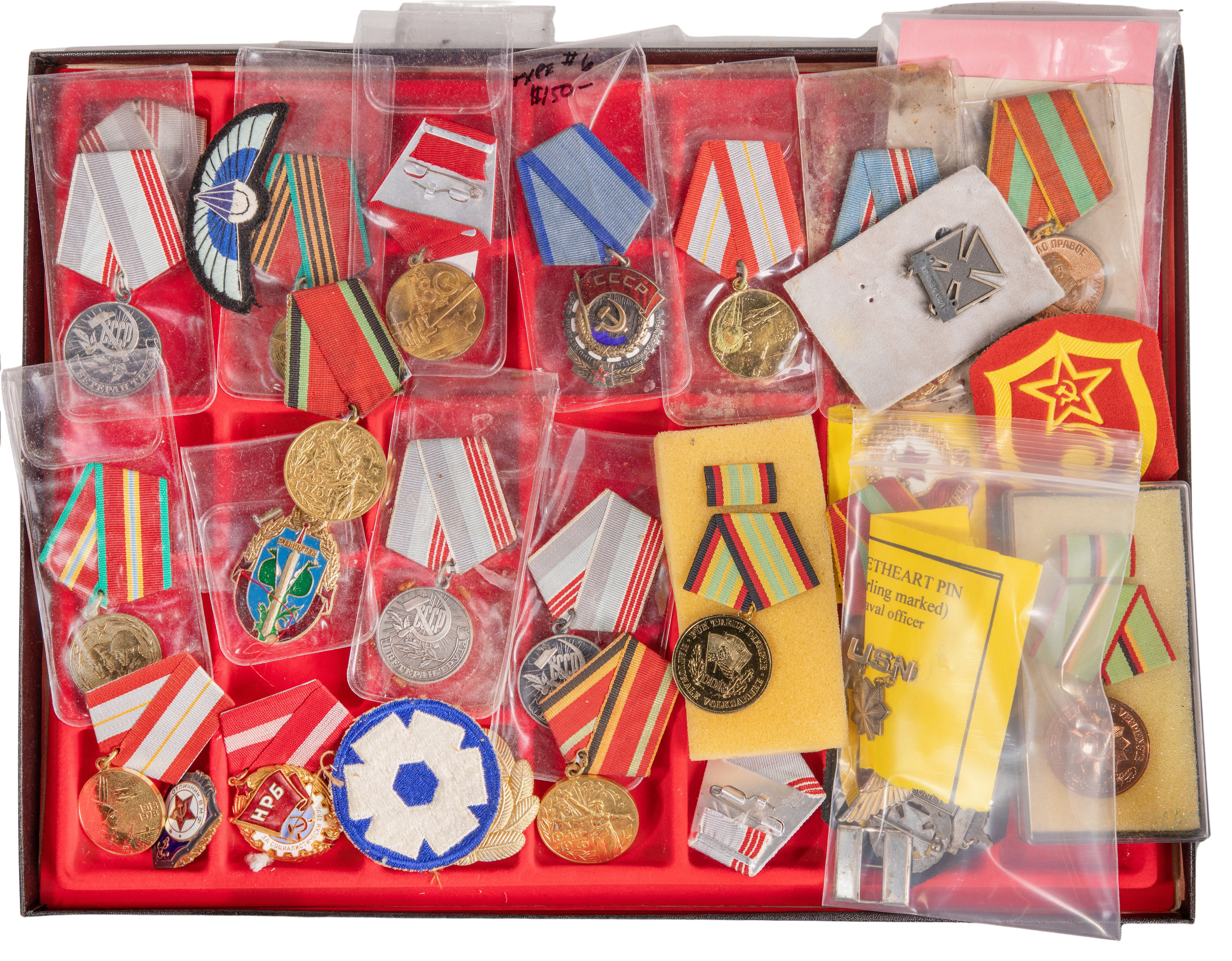 Approximately (8) pounds of medals, pins, badges, patches and buttons, mostly US military but including American Legion and Soviet pins and buttons as well as an unopened 500-count box of Soviet brass-tone uniform buttons