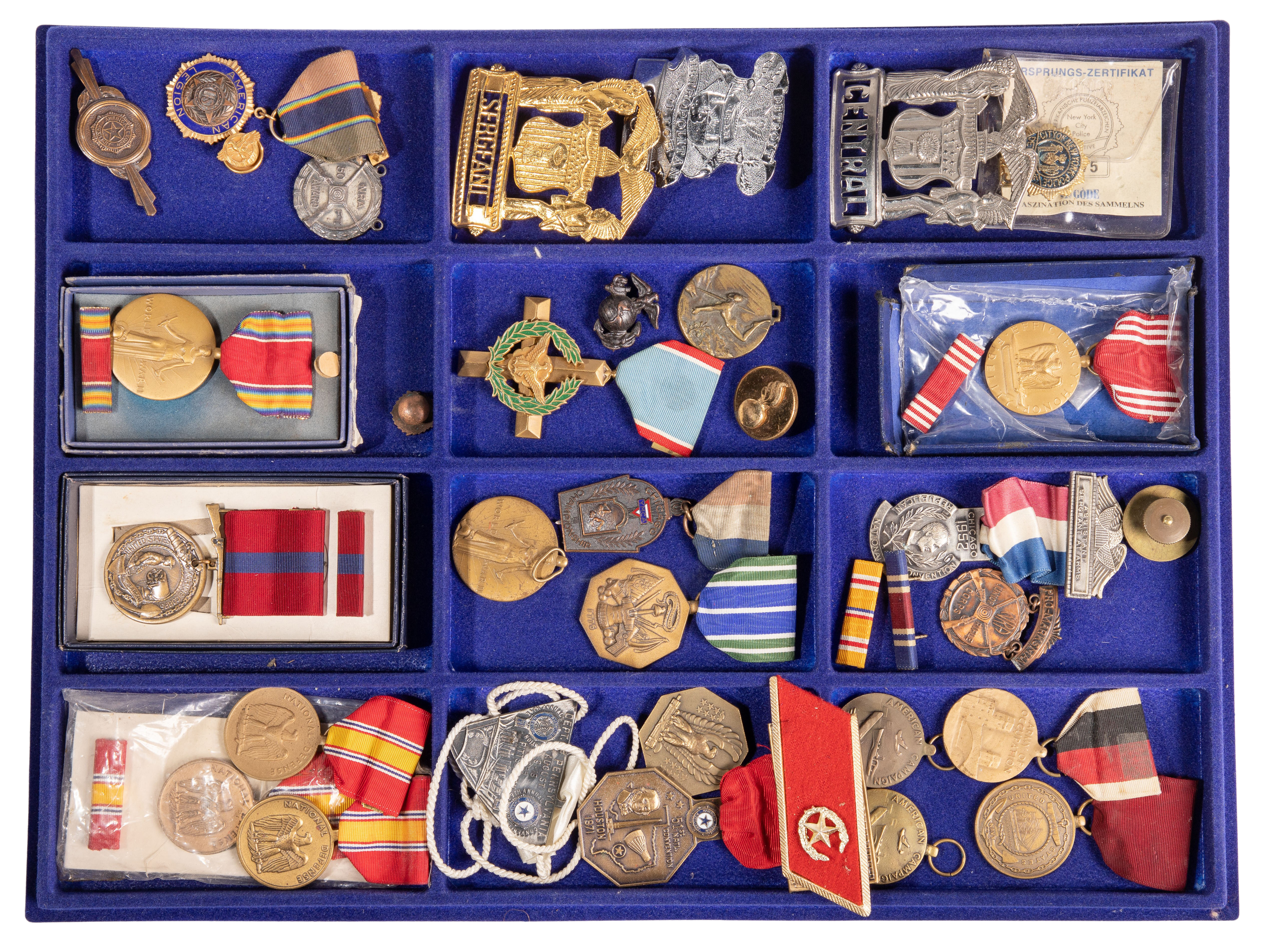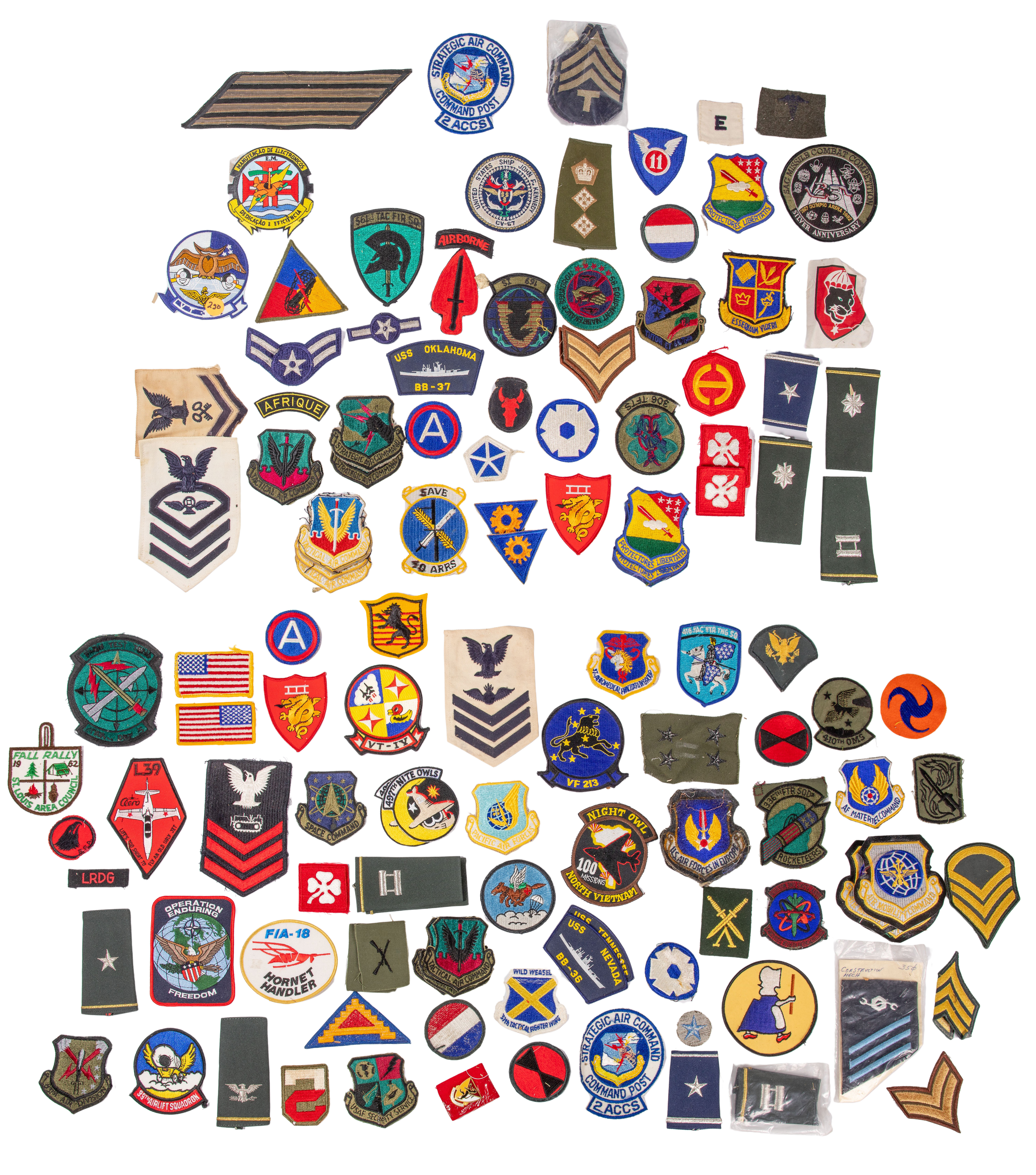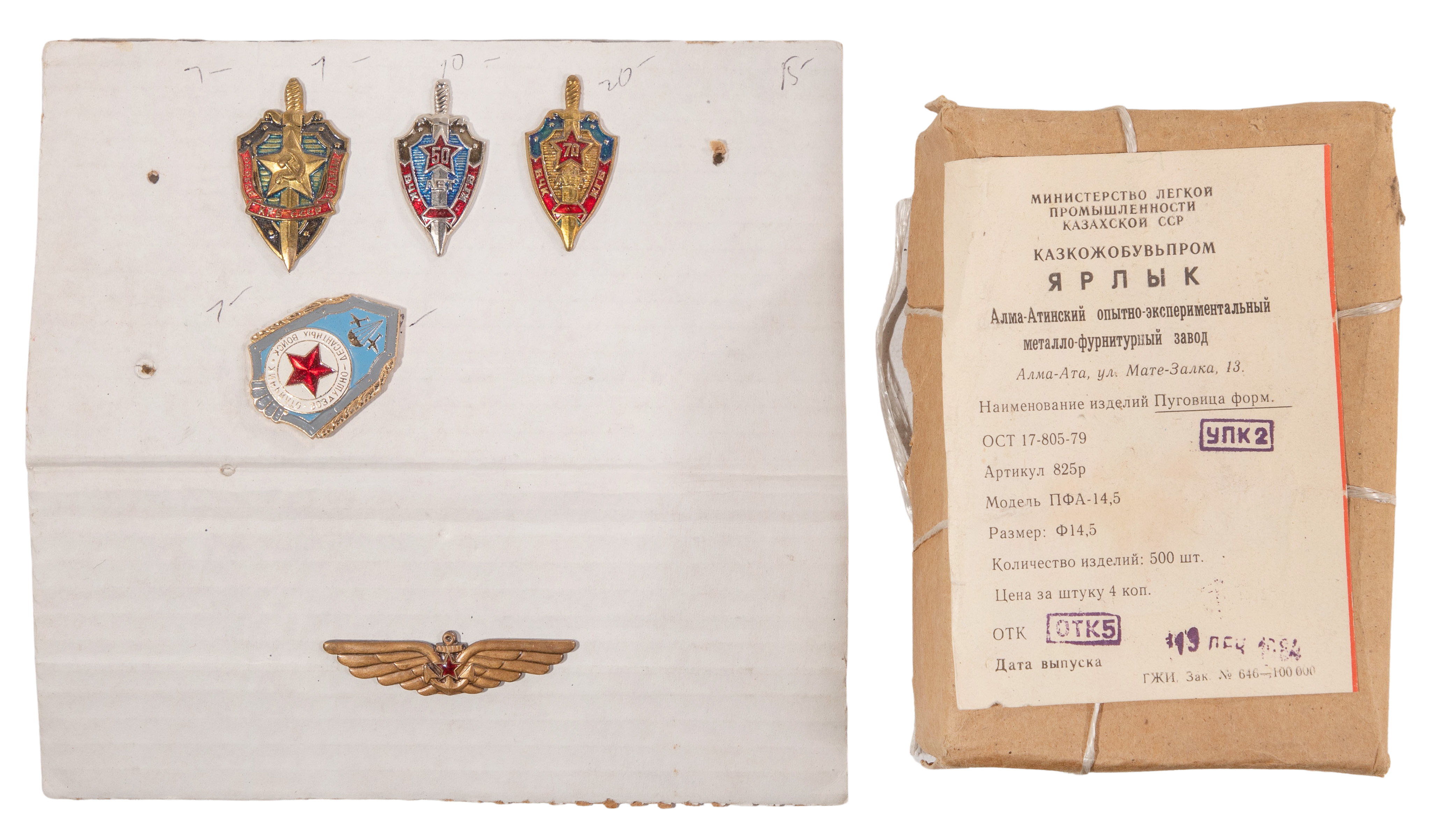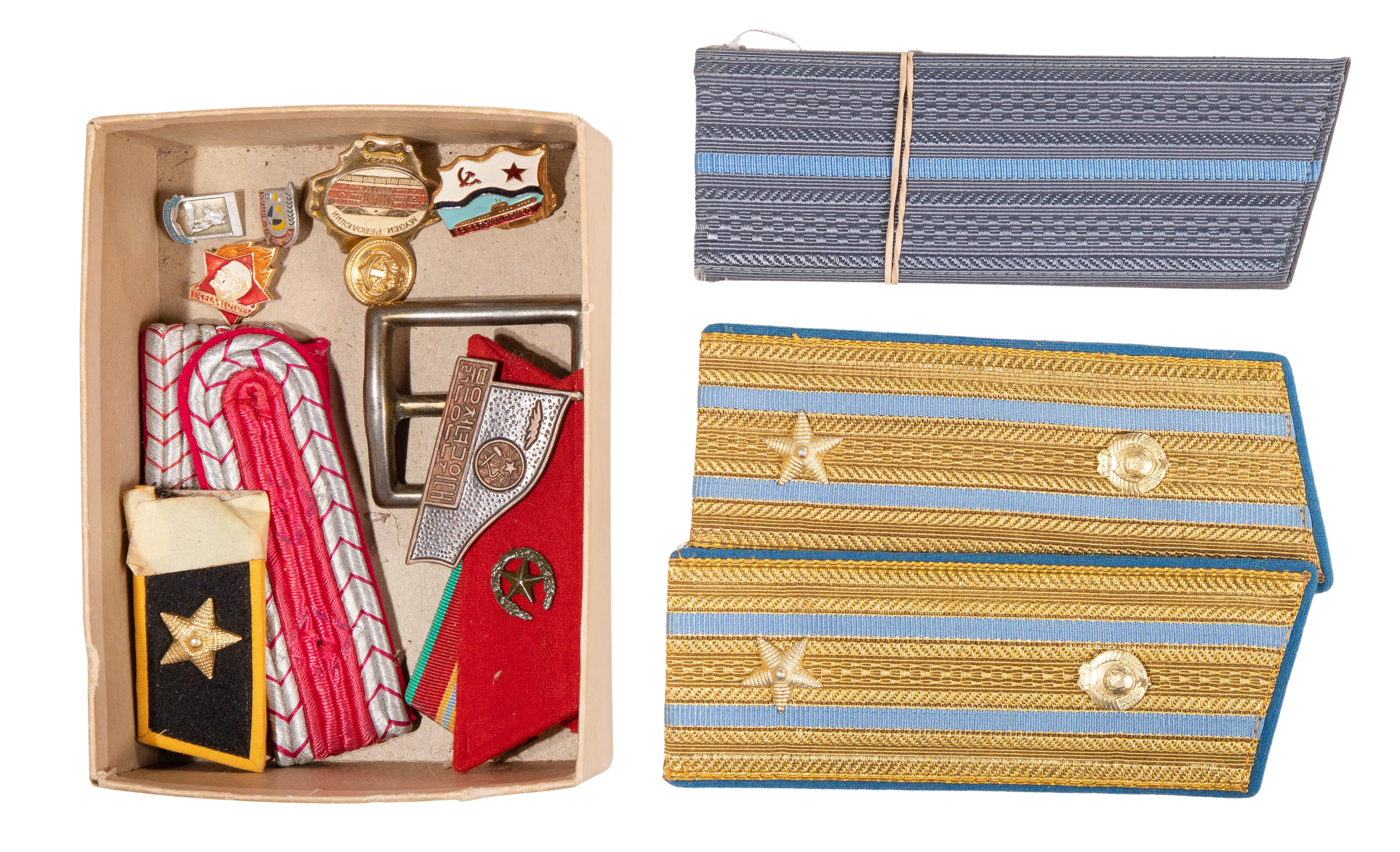 Approximately (8) pounds of medals, pins, badges, patches and buttons, mostly US military but including American Legion and Soviet pins and buttons as well as an unopened 500-count box of Soviet brass-tone uniform buttons