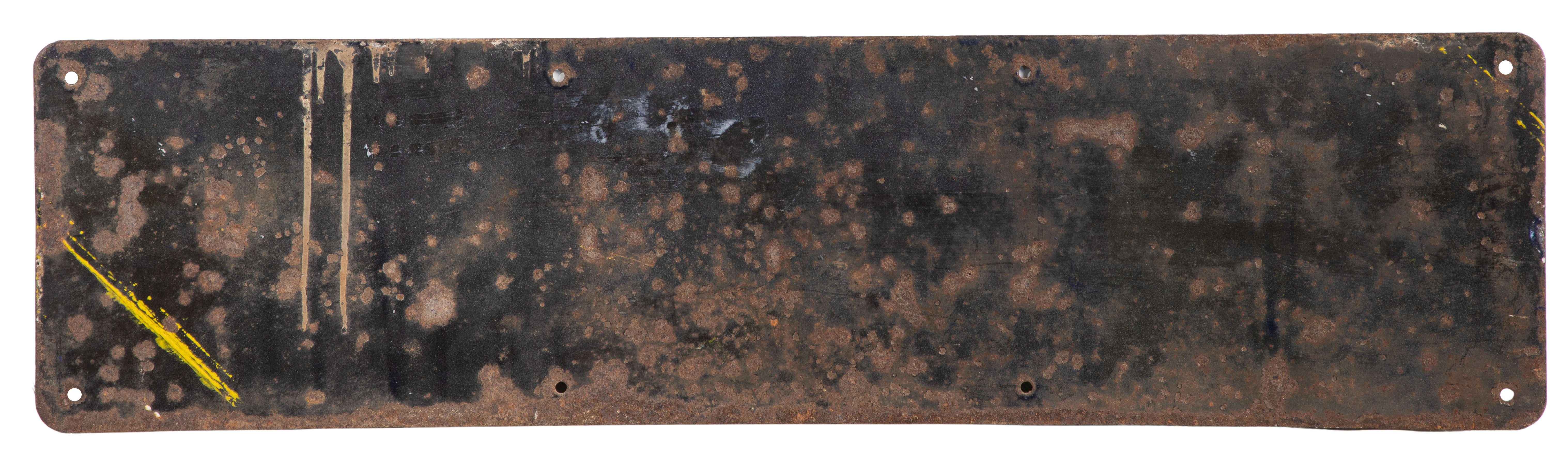 Condition: porcelain loss along the edges, near the holes, lower left, lower right, right edge near the blue border and center, rust on the back, does not lay flat