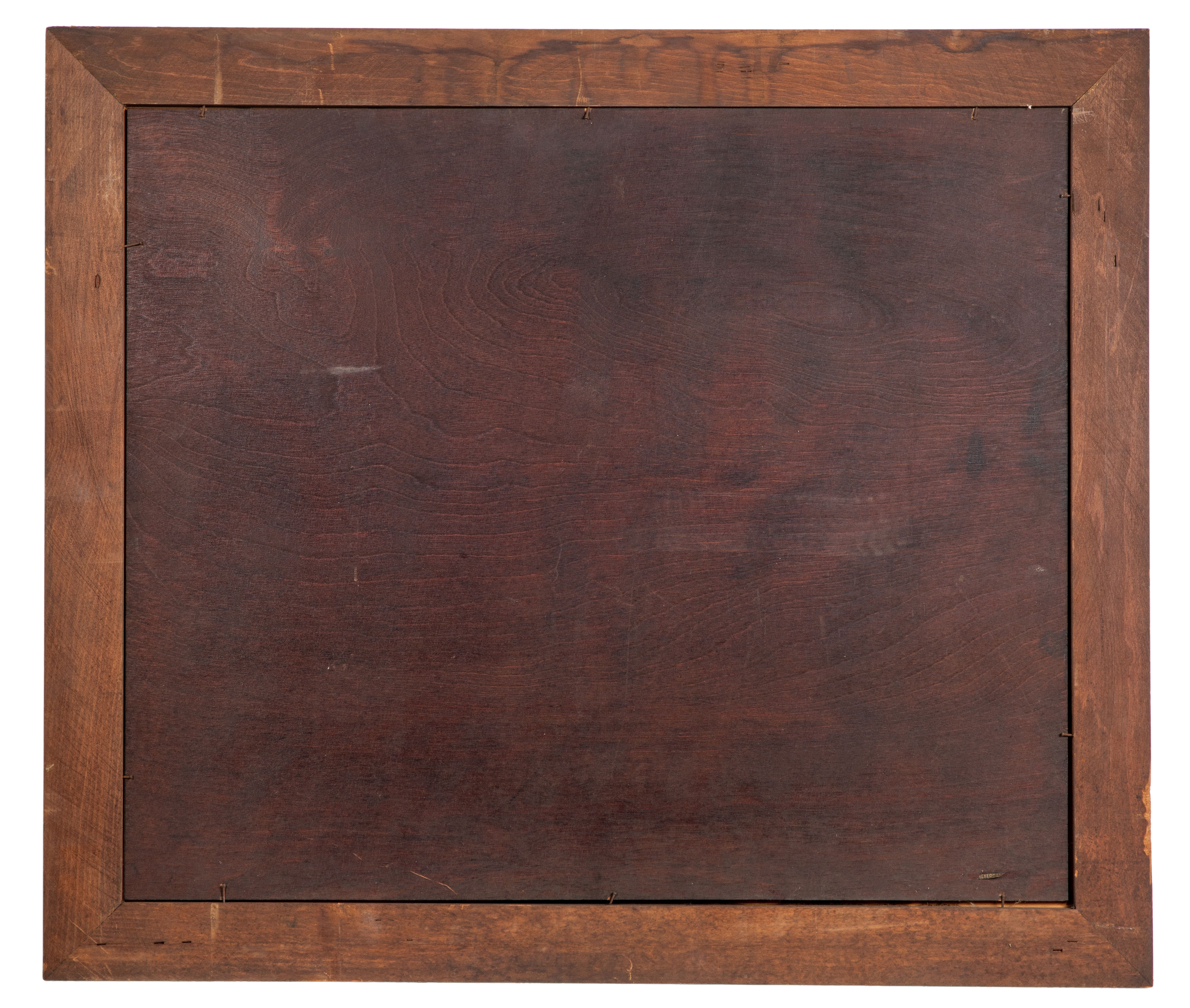 Condition: dirt accumulation, minor spots of paint loss, wood scratched lower left, frame having small chips throughout and large chips lower left, part of paper label missing