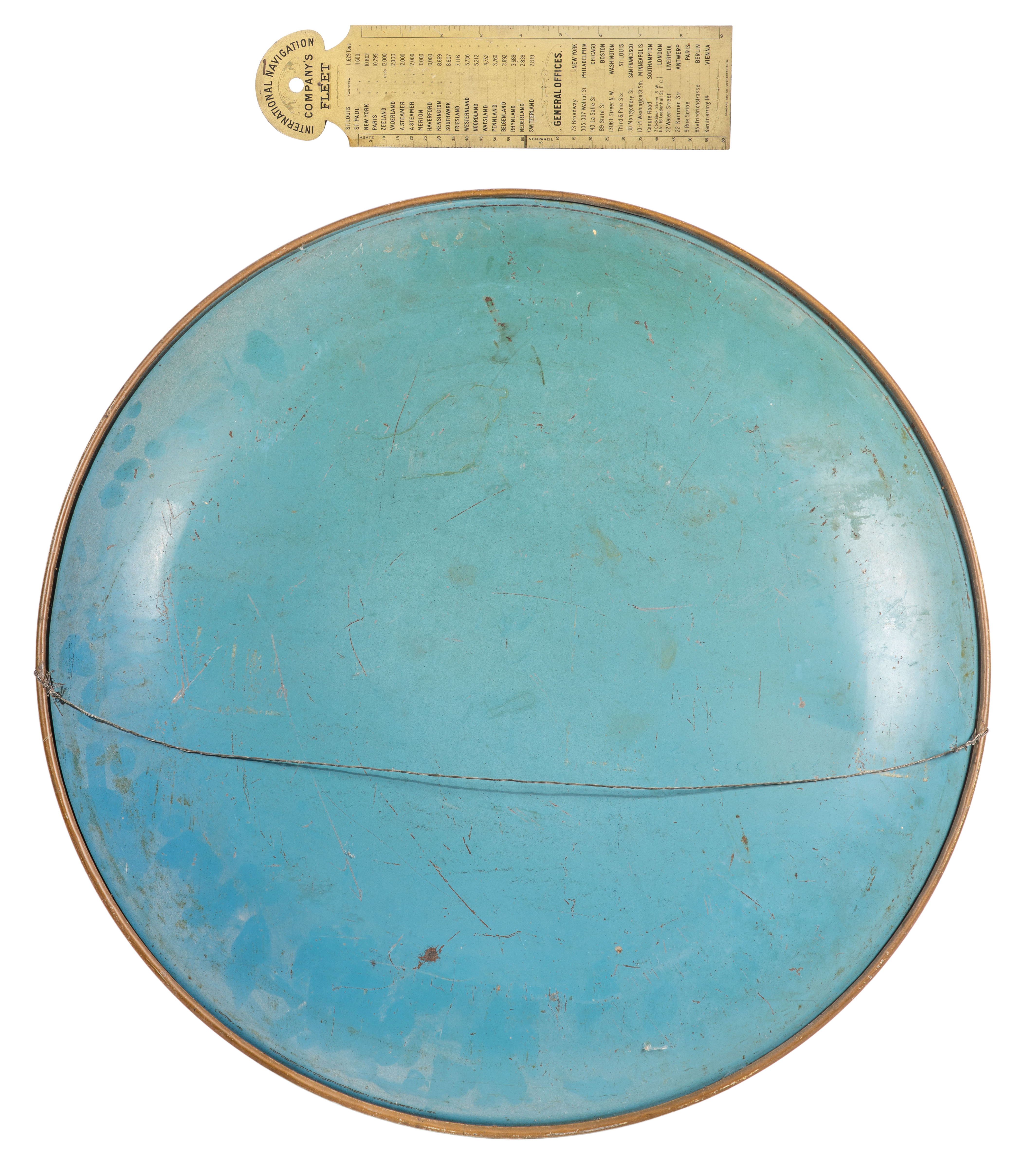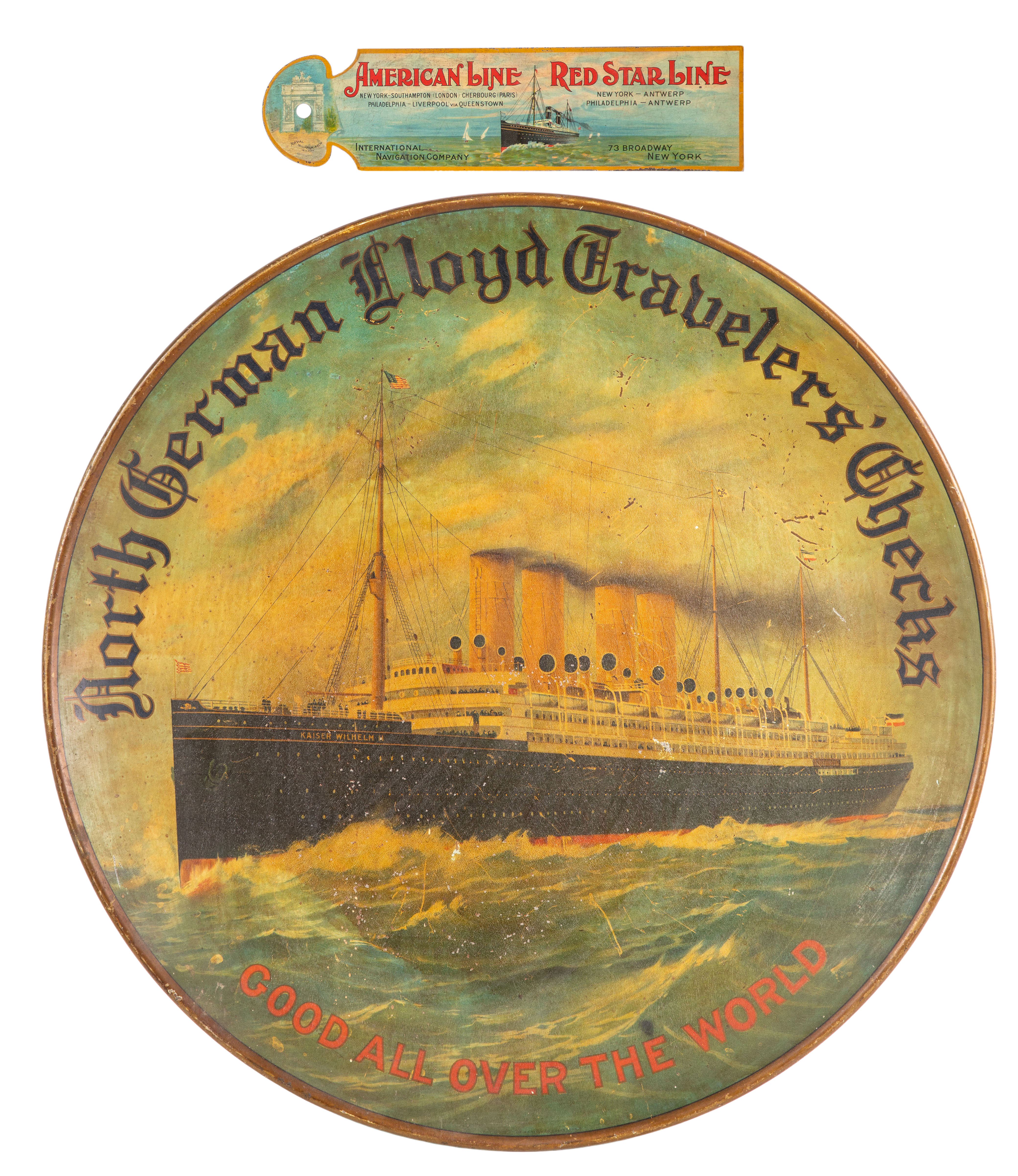 (2) total items, both having pictorial color lithographed tin decoration including the North German Lloyd Travelers Checks ‘The Kaiser Wilhelm II at Sea’ printed by H. D. Sears; together with an International Navigation Company’s American Line / Red Star Line 2-sided lithographed tin luggage tag shaped informational promotion printed by Standard Advertising Company