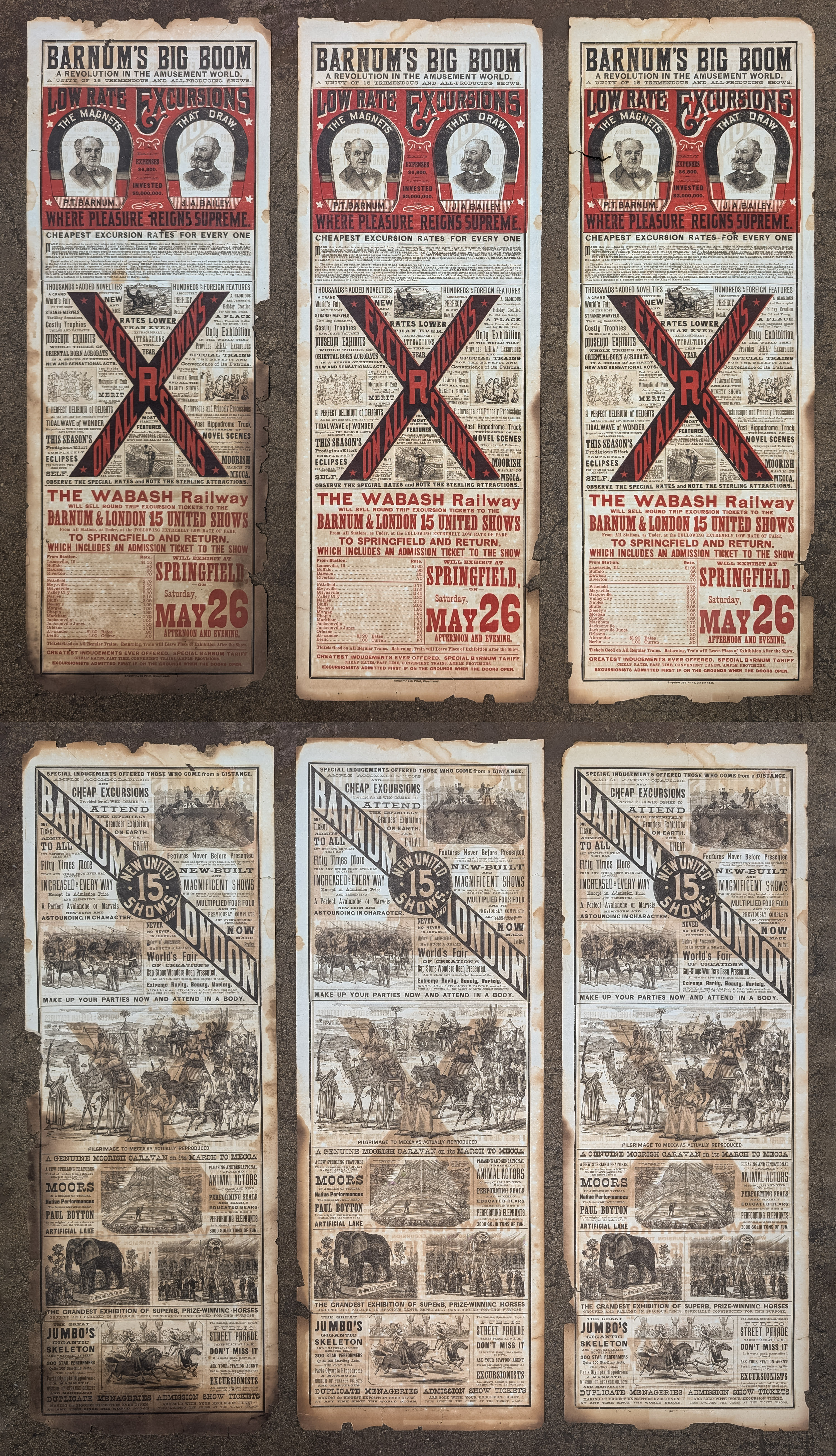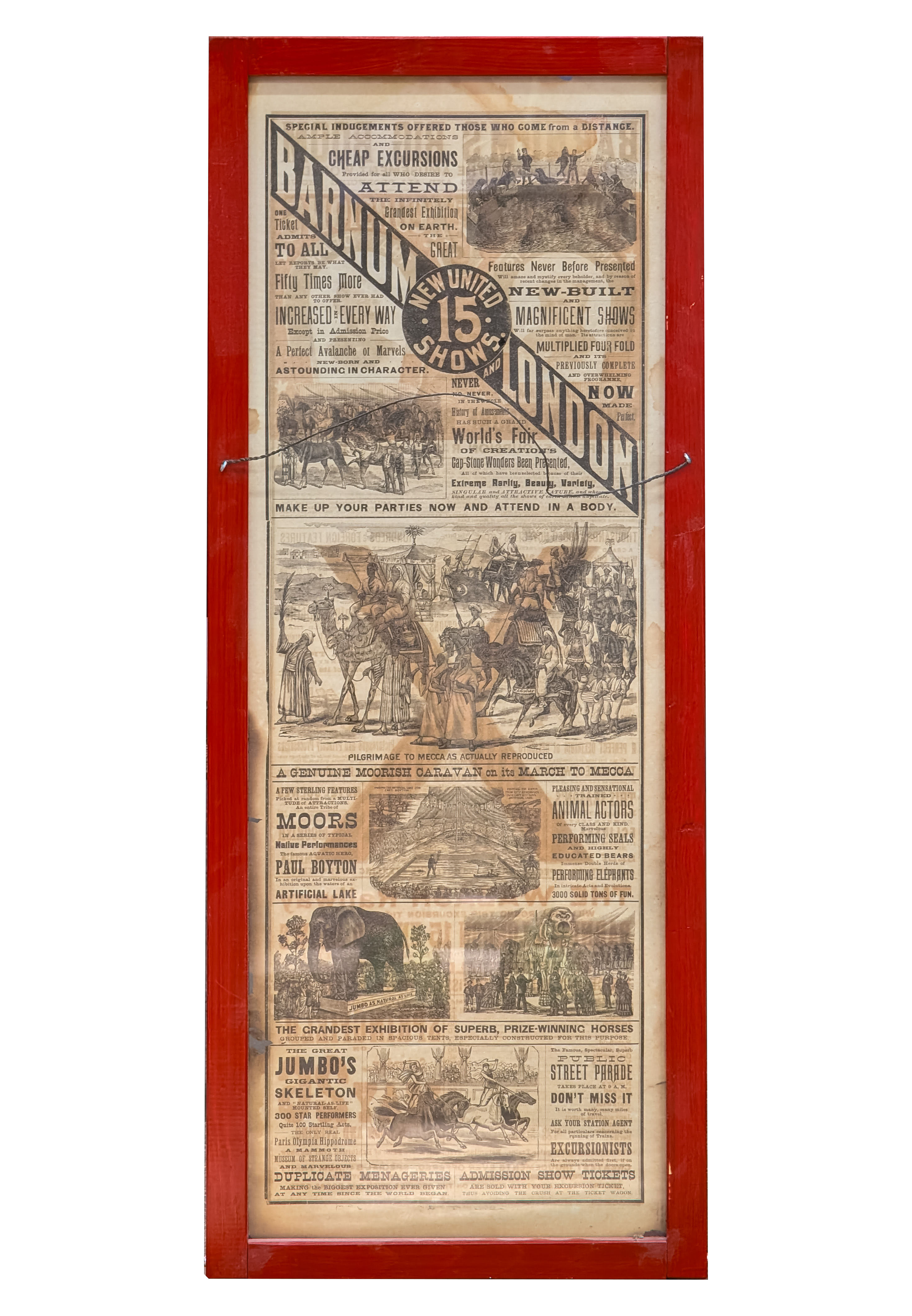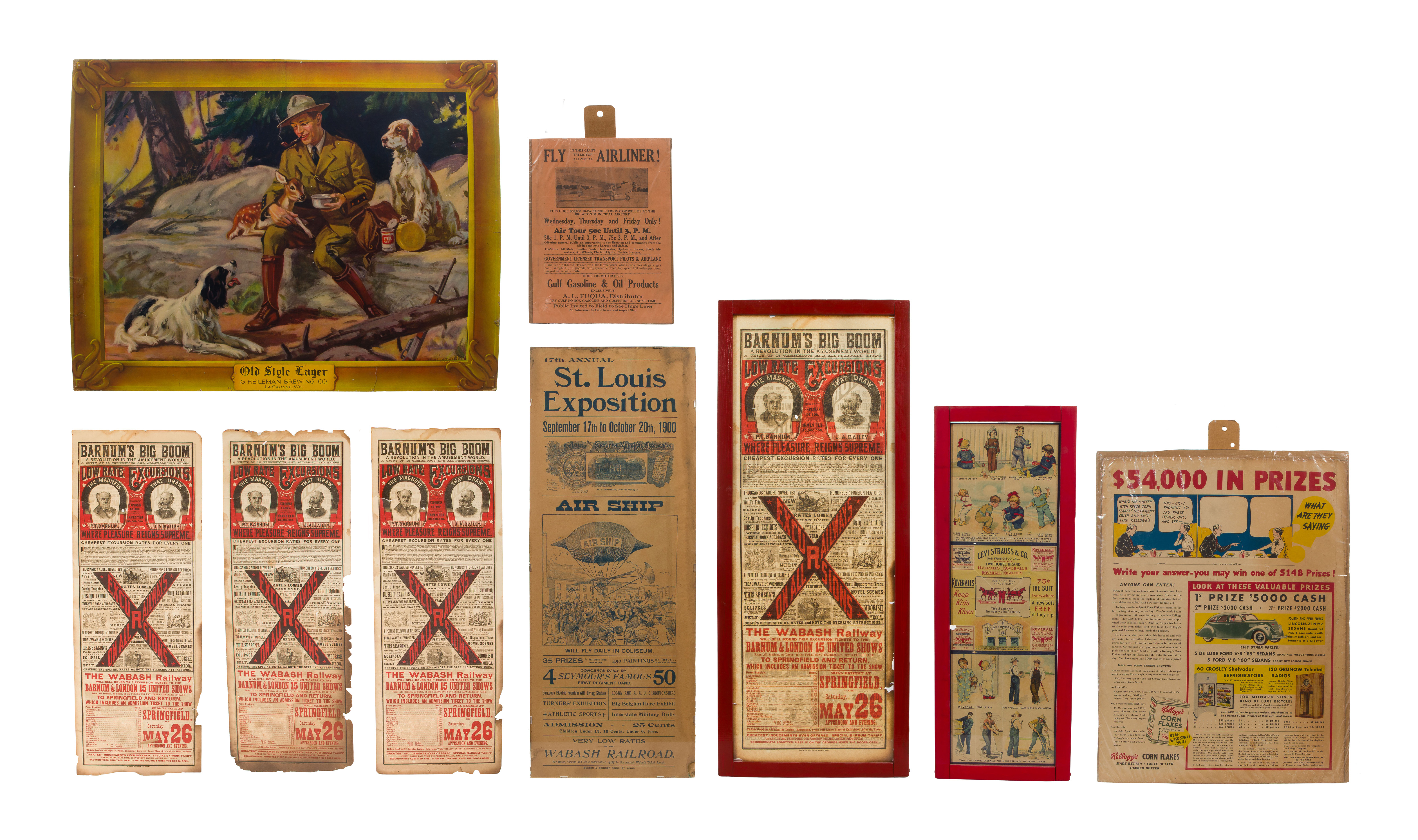 (9) items including an Old Style Lager G. Heileman Brewing Co. cardboard sign, a framed Levi Strauss & Co. San Francisco, a 1900 17th Annual St. Louis Exposition poster behind glass, (4) Barnum’s Big Boom May 26 posters (one framed behind glass), an airplane advertisement and a Kellogg advertisement