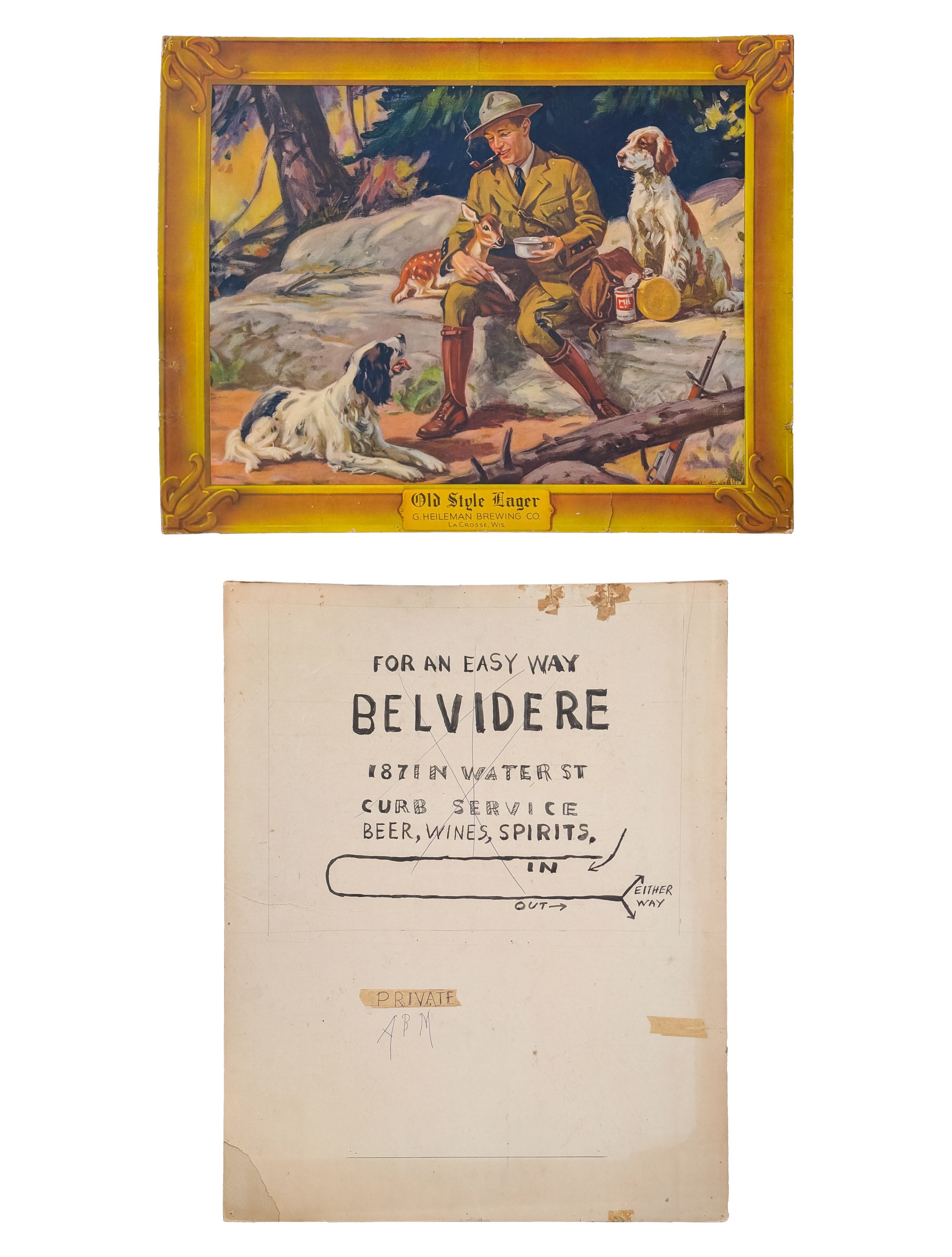 Condition: all posters having water damage, tears and missing sections, Heileman having pinholes throughout and tears on the edges, exposition poster having chip to the glass, frame having chips