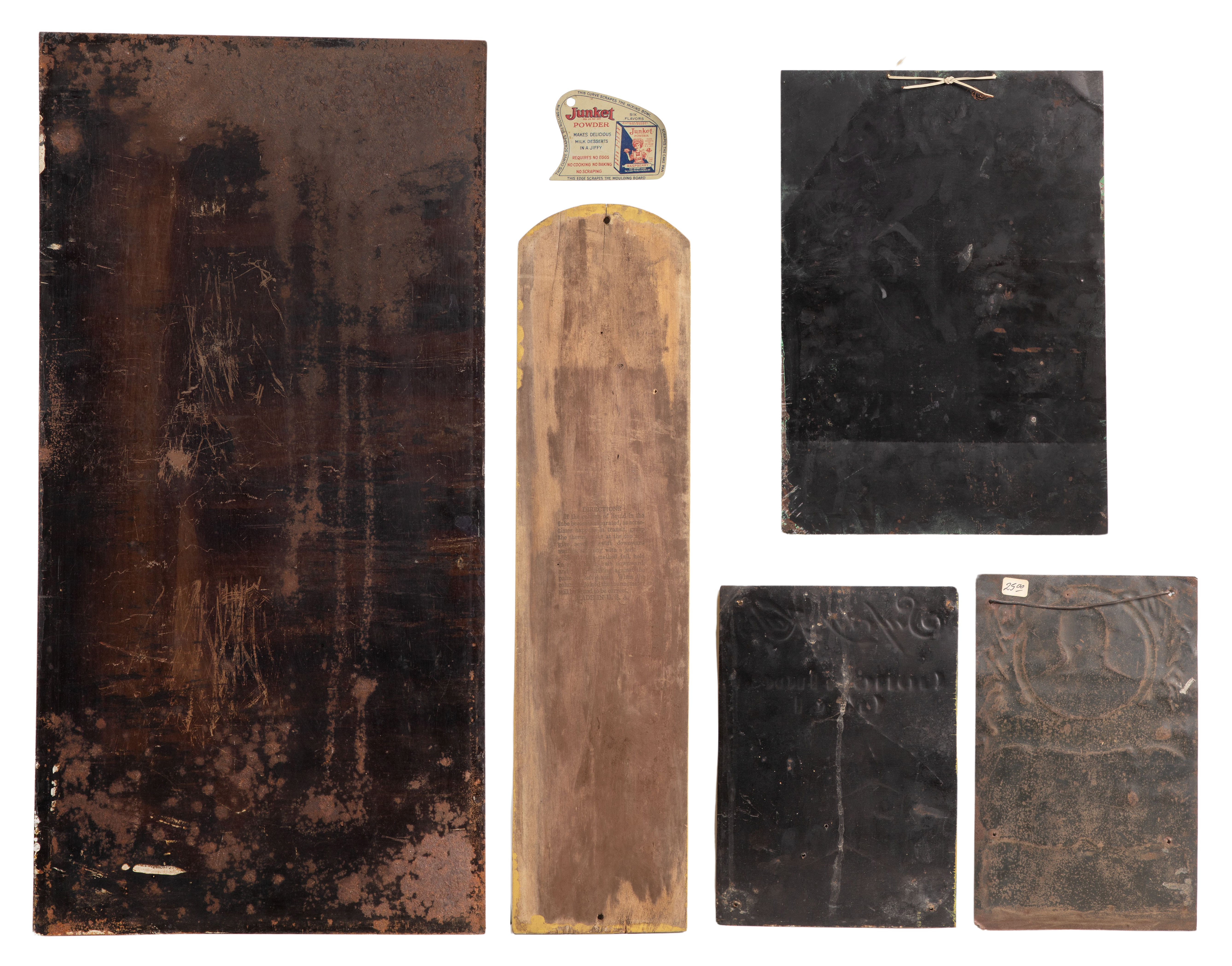 (6) total items, mostly lithographed tin, including an Ayer’s Hair Vigor, a Vegederma ‘Prevents Baldness / Cures Dandruff’, a Dr. W. B. Caldwell’s Syrup Pepsin and Laxative Compound, a Safety-Kaps Gonorrhea Gleet cure, as well as a painted wood Hick’s Capudine Liquid thermometer; together with a lithographed tin Junket Powder promotional kitchen pot and pan scraper