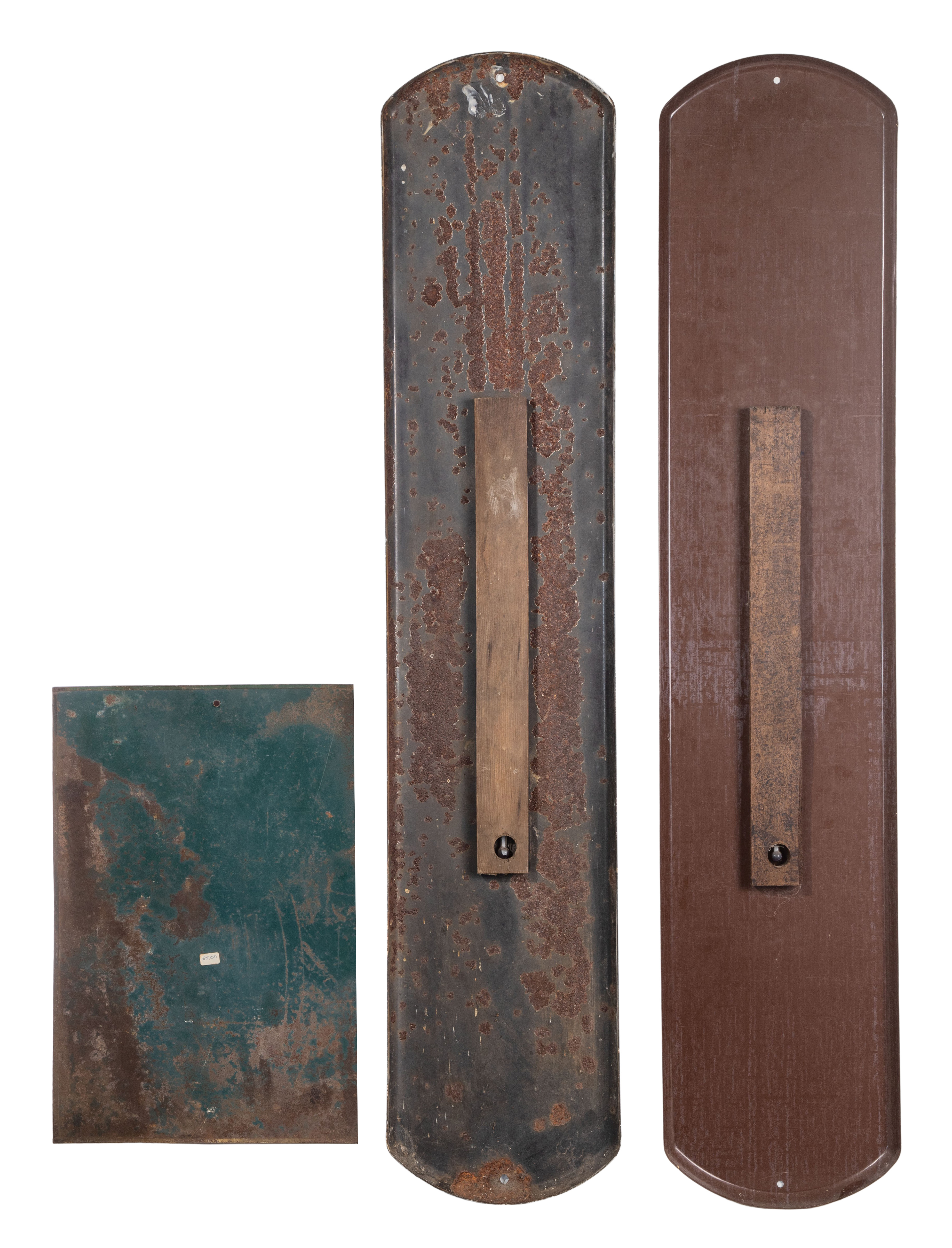overall light to moderate wear consistent with normal use, both thermometers having intact glass, both having light edge wear and oxidation, a thermometer having chips to enamel at mounting holes, the Union Leader having scratches, scrapes, wear near edges and oxidation