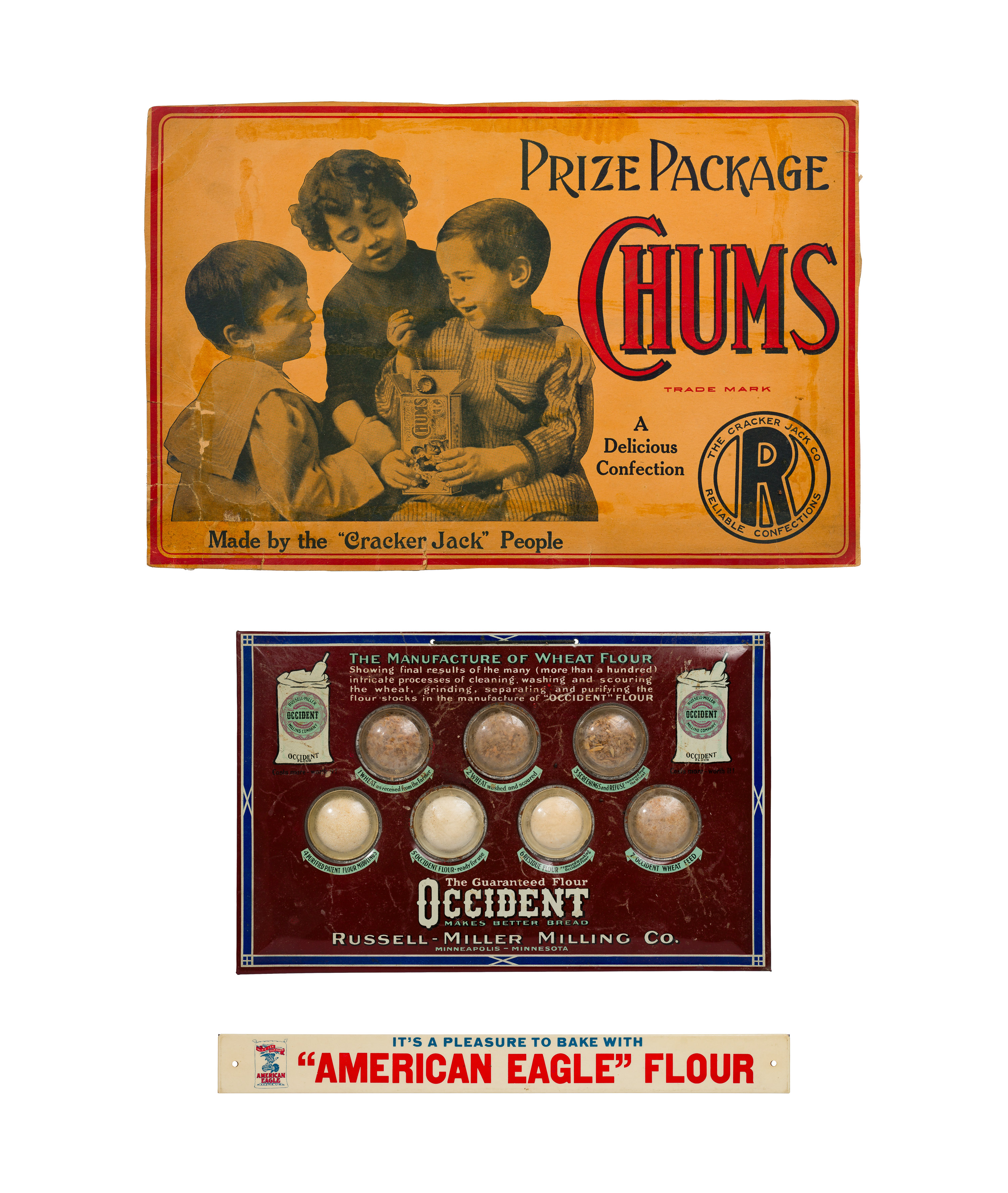 (3) items including an Occident wheat flour store display having original capsule, a Cracker Jack Chums candy cardboard display / box-top and an American Eagle flour metal display strip