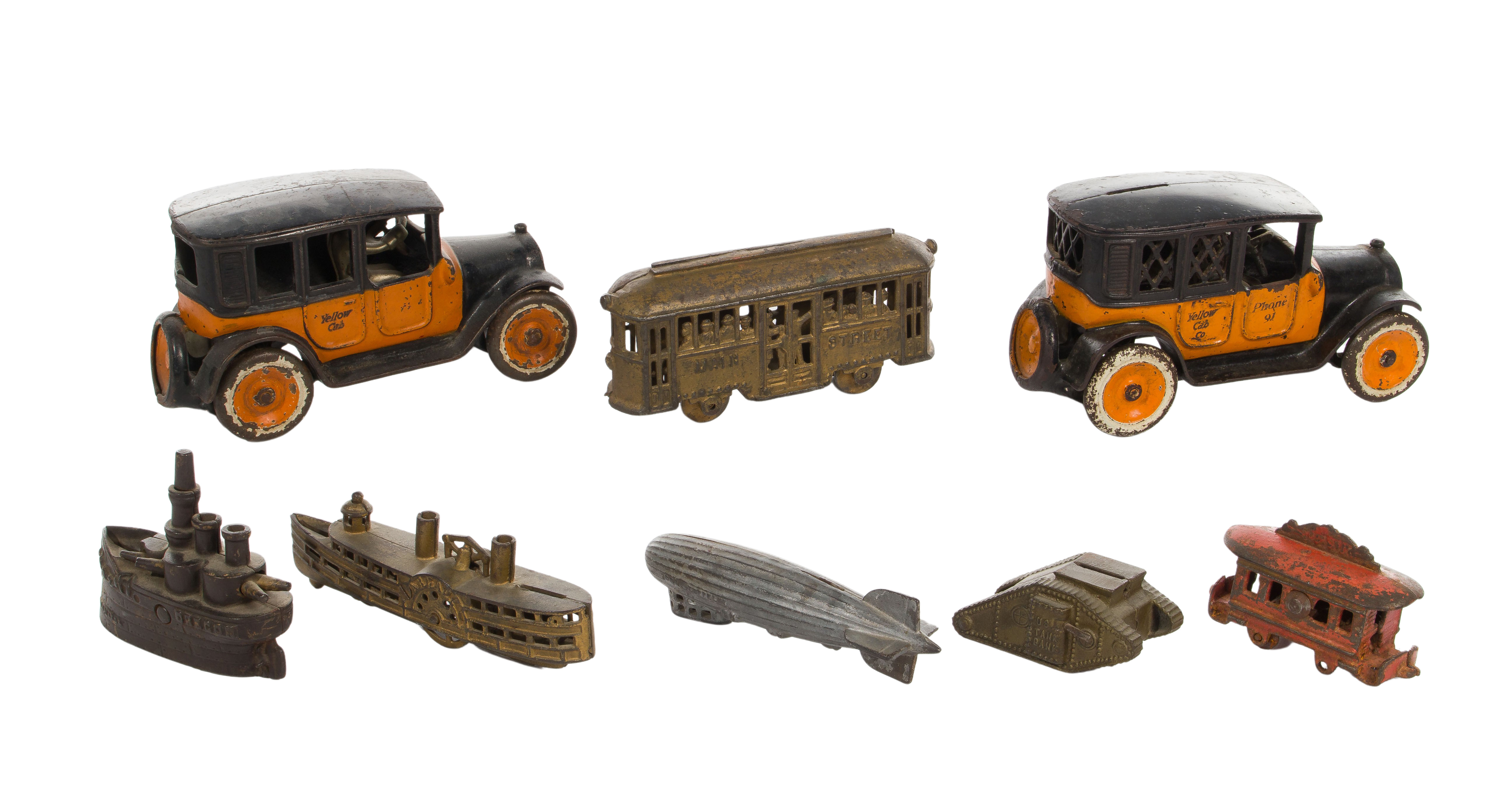 (8) total items including a Yellow Cab having decals applied to passenger doors over orange-painted surface, coin slot in roof, a Graf Zeppelin by A. C. Williams, ‘The Oregon’ battleship, ‘Main Street Trolley’ by A. C. Williams, a World War I tank, a trolley car and a steamboat; together with a cast iron Yellow Cab toy