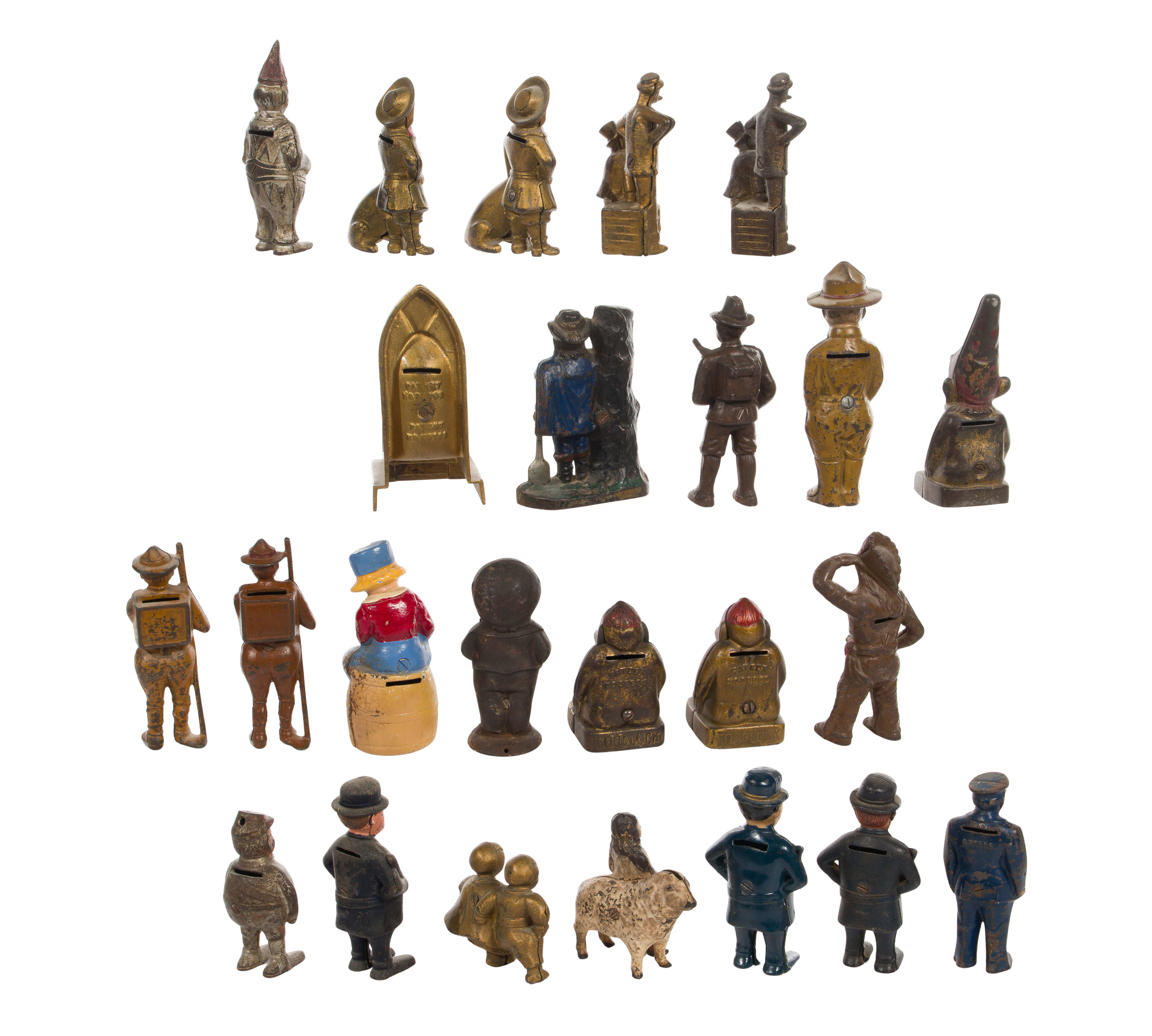(24) items of various shapes, sizes and motifs including a World War I dough-boy, a Buster Brown, a Mary and her lamb, a Billiken, a Dutch boy, a policeman and gnomes