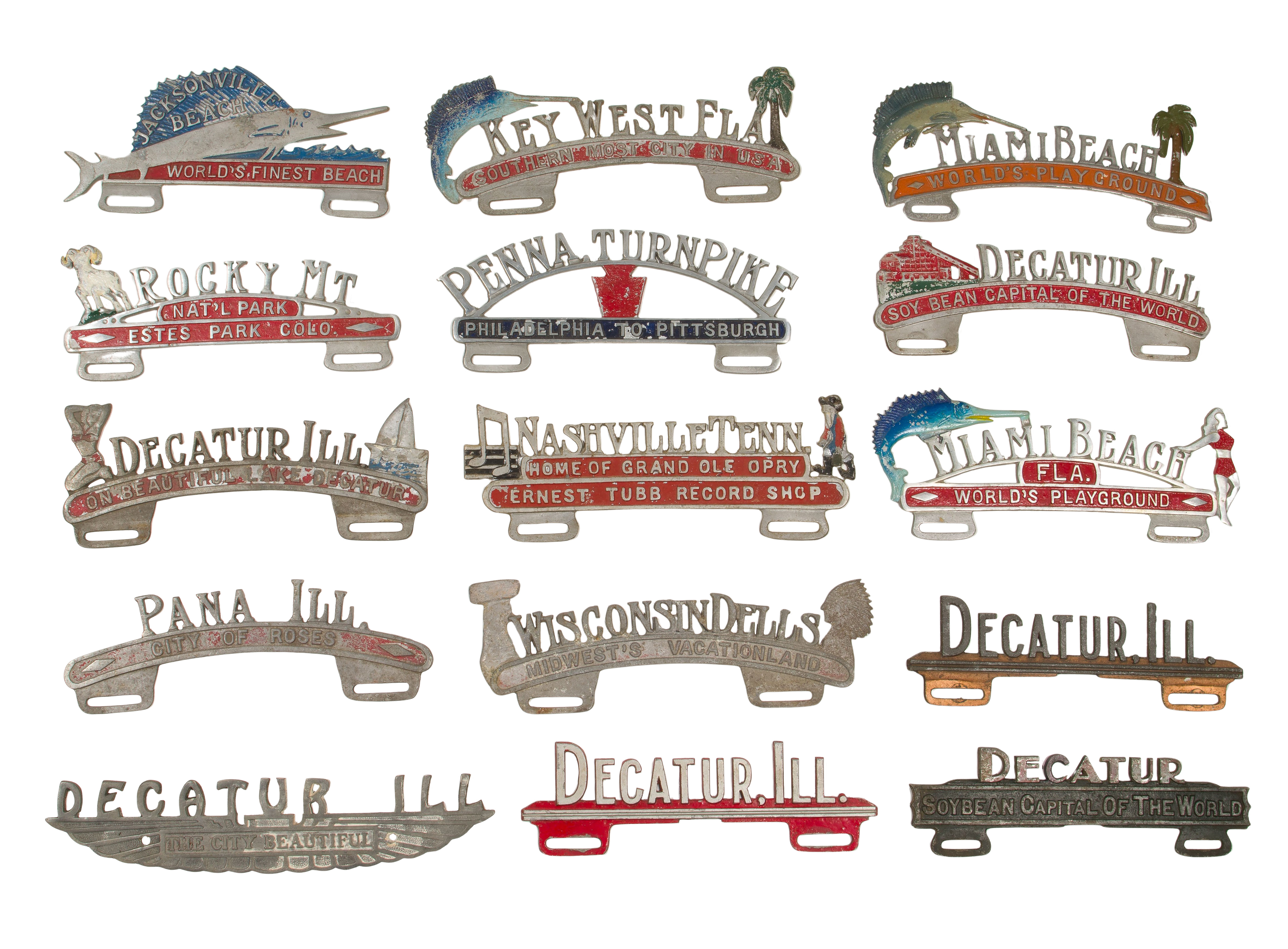 (15) items, all retaining remnants of painted decoration, promoting American locations
