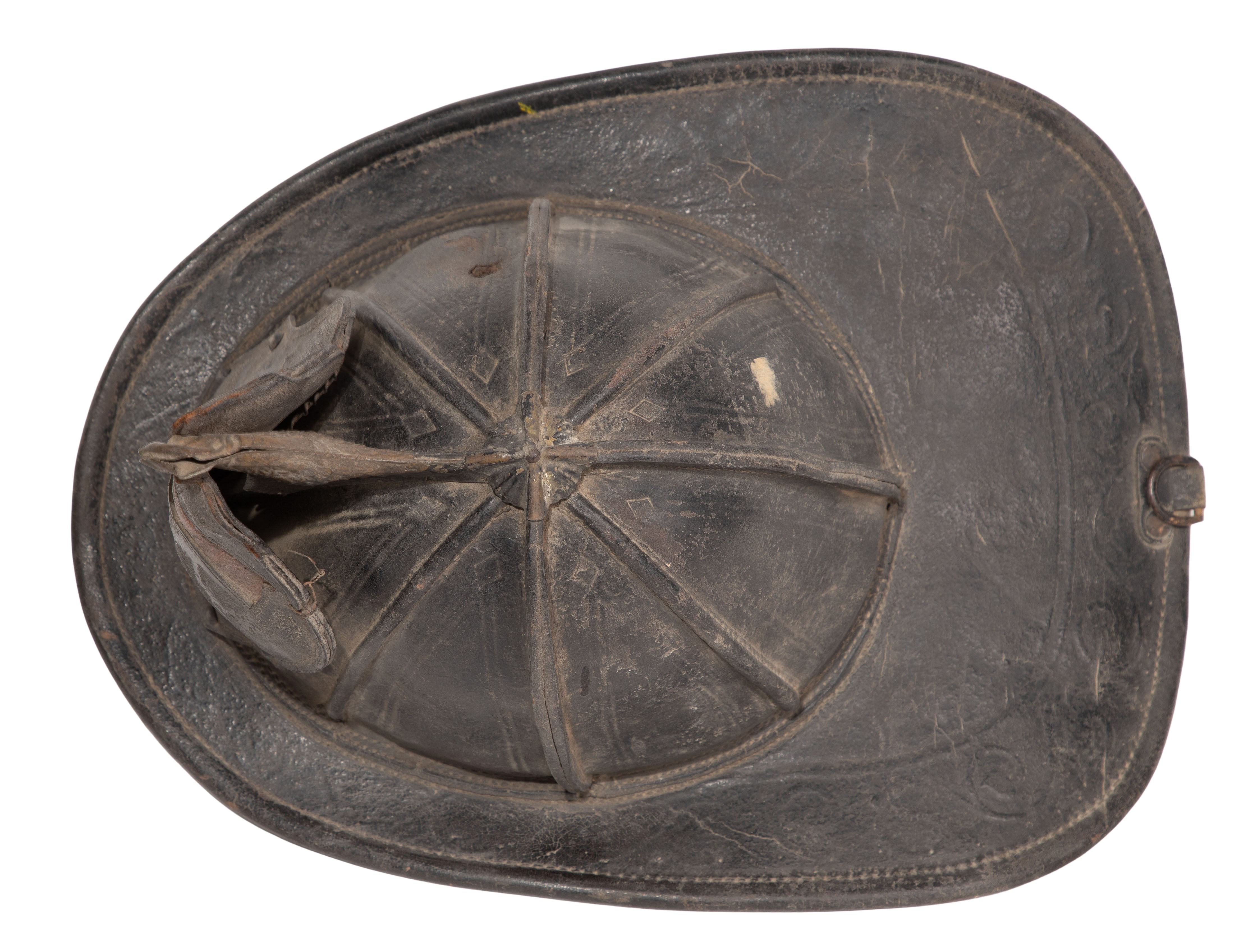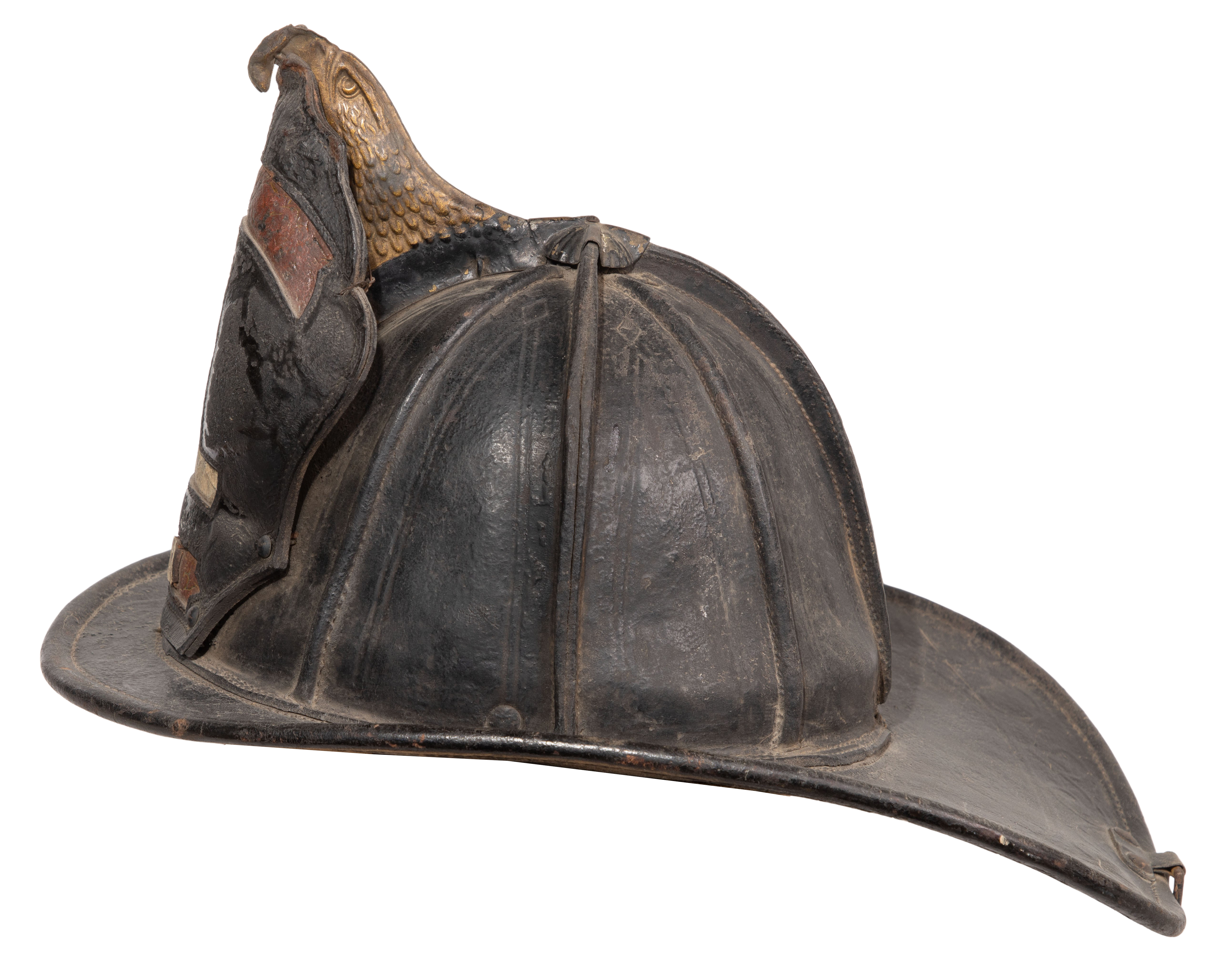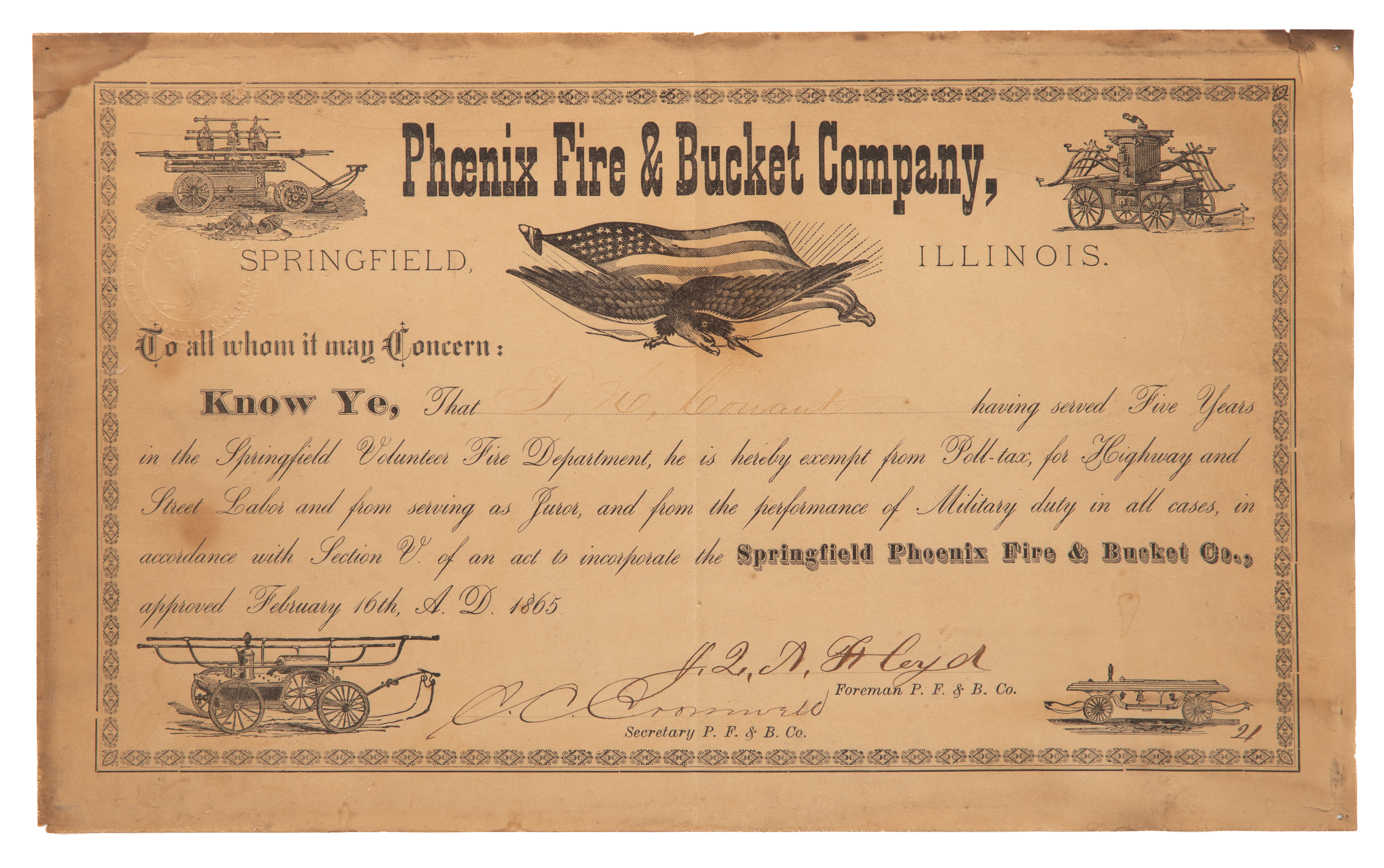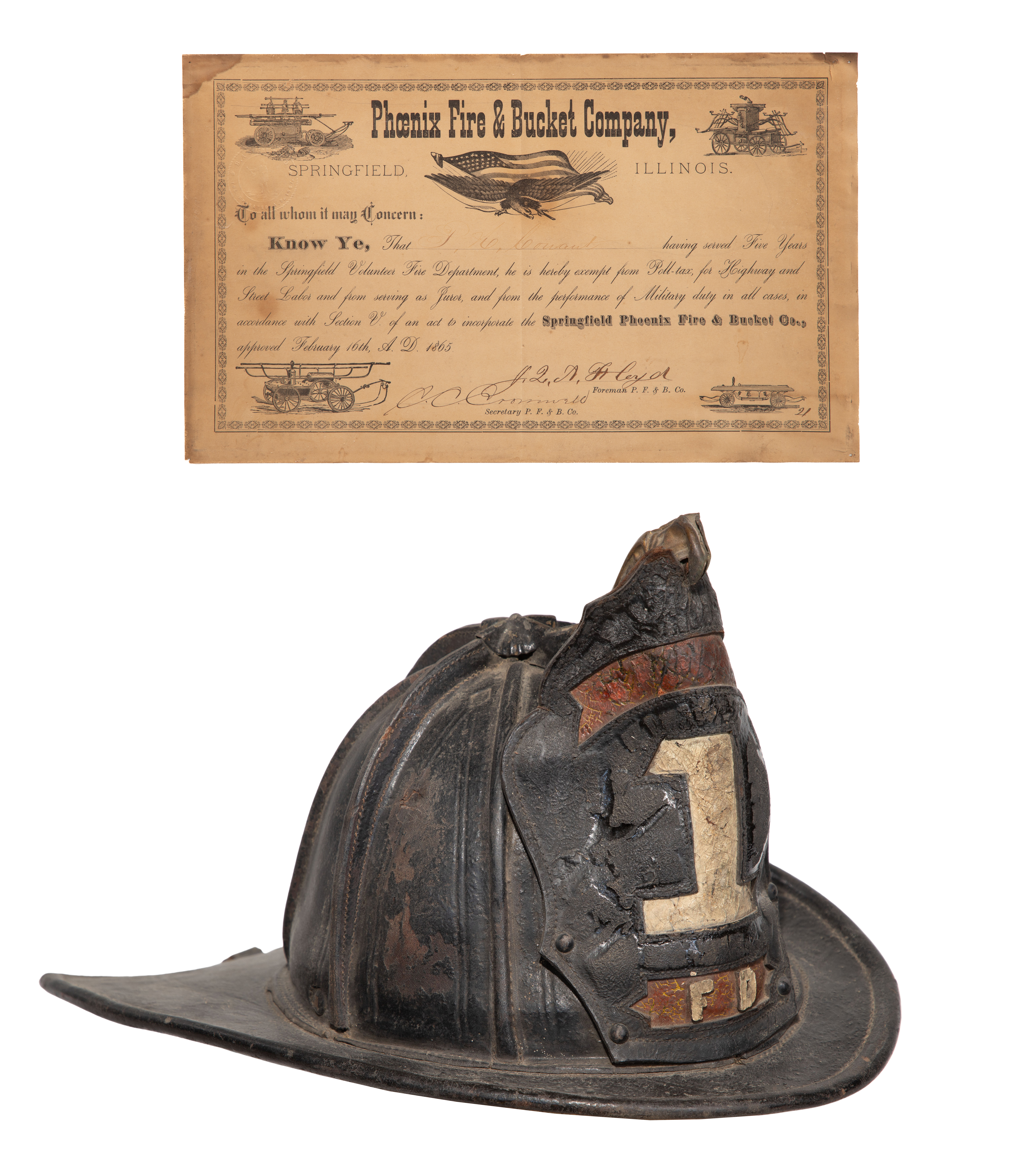 (2) total items including a helmet having a brass eagle front holder finial, embossed vine motif around upper surface of rear brim, retaining felt liner, no maker mark; together with an 1865 Springfield, Illinois Phoenix Fire & Bucket Company document acknowledging volunteer fire department service