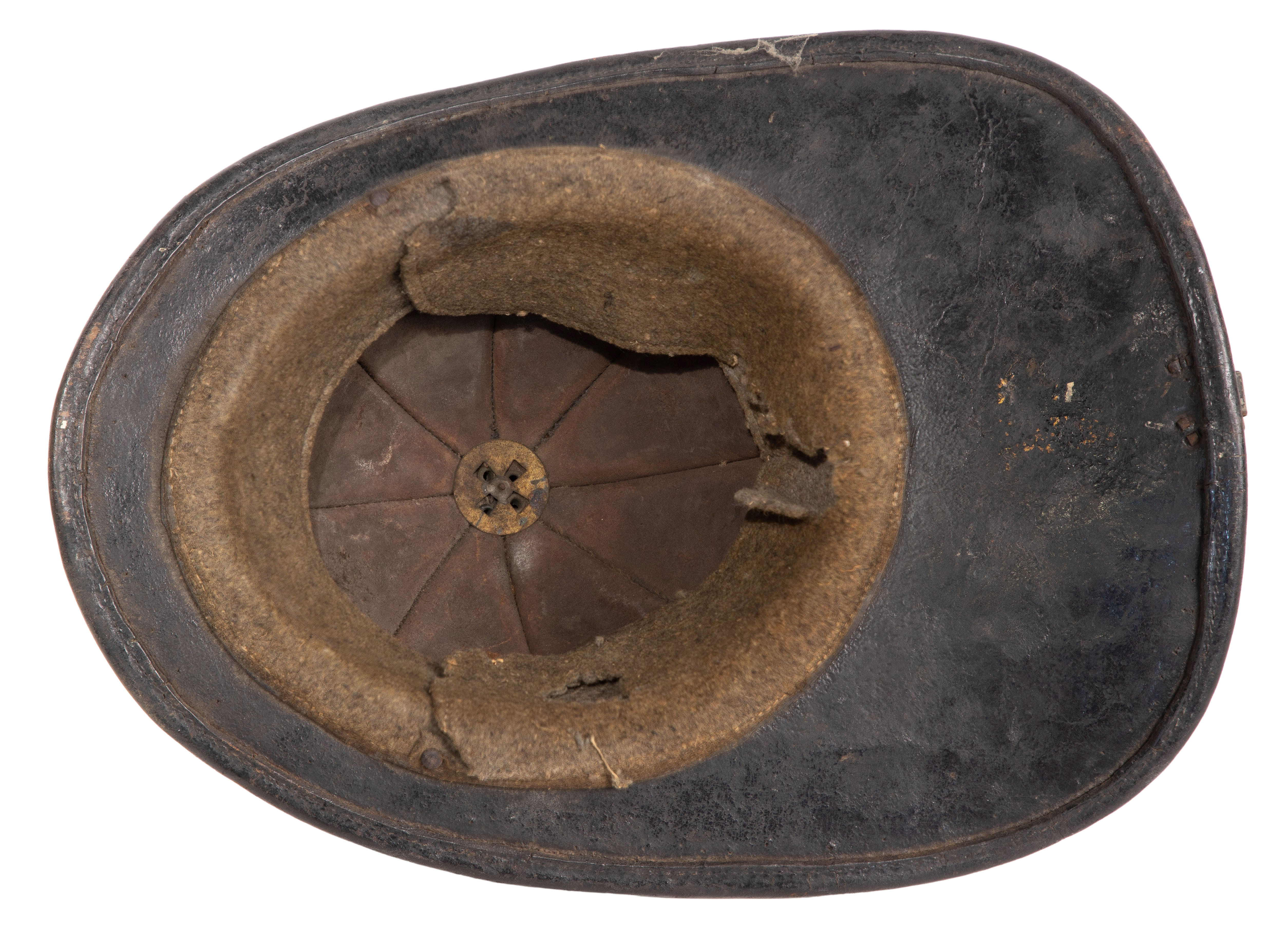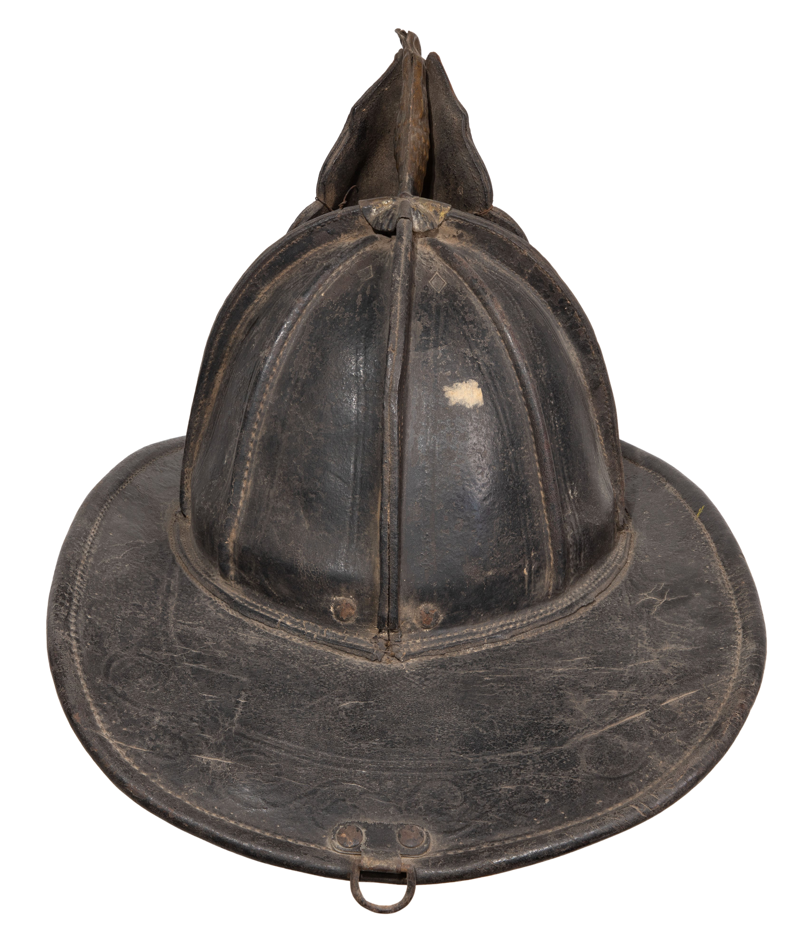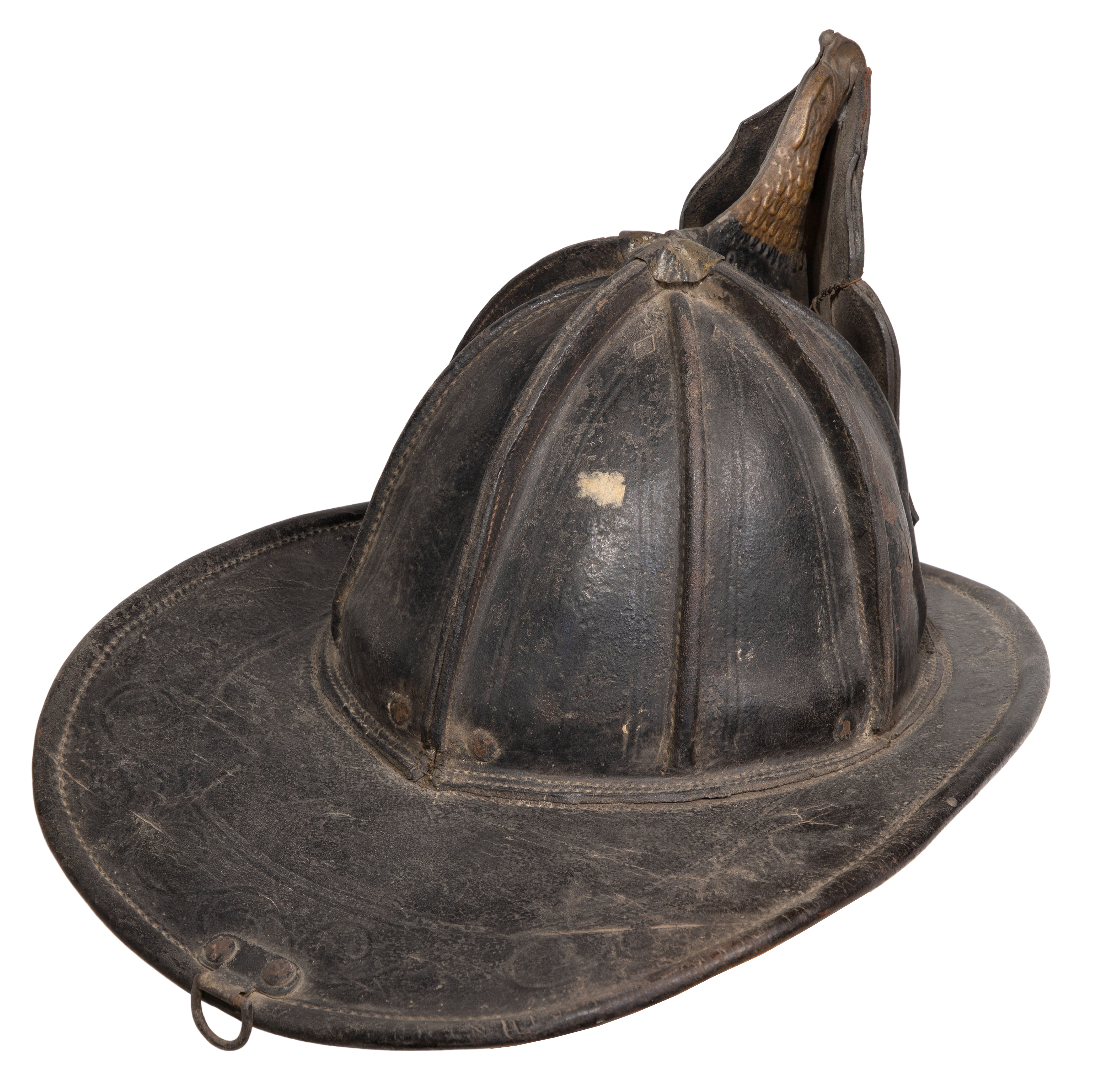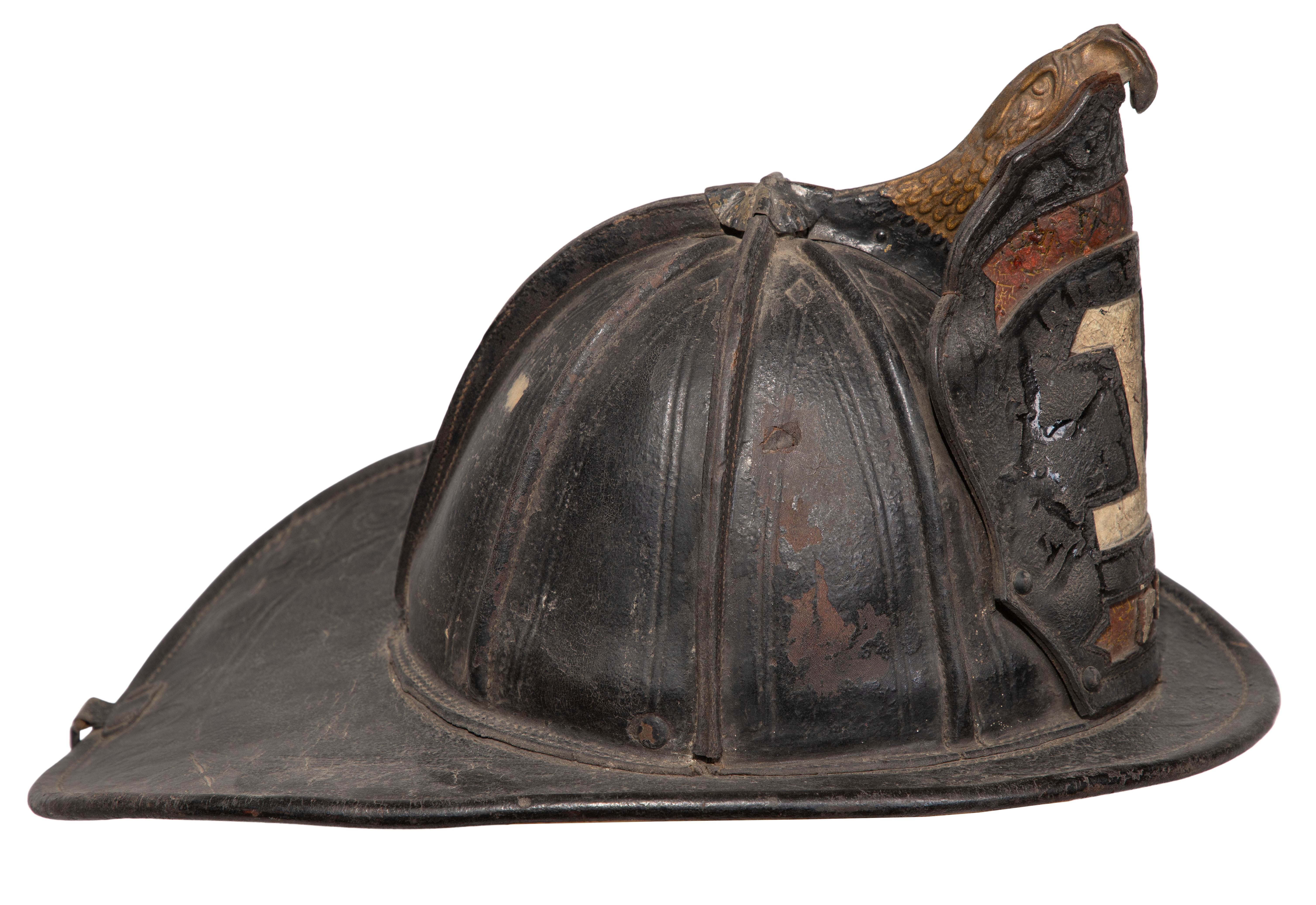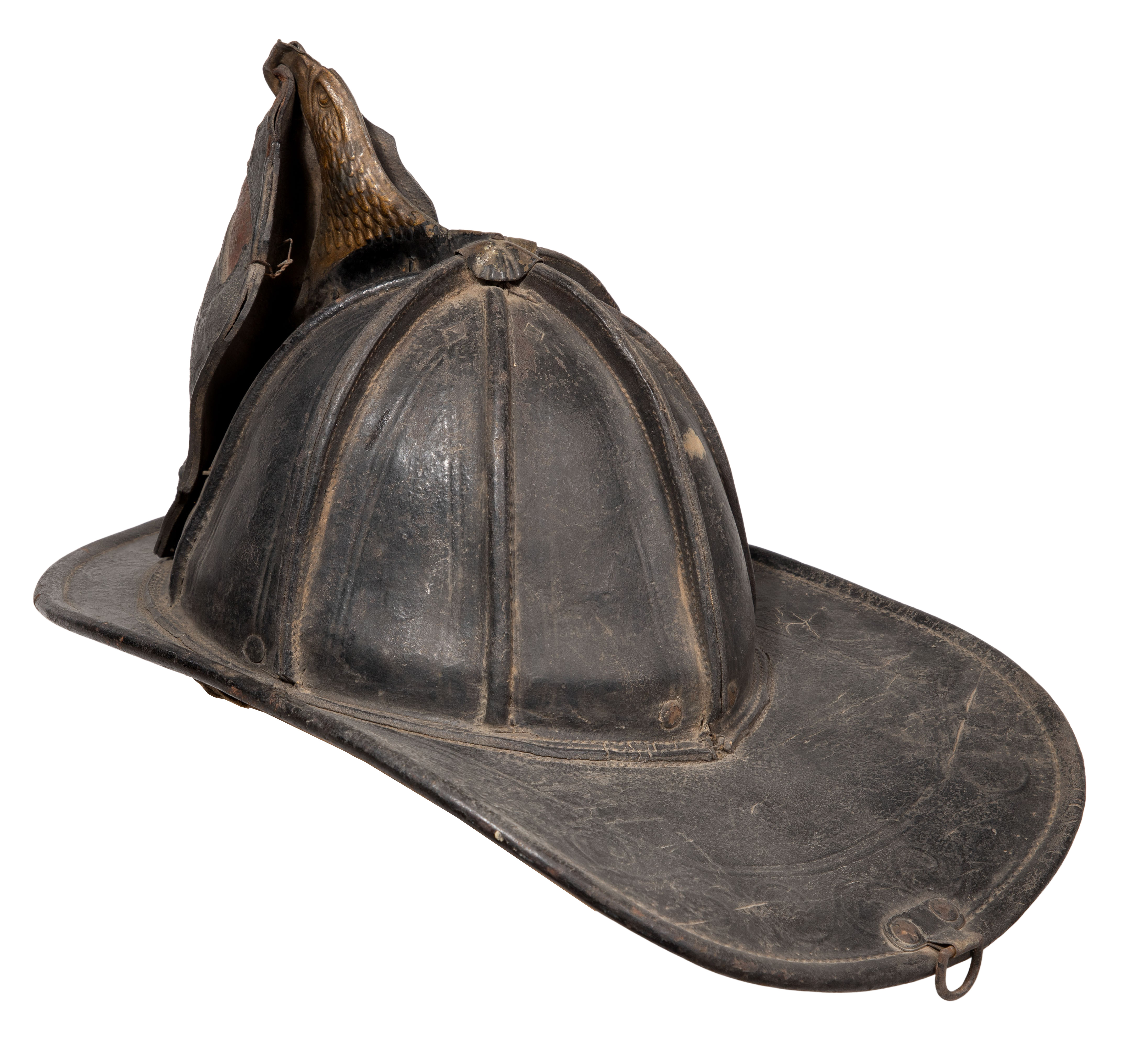 (2) total items including a helmet having a brass eagle front holder finial, embossed vine motif around upper surface of rear brim, retaining felt liner, no maker mark; together with an 1865 Springfield, Illinois Phoenix Fire & Bucket Company document acknowledging volunteer fire department service
