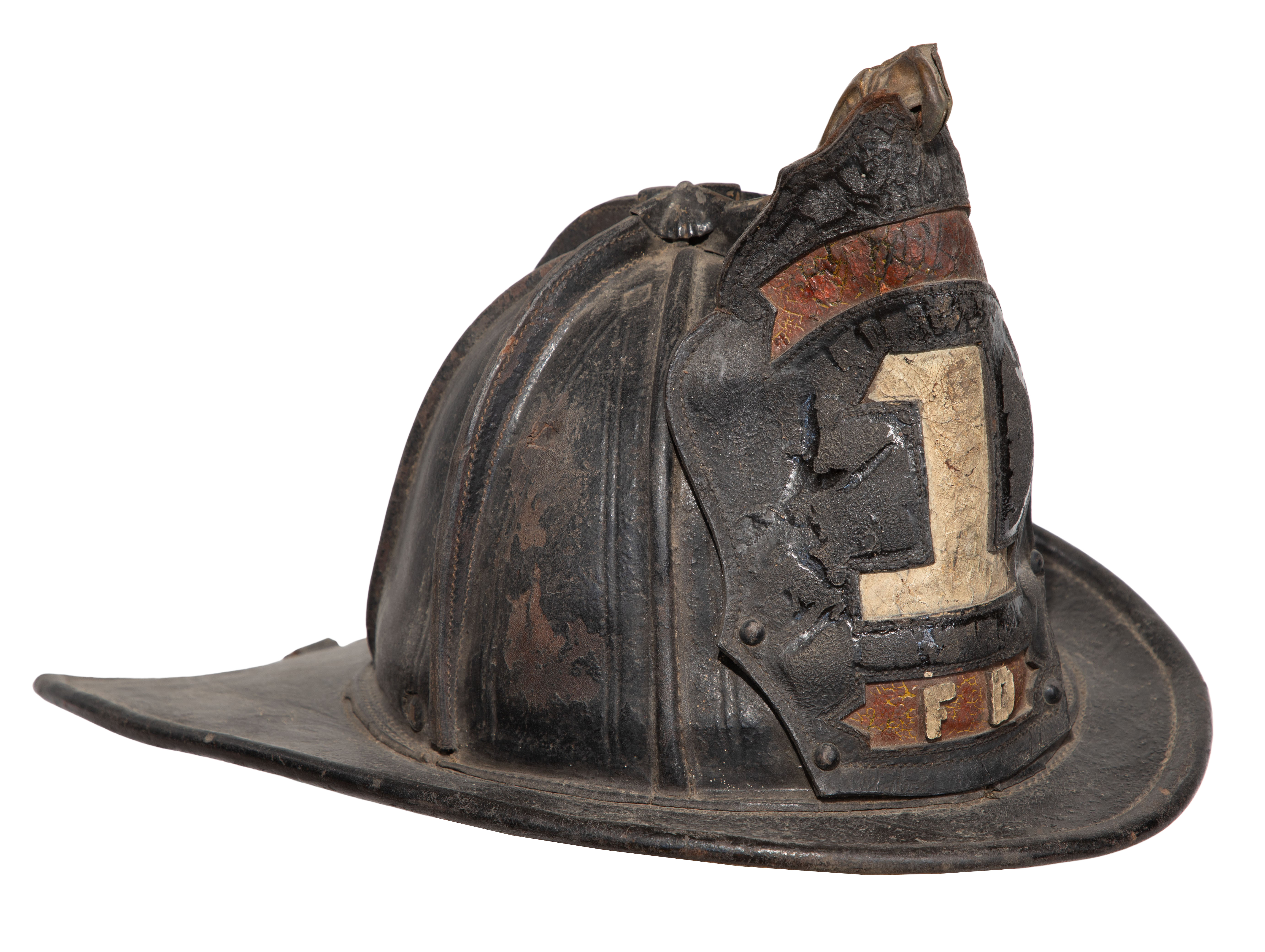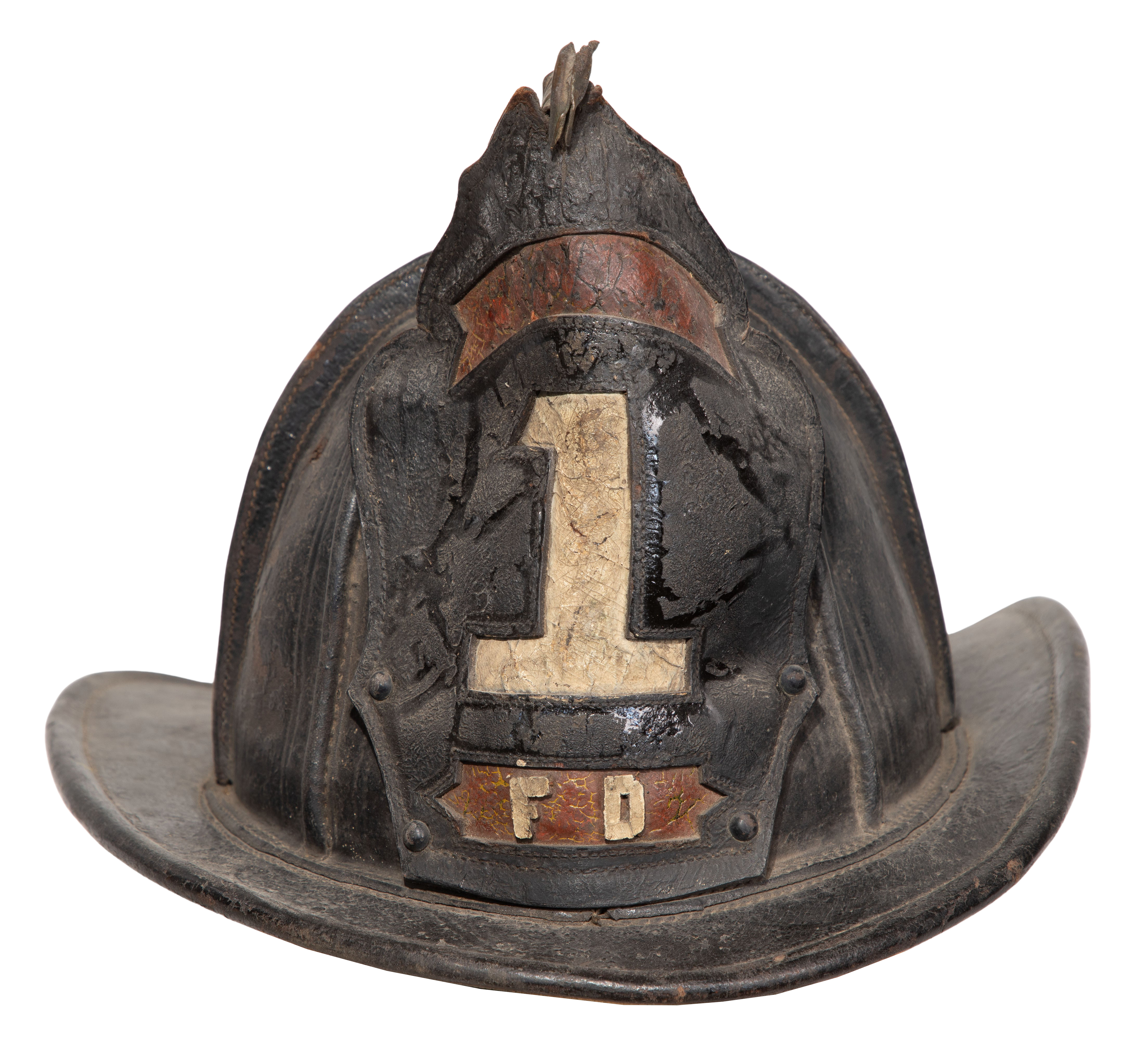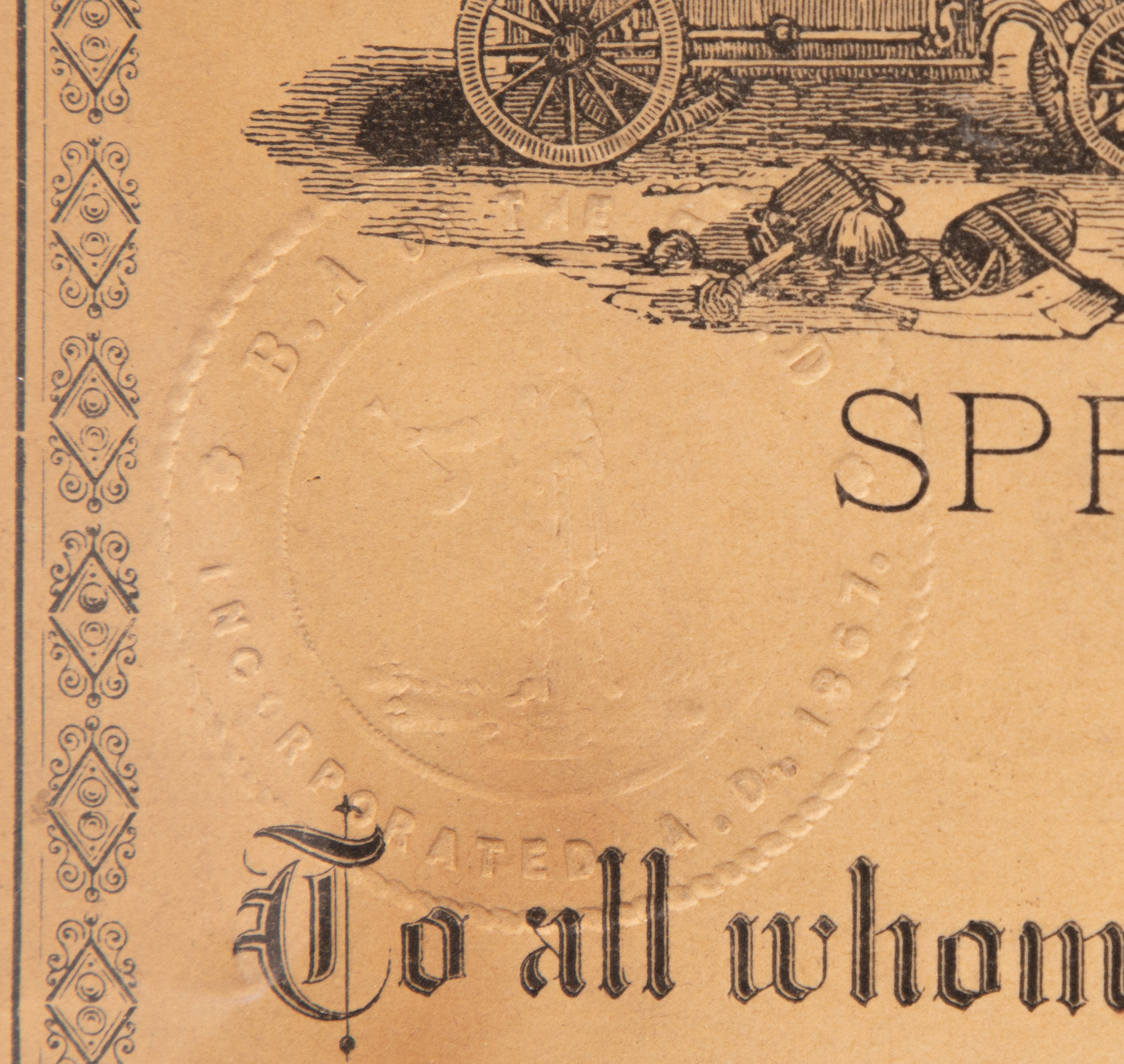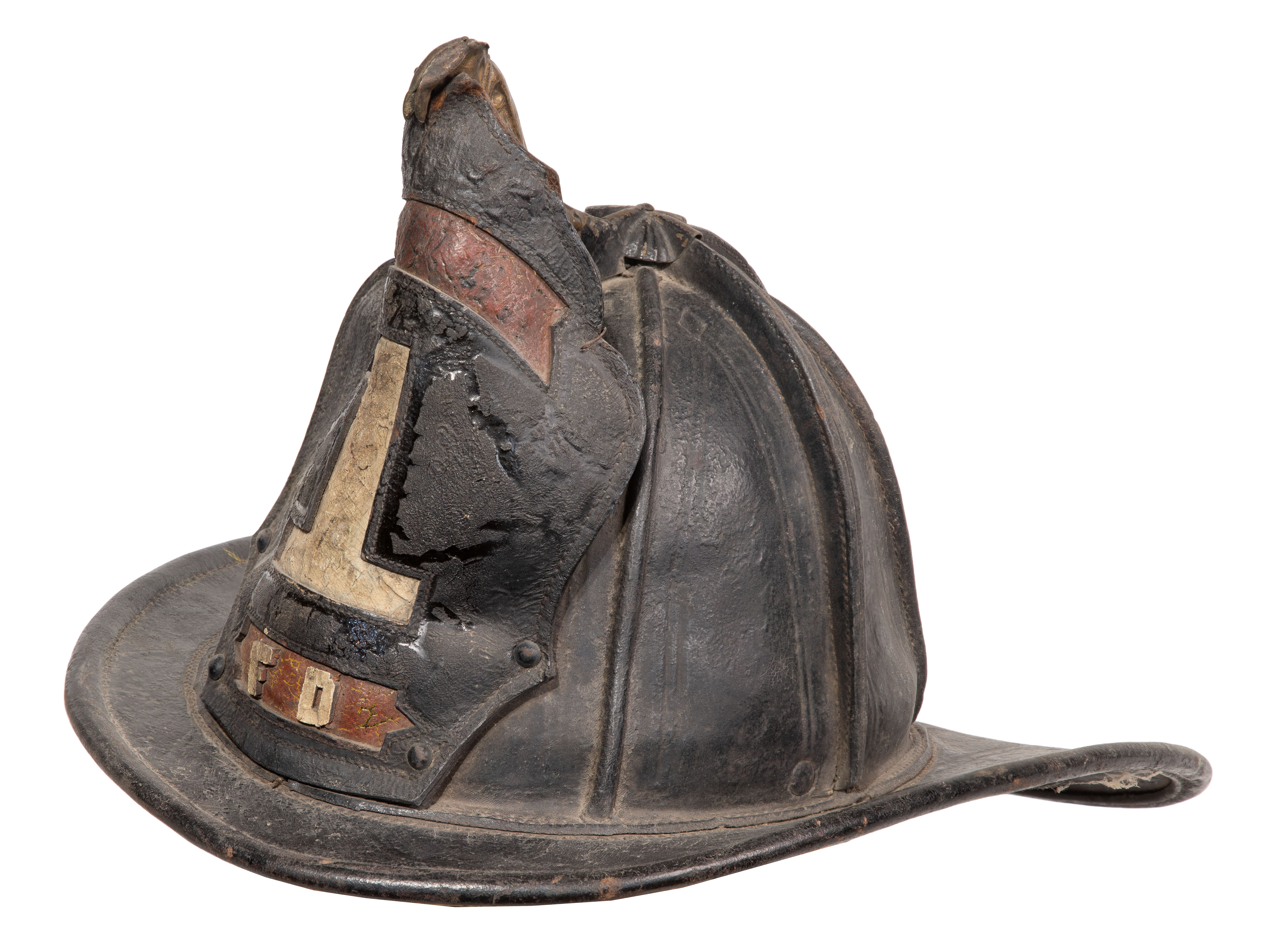 (2) total items including a helmet having a brass eagle front holder finial, embossed vine motif around upper surface of rear brim, retaining felt liner, no maker mark; together with an 1865 Springfield, Illinois Phoenix Fire & Bucket Company document acknowledging volunteer fire department service