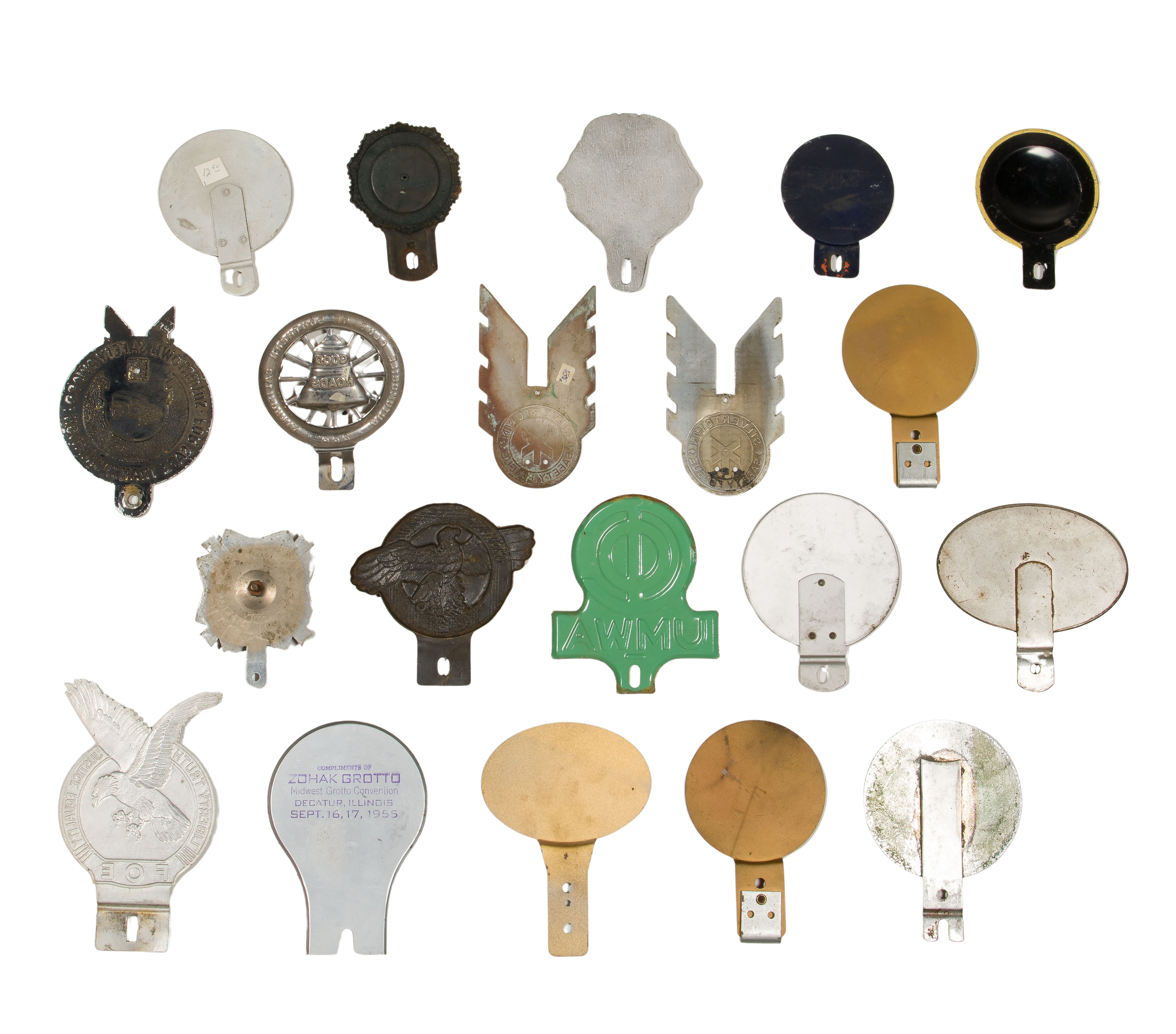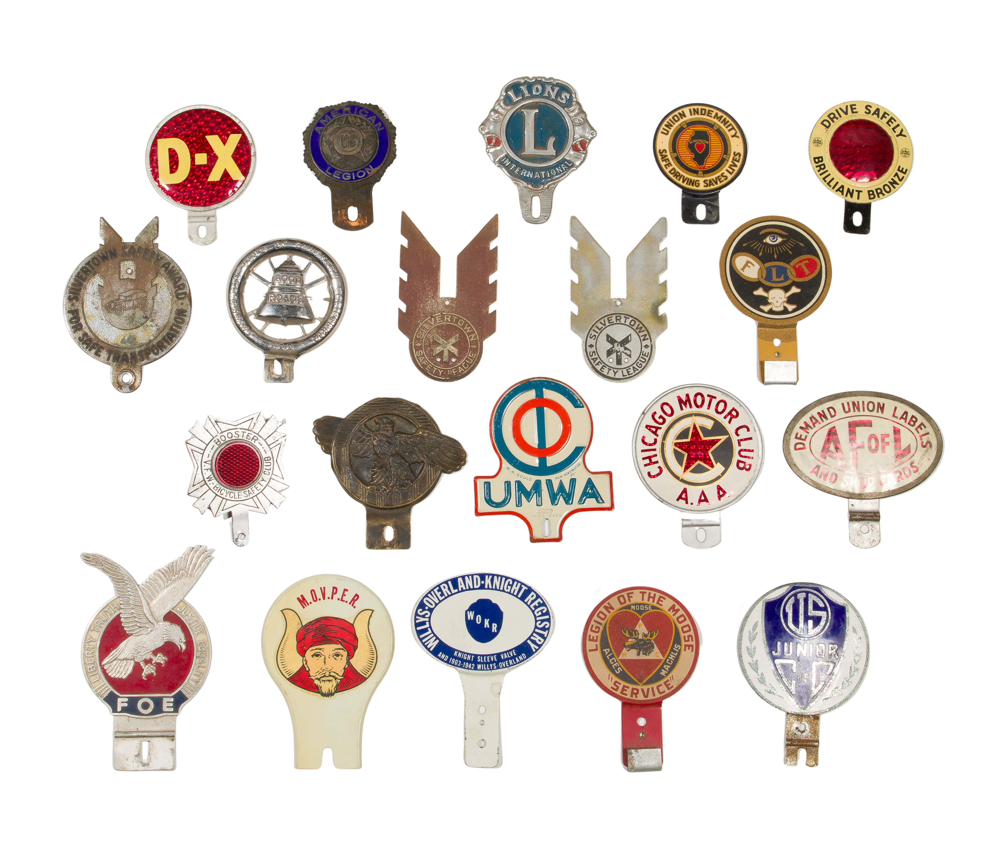 (20) items of various materials promoting fraternal, labor union and automotive safety organizations, including an Odd Fellows, a Mystic Order of Veiled Prophets, an aluminum Lions, a chromed steel Automobile Club of Southern California, as well as a bronze military ‘ruptured duck’, enameled bronze American Legion, a D-X motor oil, AF of L and an AAA having printed plastic over reflective surface