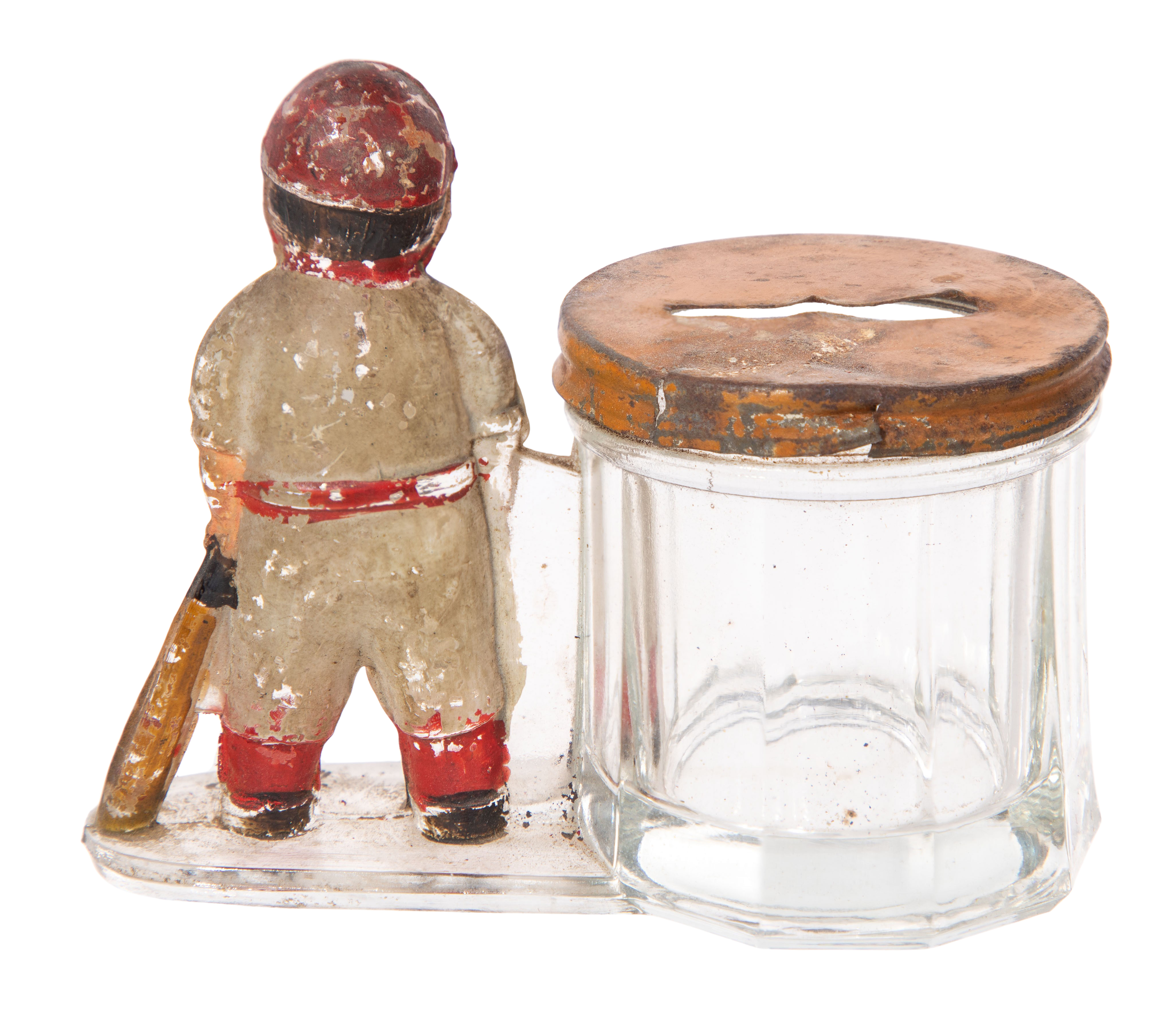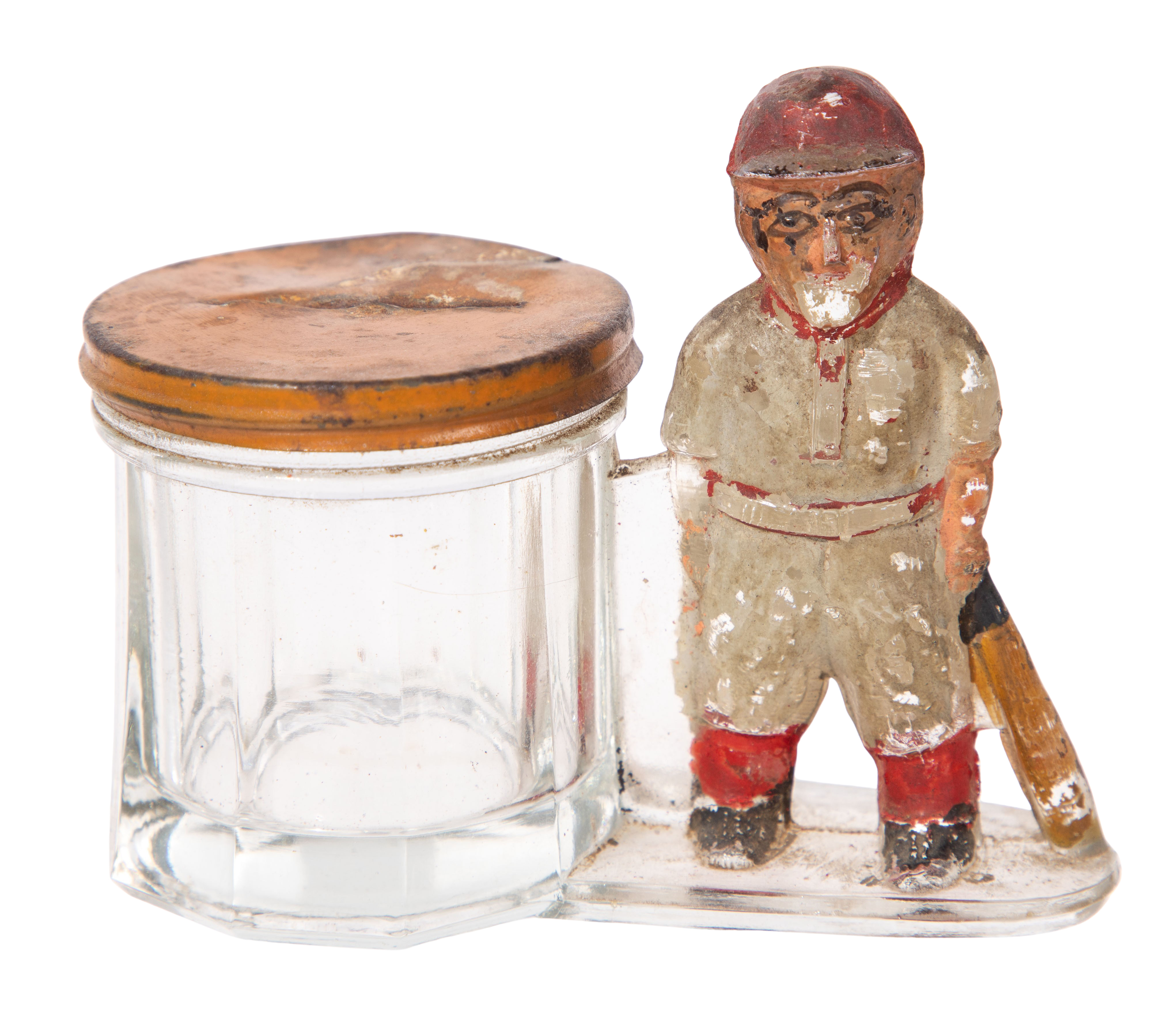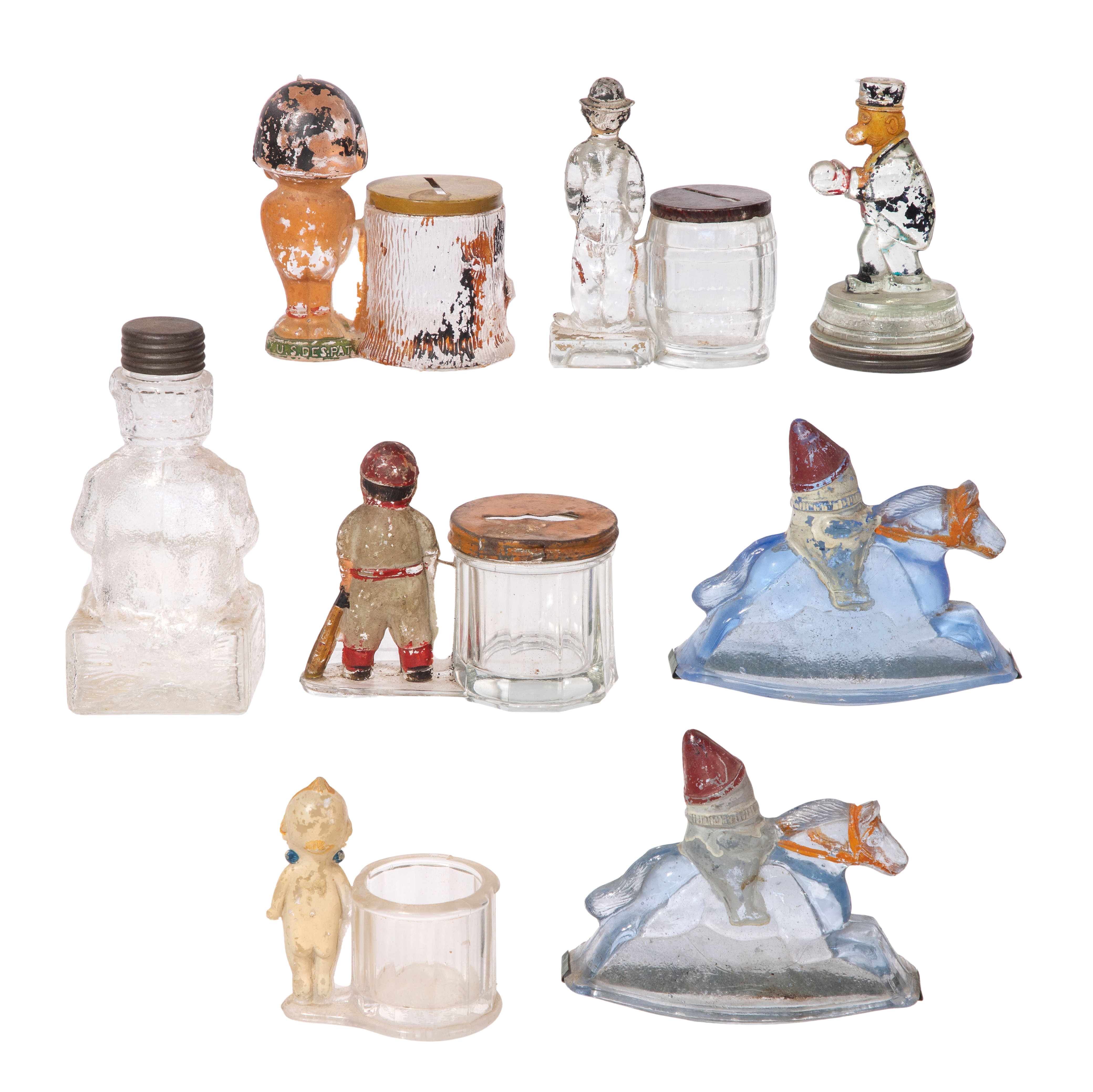 (8) items including a barrel baseball player, a Kewpie doll, a Charlie Chapman, a Barney Google, a Skookum, The Learned Fox and (2) blue glass clowns riding on rocking horses
