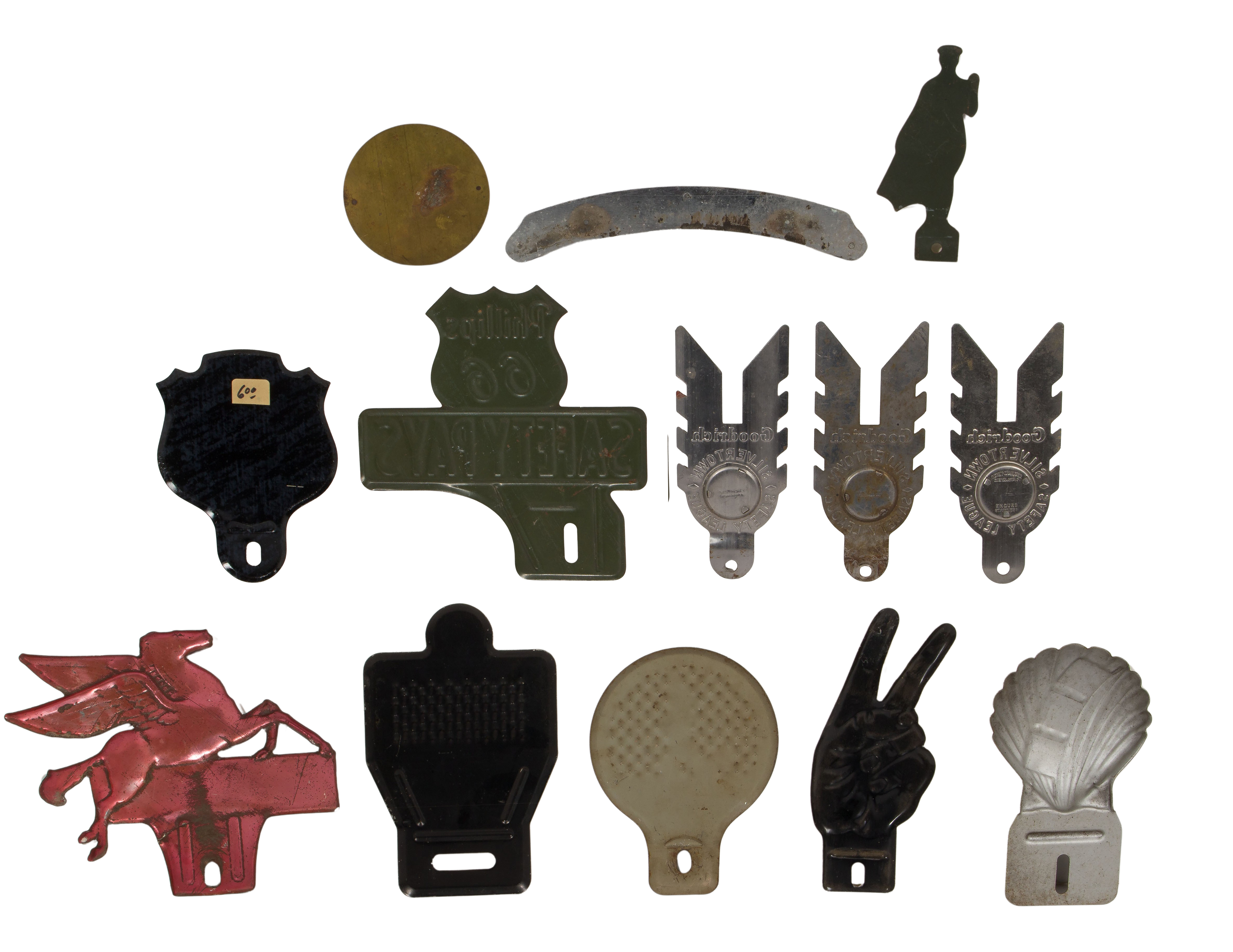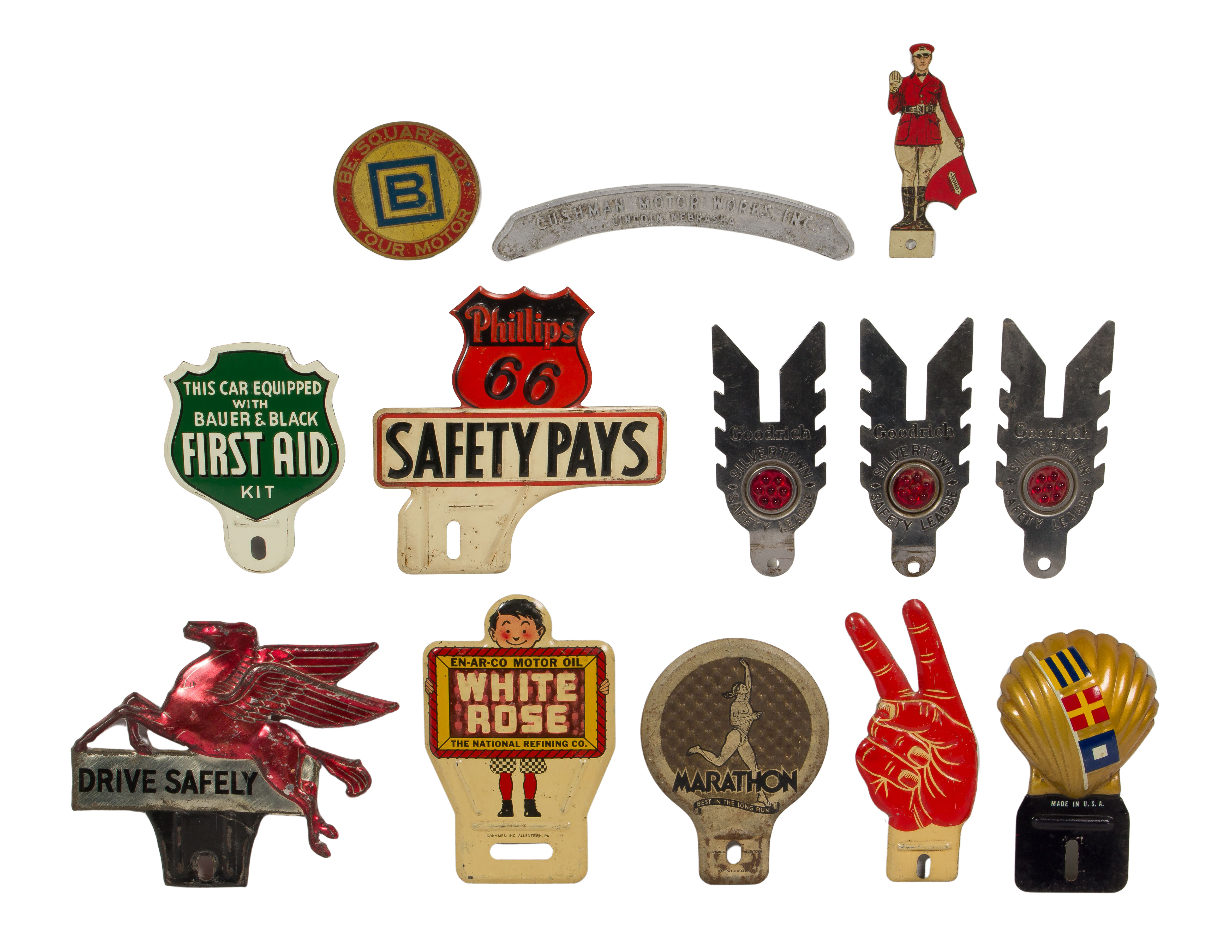 (13) total items including (11) embossed lithographed tin motor oil and tire company advertising; together with a Barnsdale Motor Oil and a Cushman promotional automobile badges