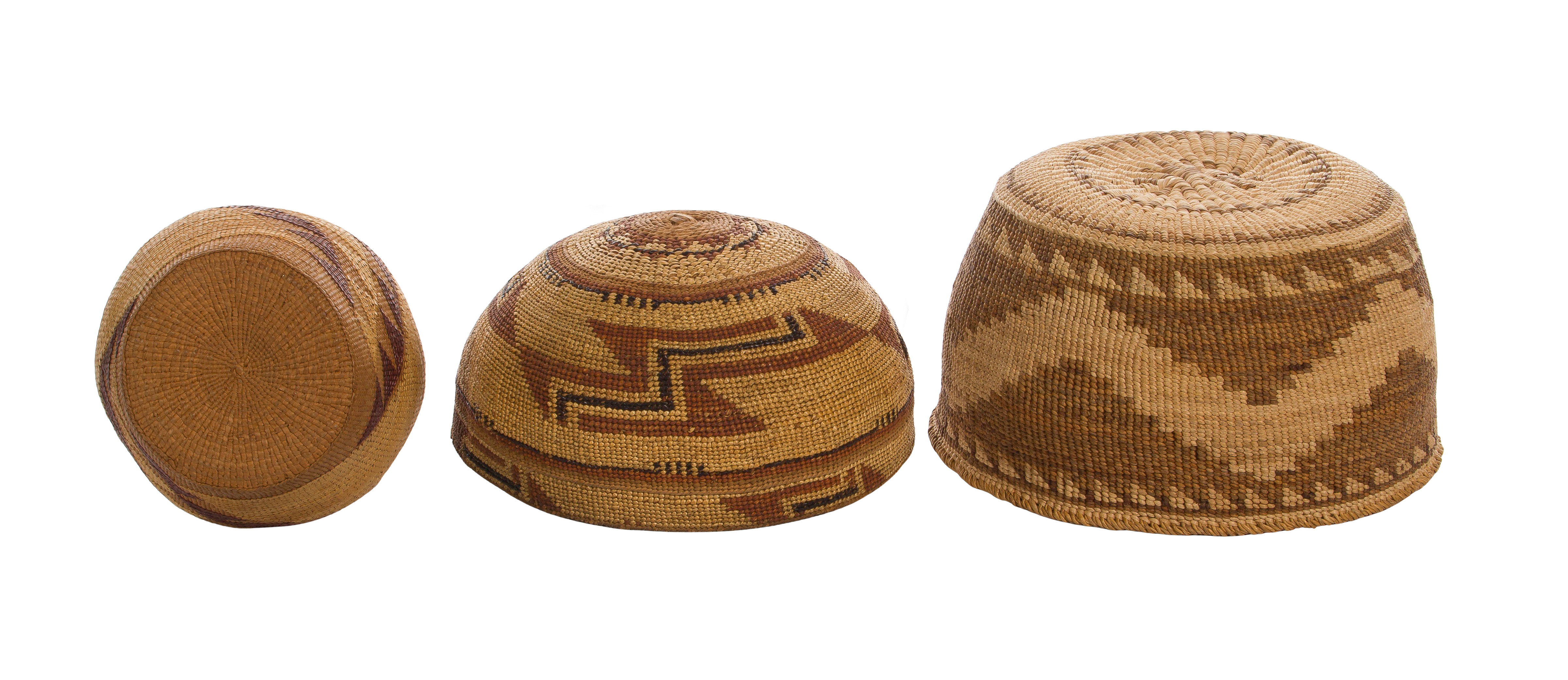 (3) items, all twined construction from Northern California including a hat, a rattle lidded having a strap for securing lid and a bowl which may be Klamath from Southern Oregon