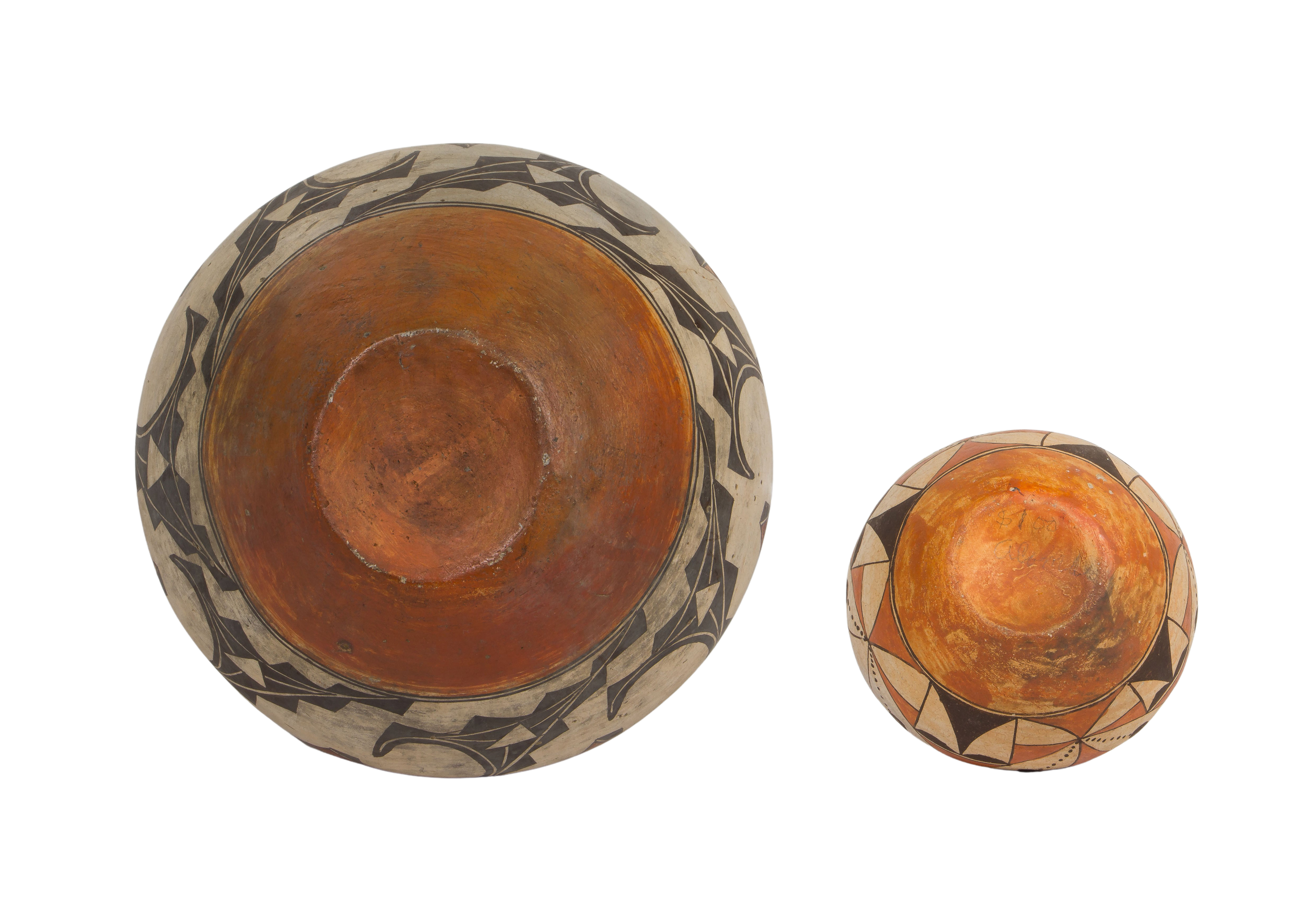 (2) items including a tri-color jar with geometric motifs above a terracotta wash and a smaller tri-color having thin walls, fine line and geometric patterns, signed ‘Acoma’