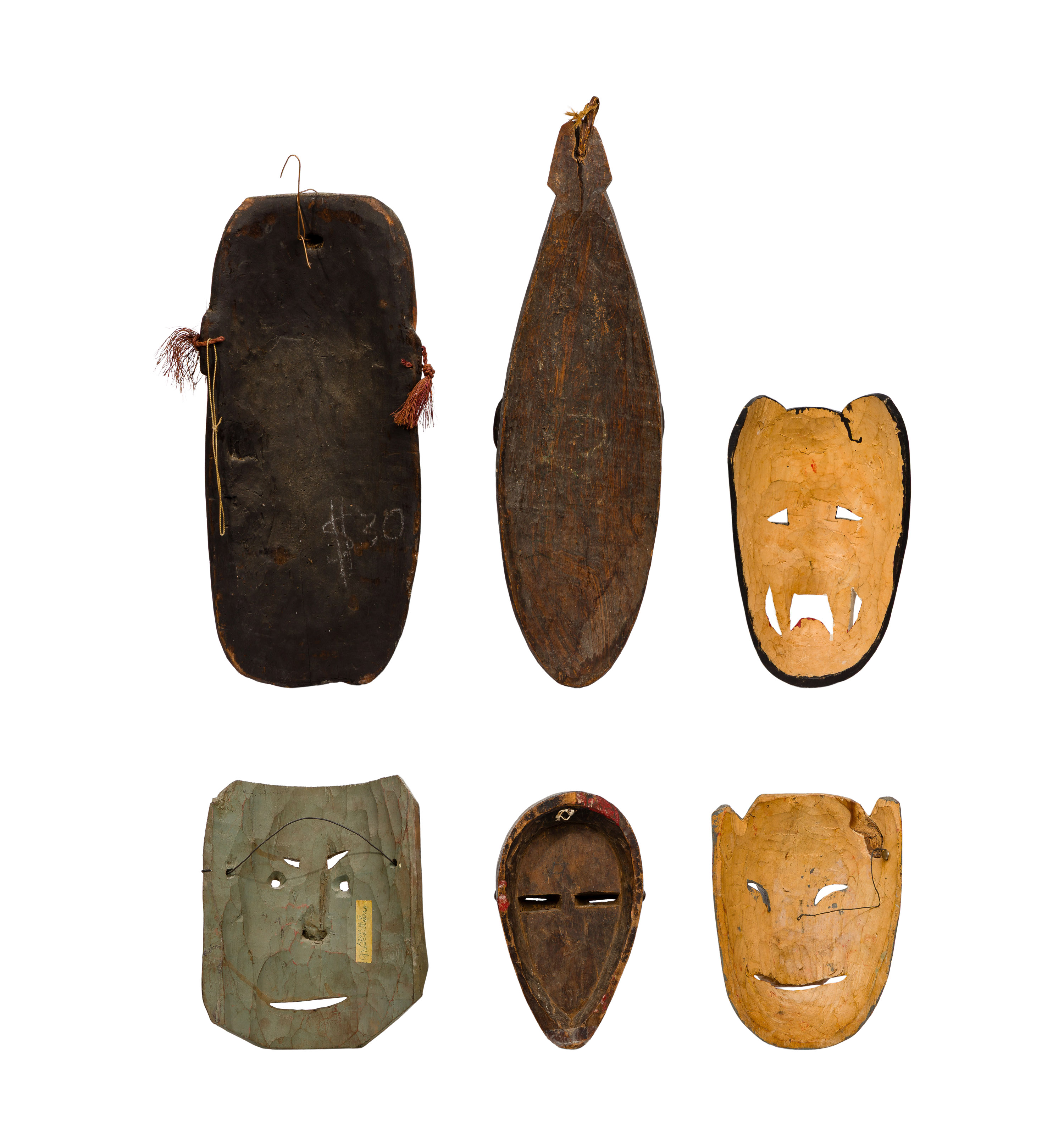 (6) carved wood items including an African Dan, a Southeast Asian, (2) Papua New Guinea, a Mexican Patzcuaro and a Guerrero Mexican, most painted