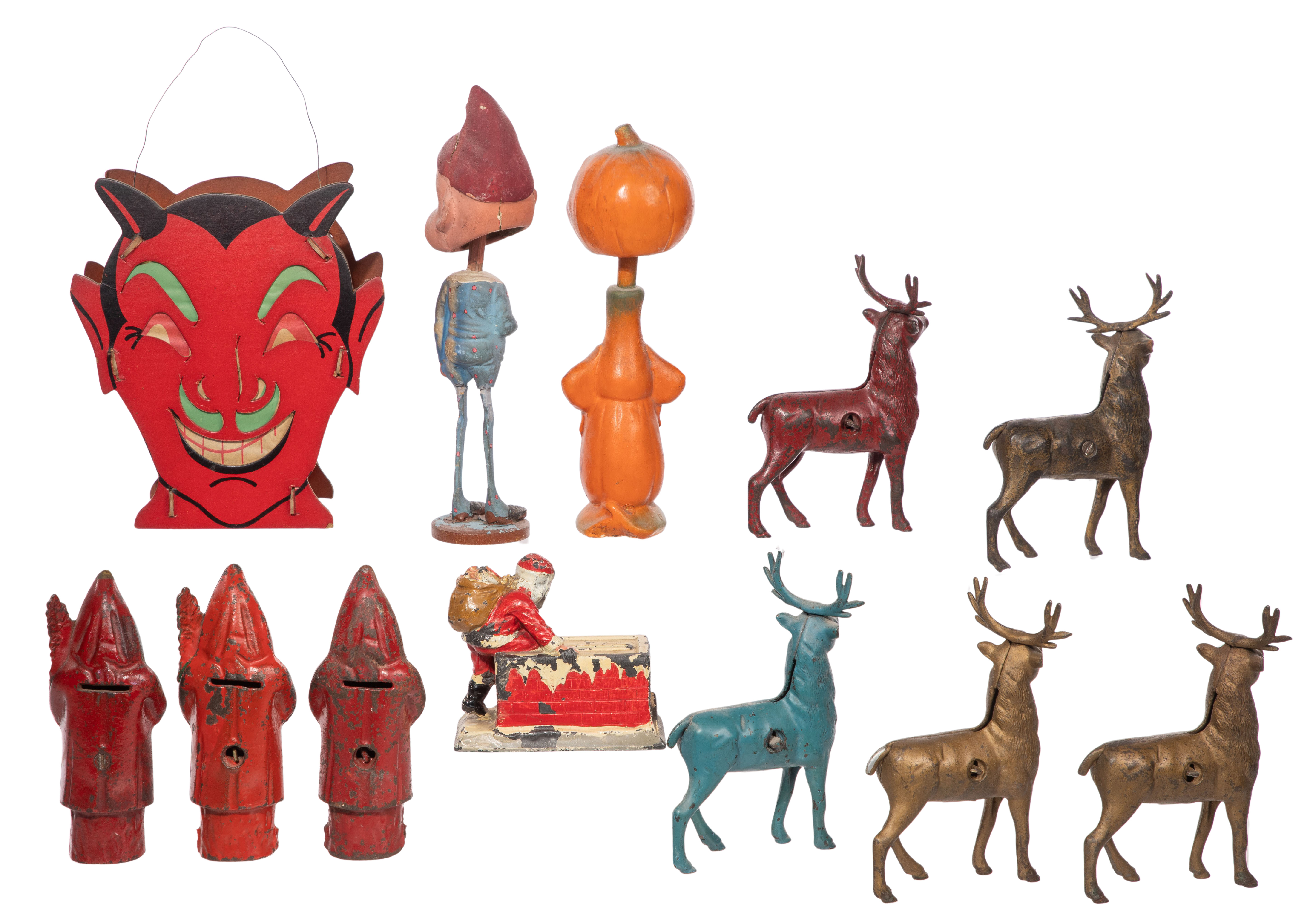 (12) items including a double sided devil Halloween lantern, (2) papier mache bobble style figures having heads on sticks, a pumpkin and an elf, (5) cast iron reindeer still banks and (4) cast iron Santa themed still banks