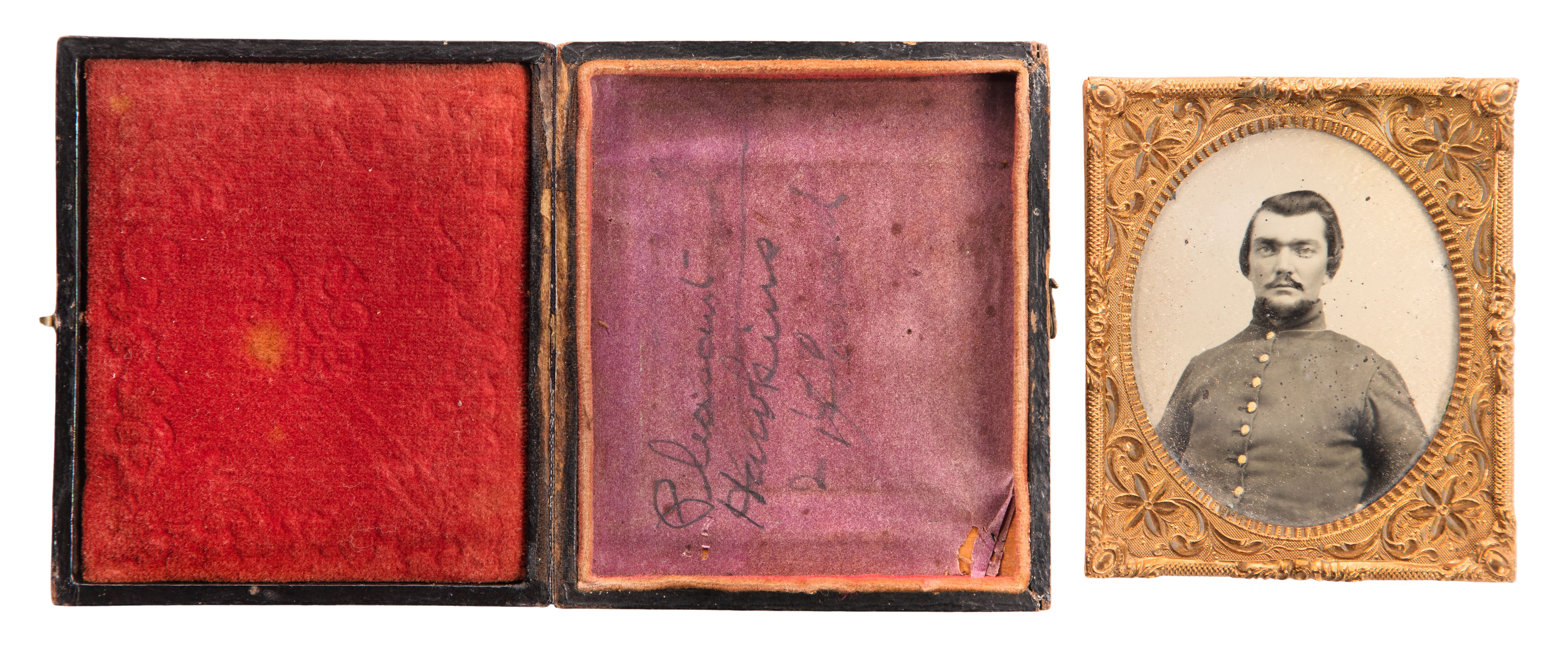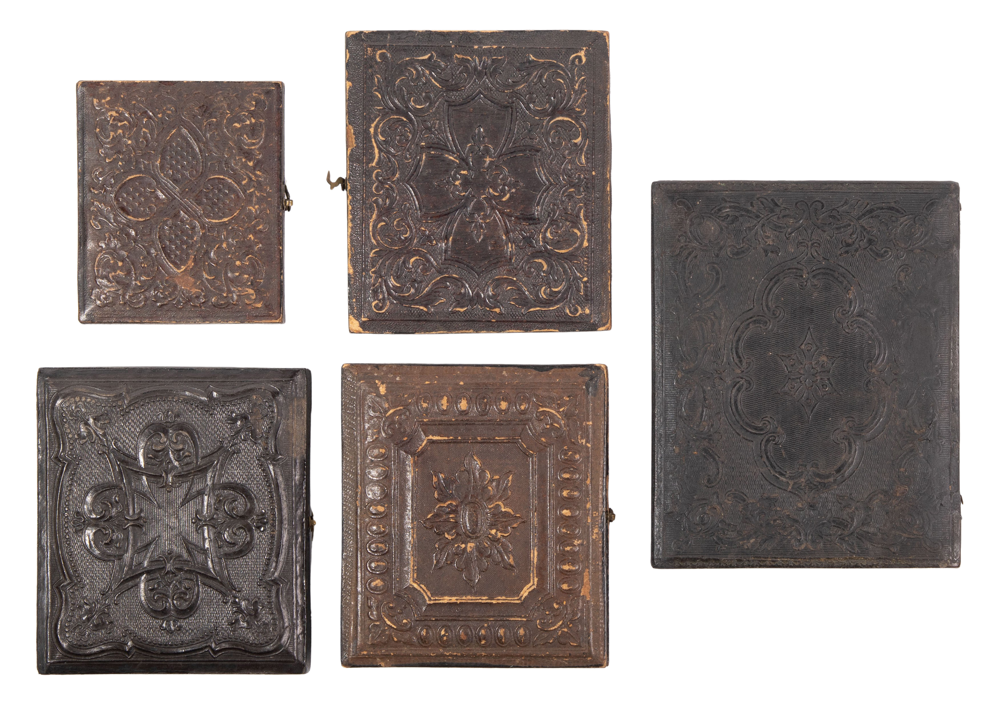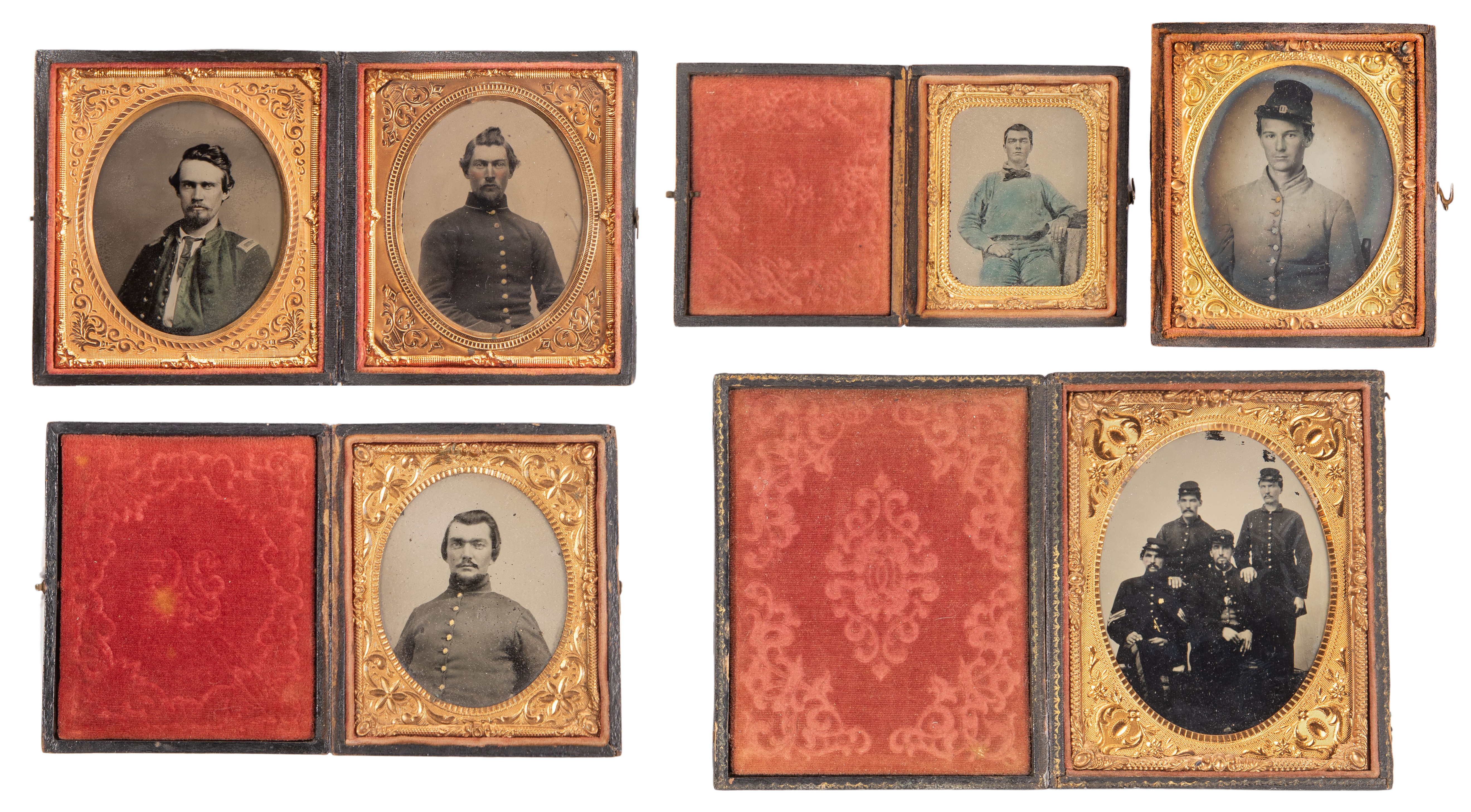 (6) tintypes in five cases including a quarter-plate grouping of four soldiers, (2) sixth-plate cased together, (2) sixth-plate and a ninth-plate, all in leather over wood cases