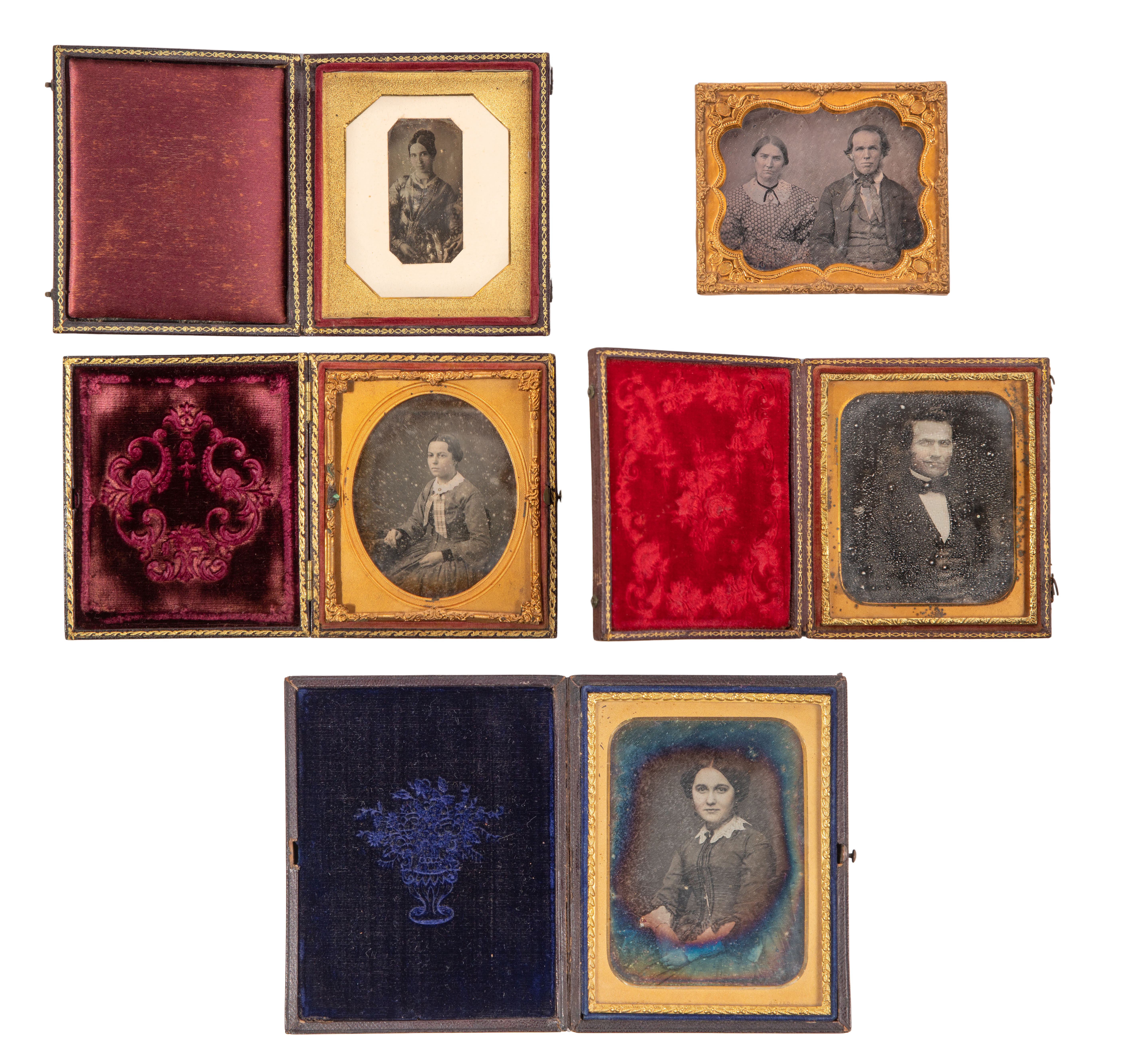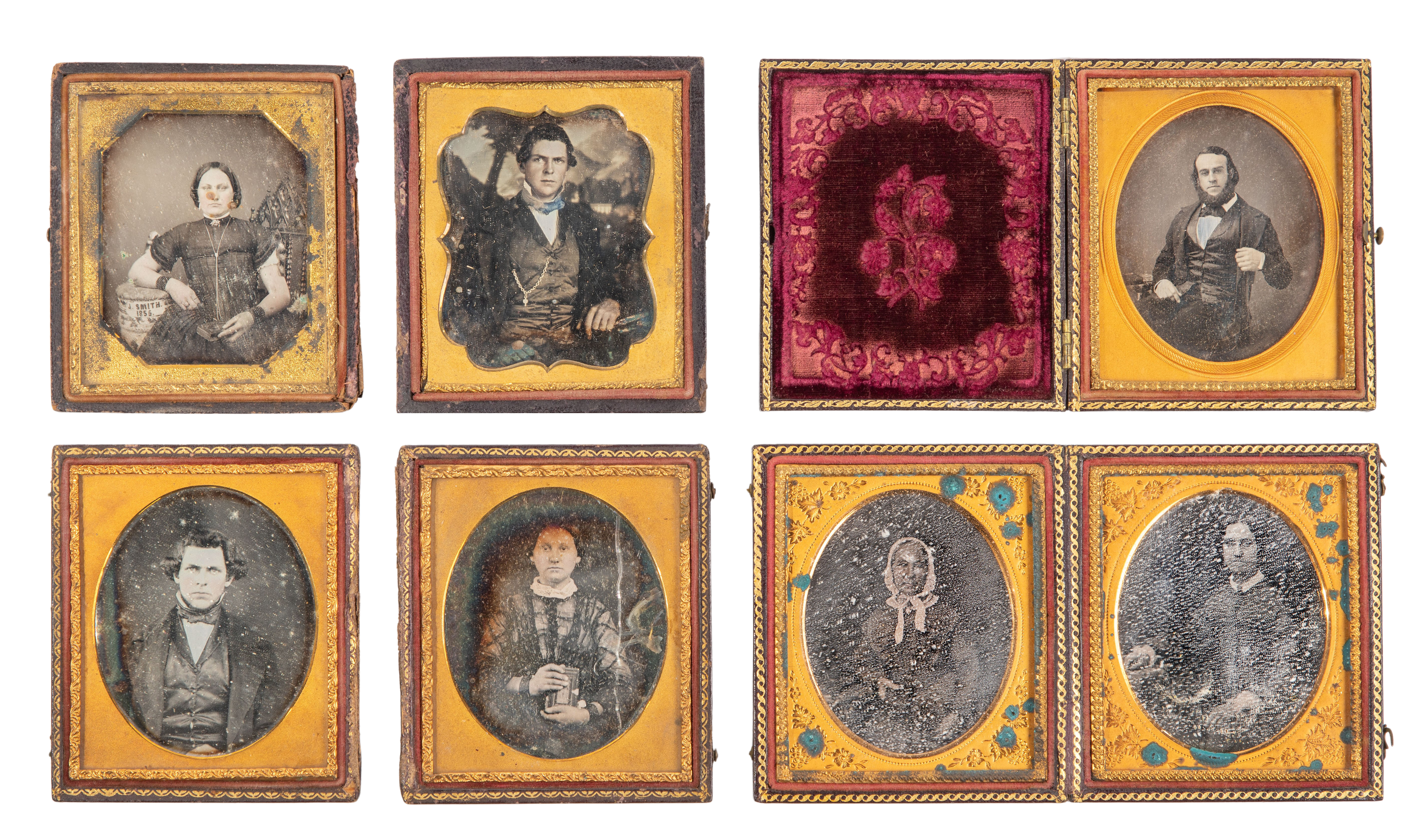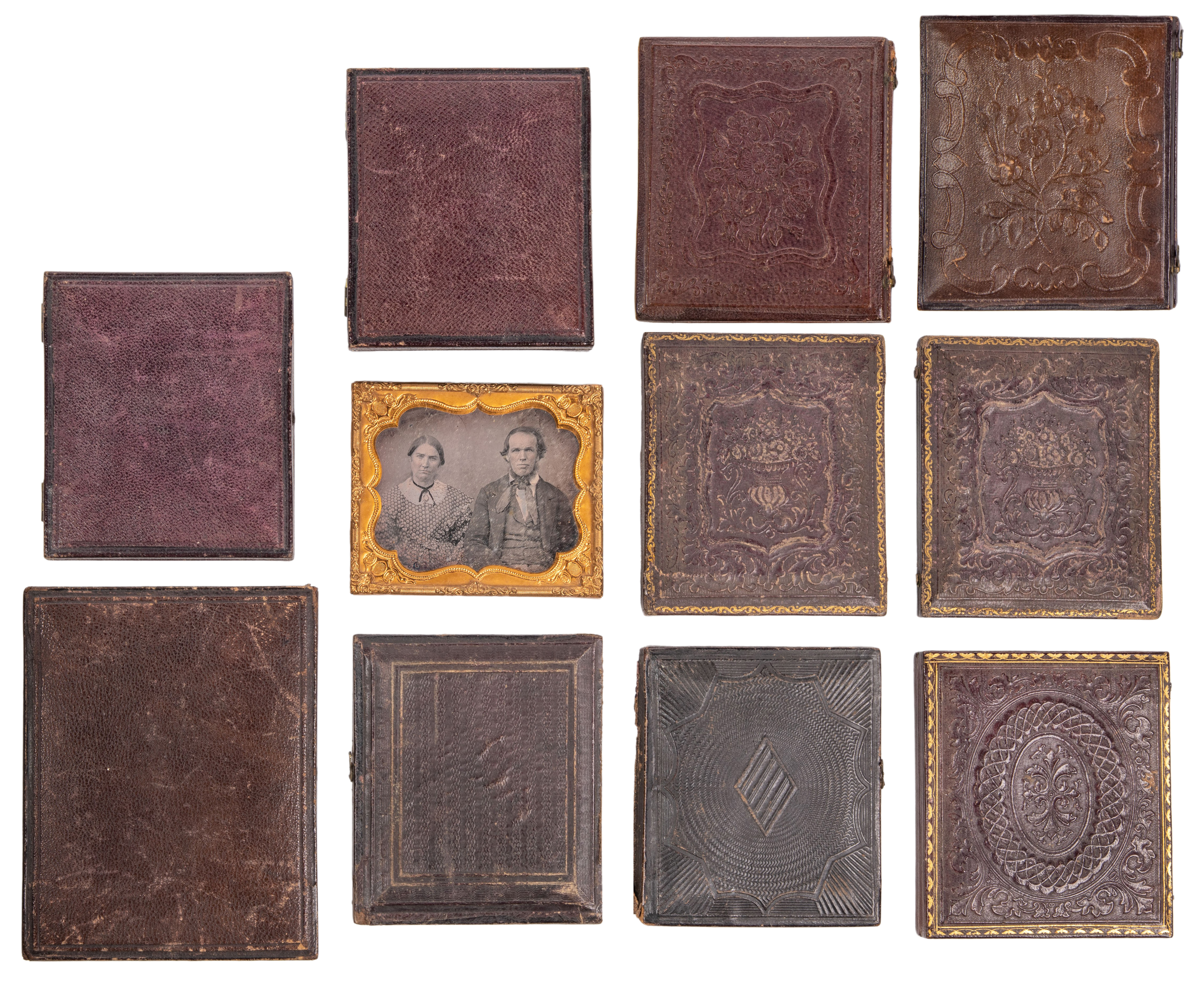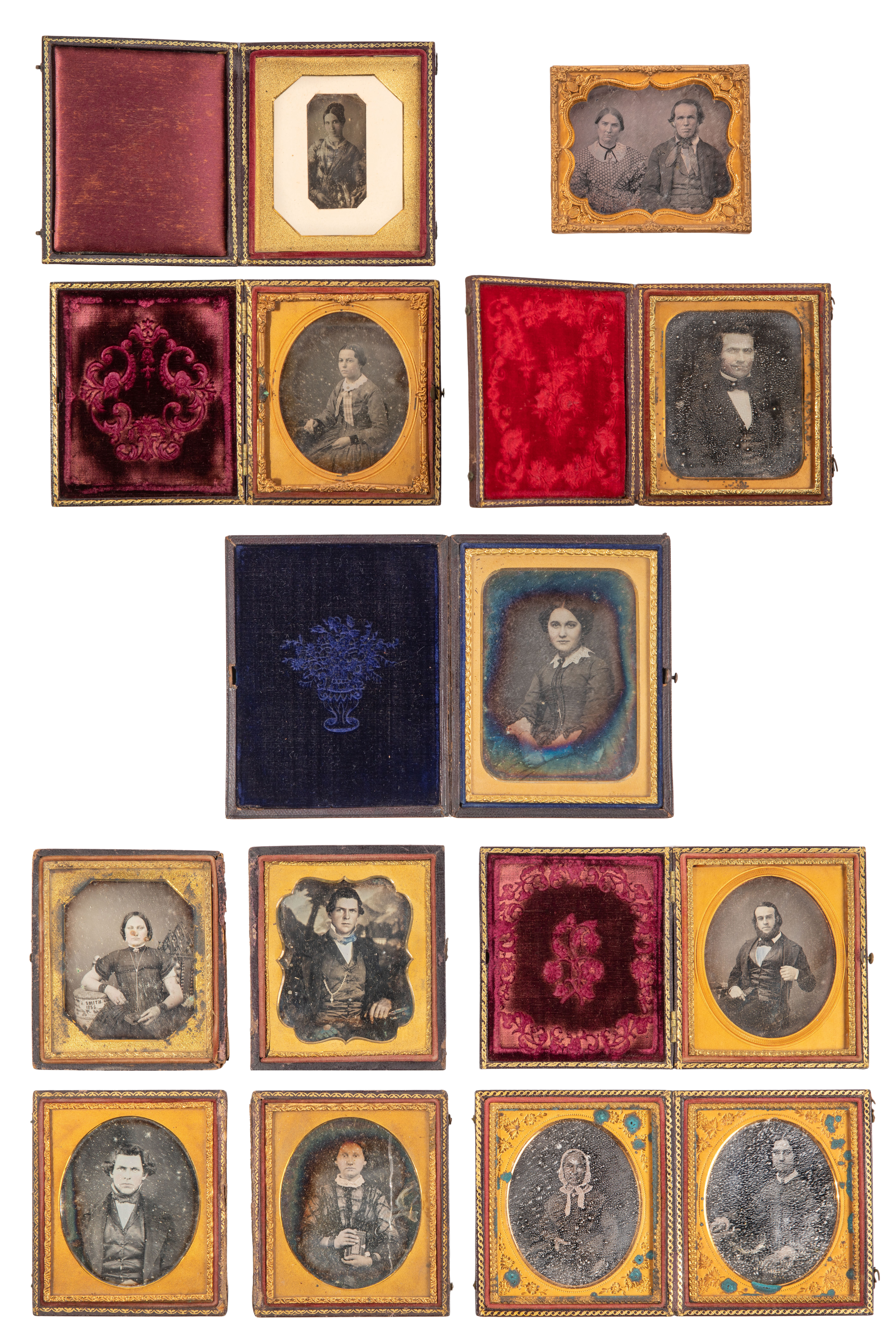 (12) items depicting people, including (11) sixth-plate in nine cases with one being a double and one uncased and a quarter-plate, most having leather over wood cases