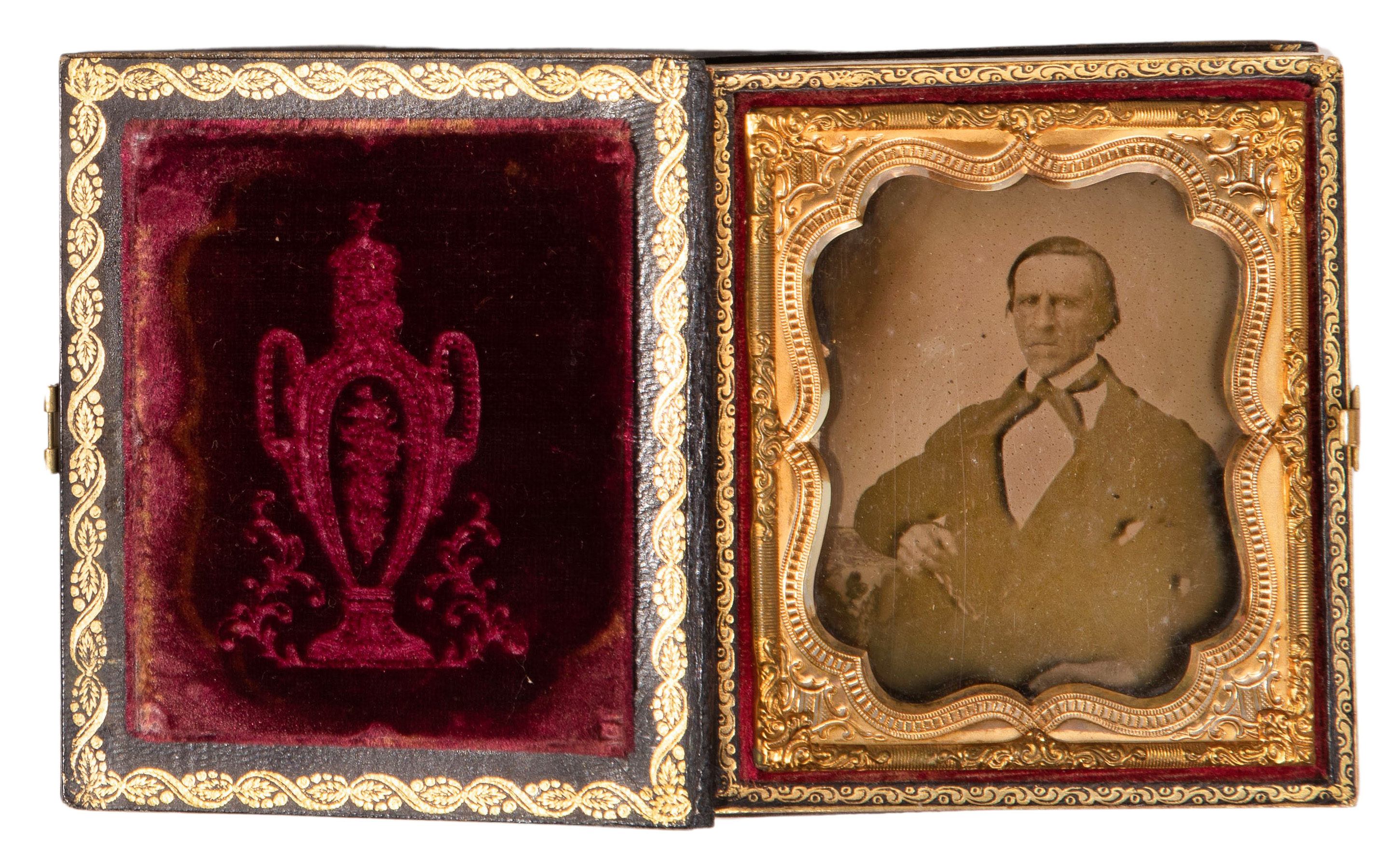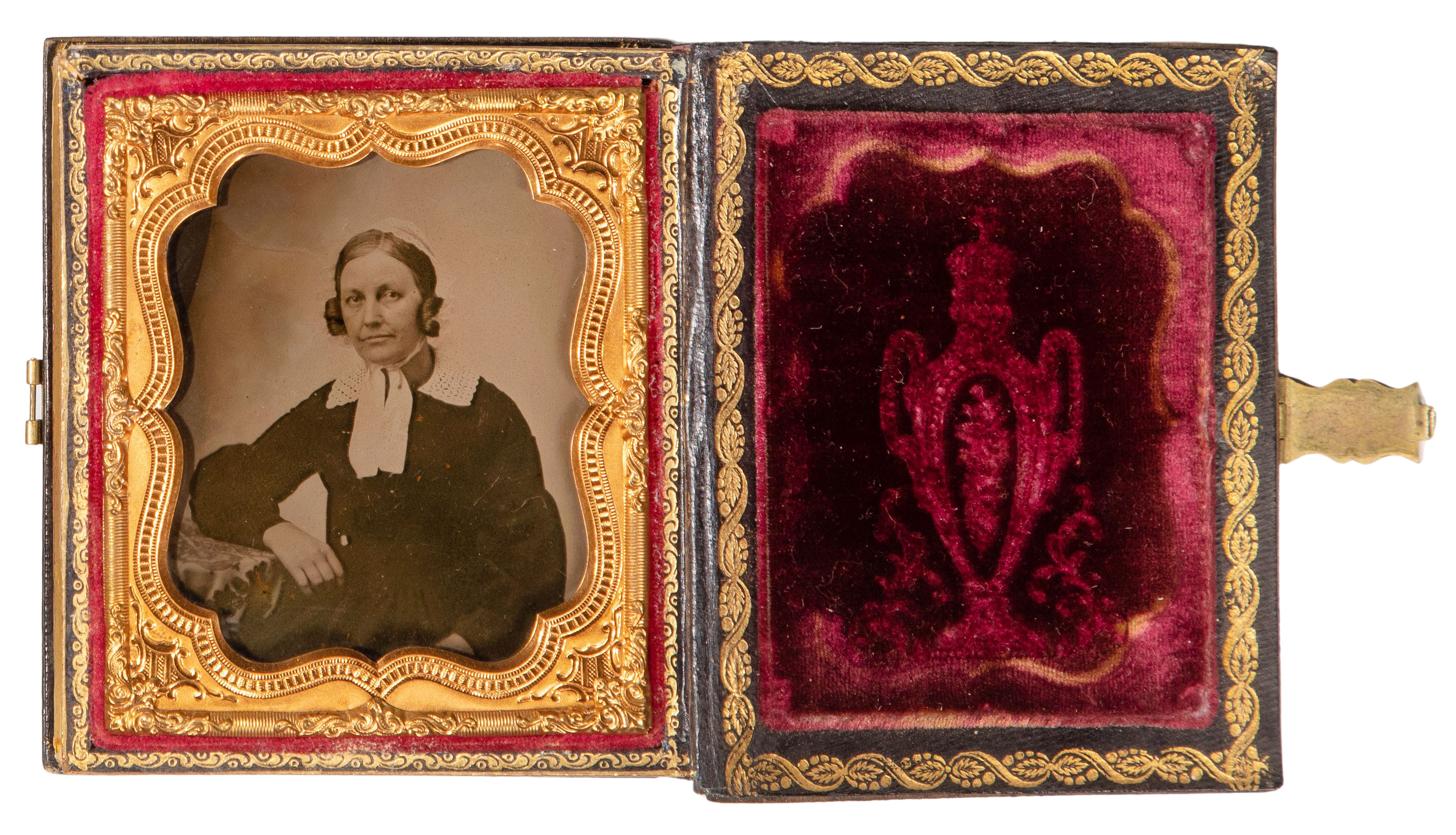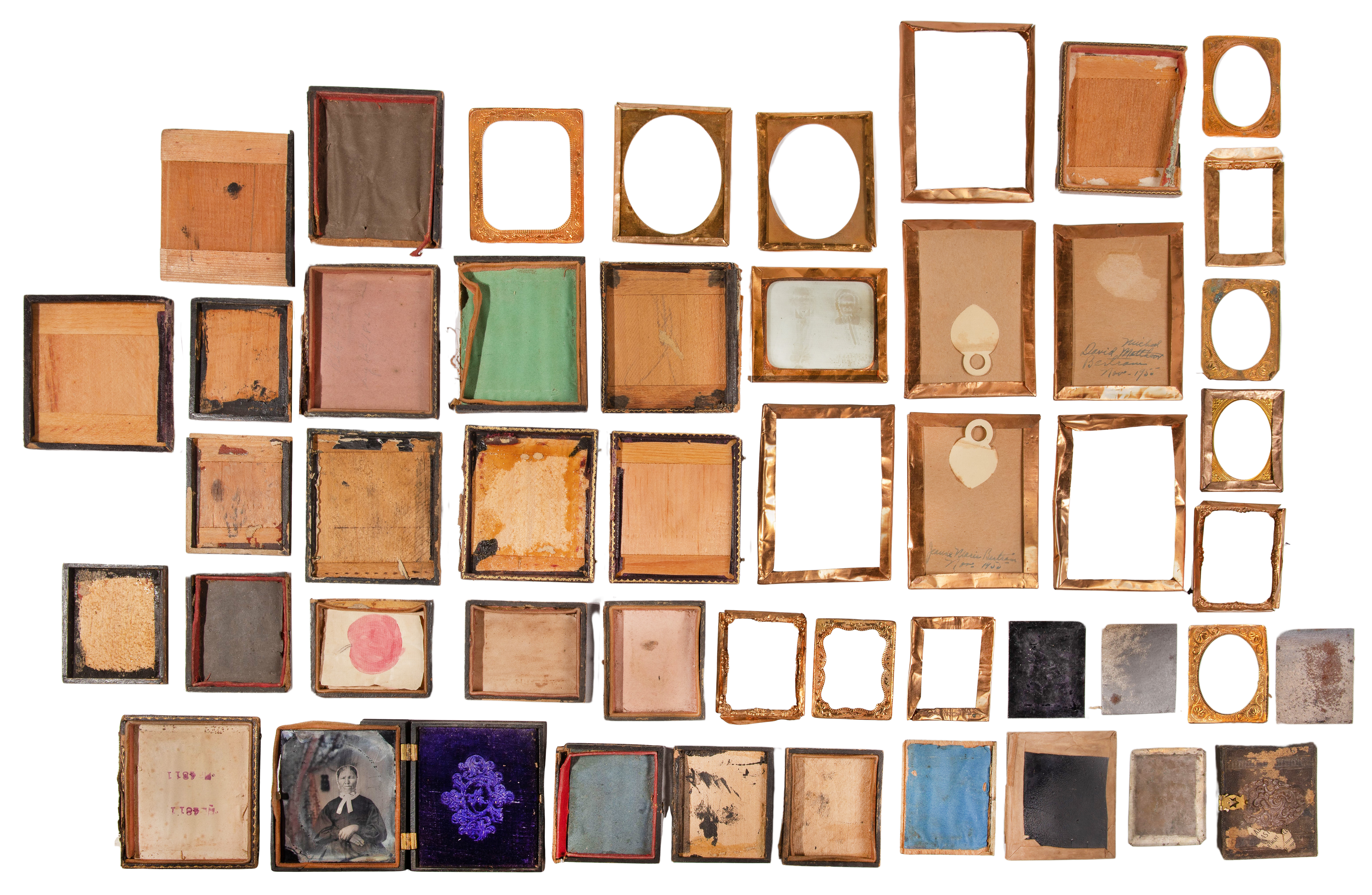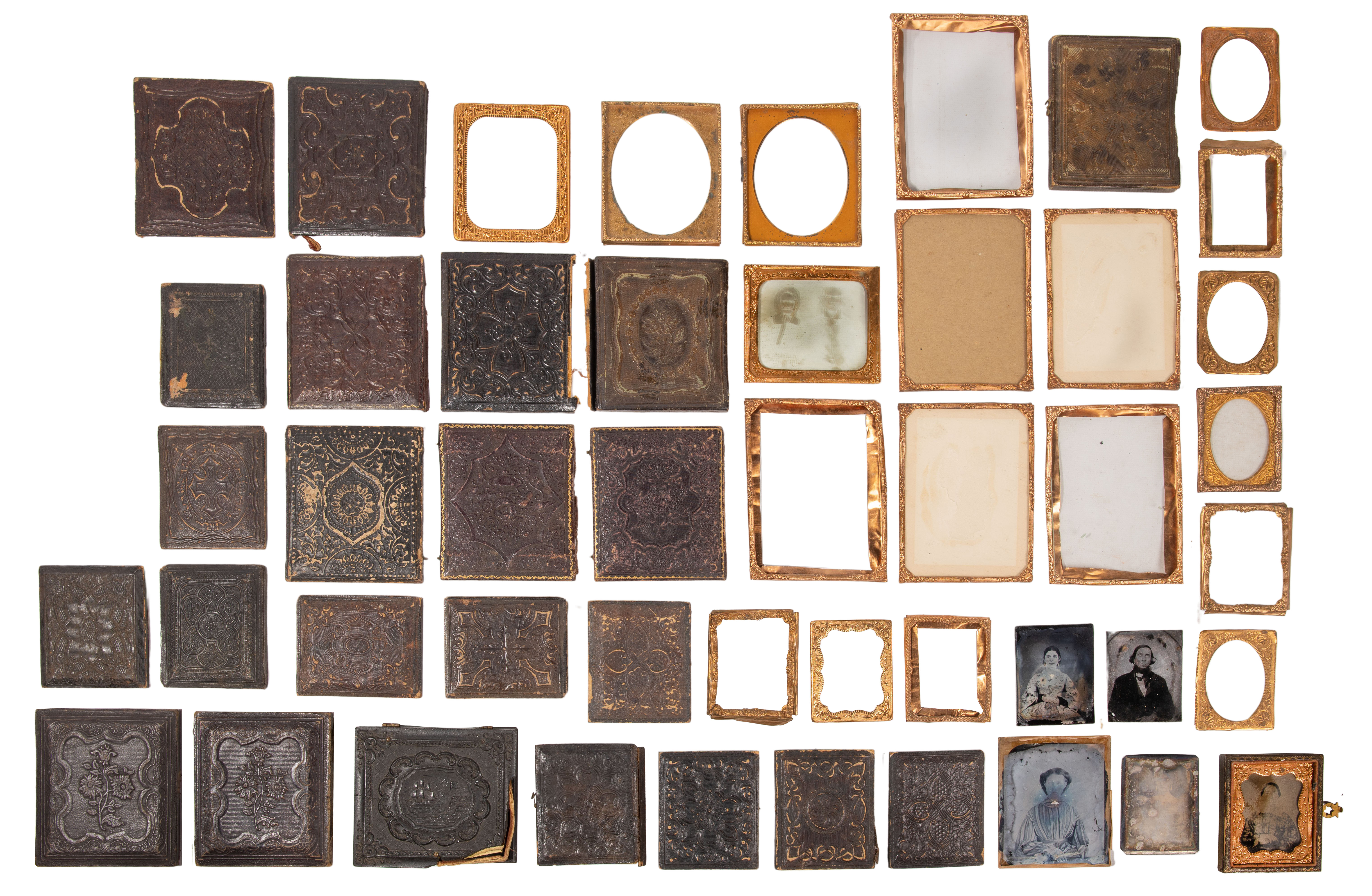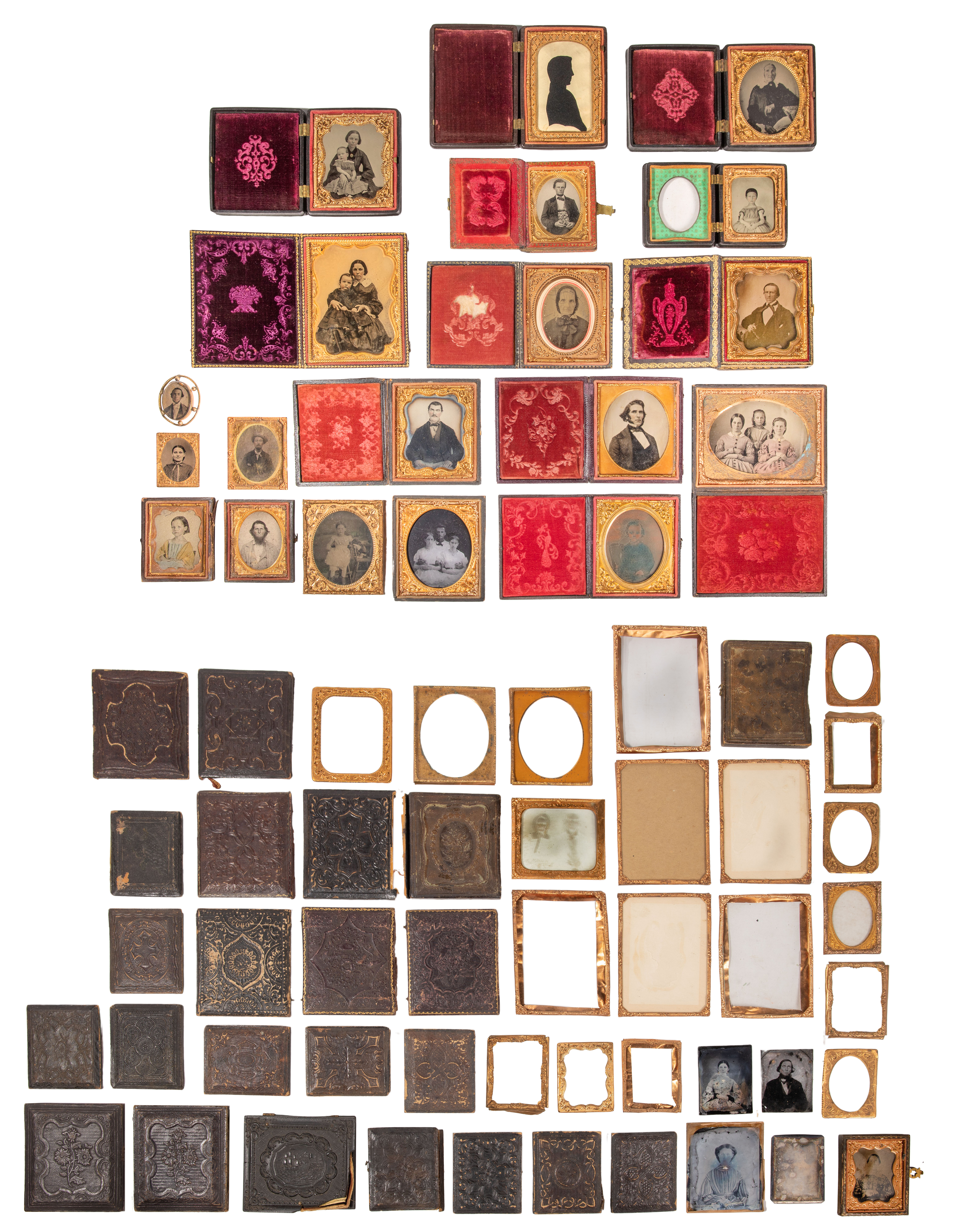 Over (65) total items in various shapes, sizes and types, all portraits, including (6) in thermoplastic (gutta percha) union cases, (3) in Japanned mother-of-pearl inlaid cases with one having double openings, (6) in broken cases, (3) in leather cases and a singular pin; together with over (50) case parts