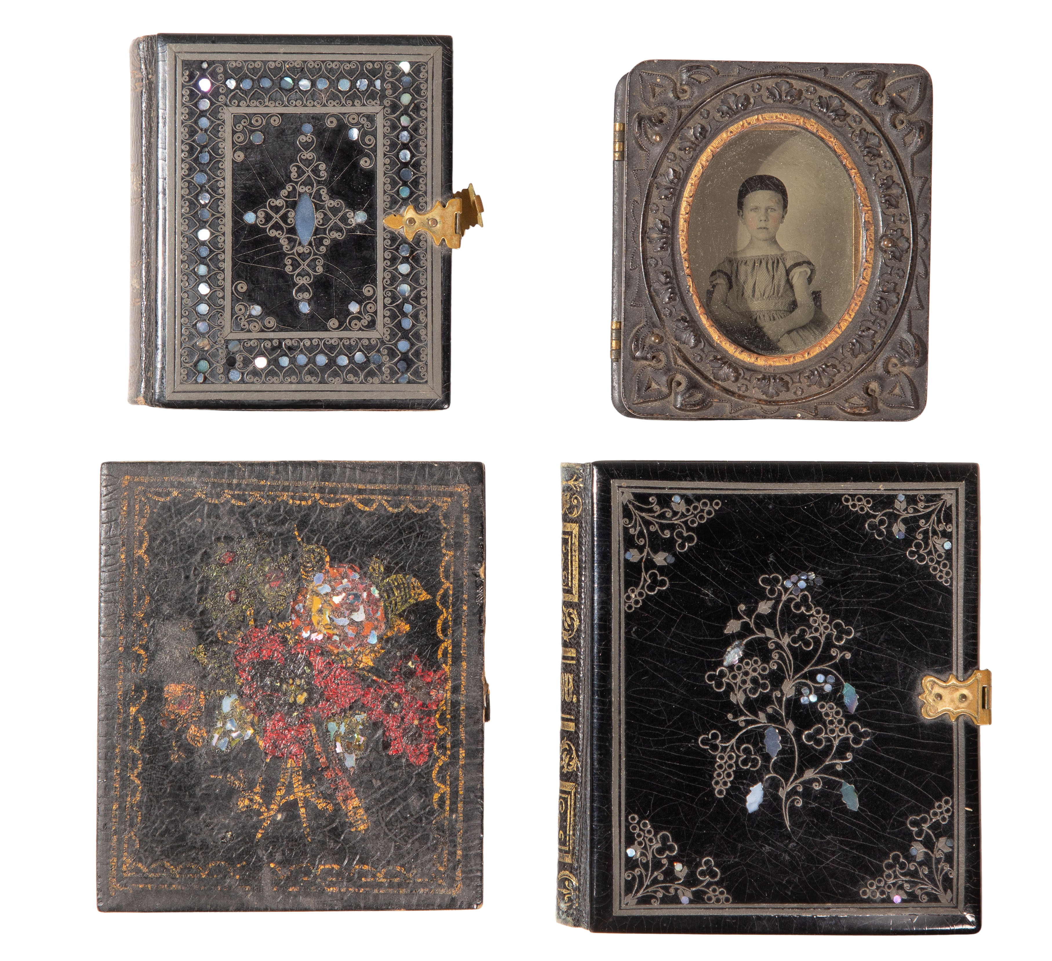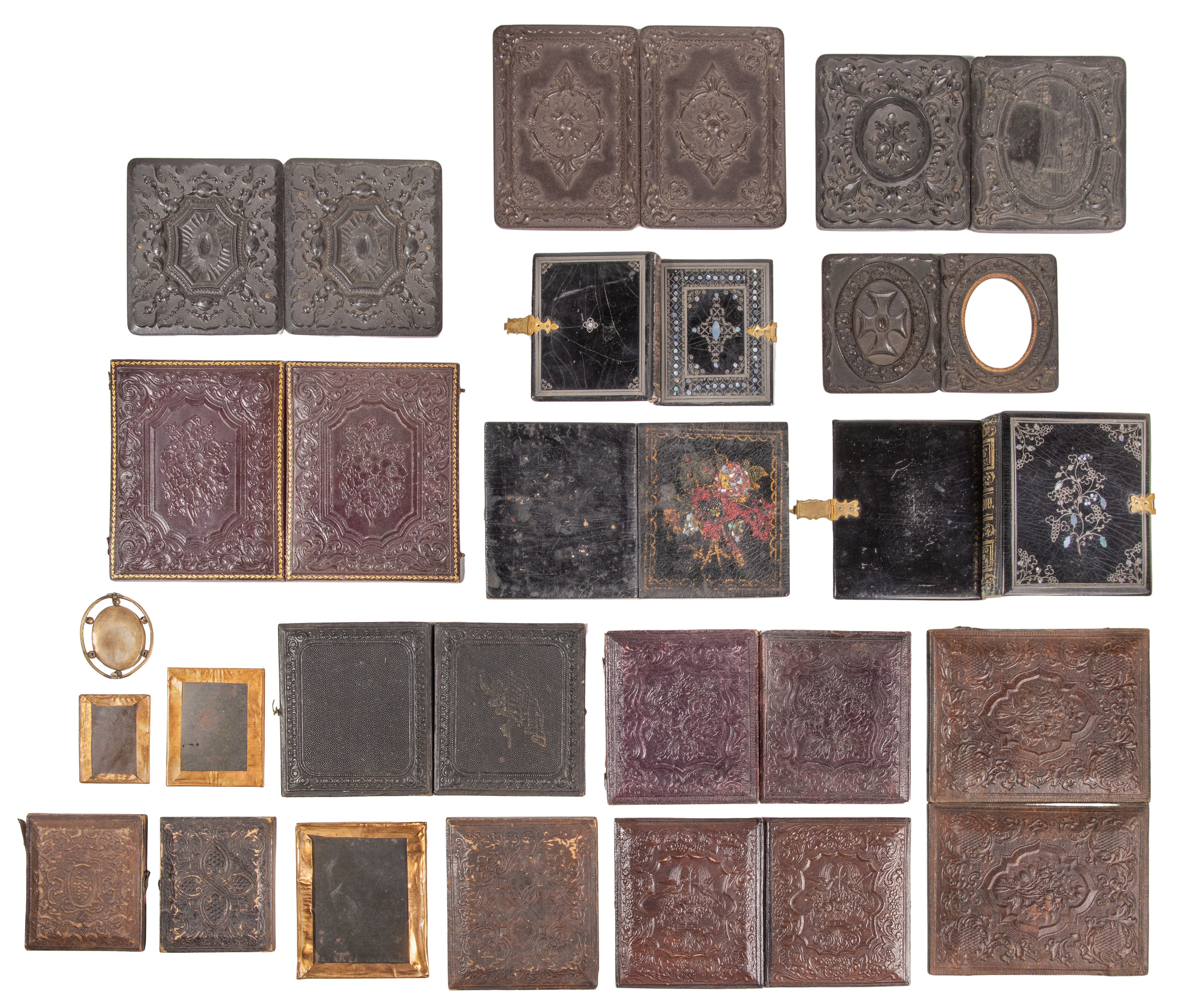 Condition: overall light to heavy wear consistent with age normal use, some photographs having cracking, scratches, bubbling to the image and areas of discoloration and fading, cases having wear, scratches, loose hinges, crazing, gilt missing, broken latches, dirt accumulation overall
