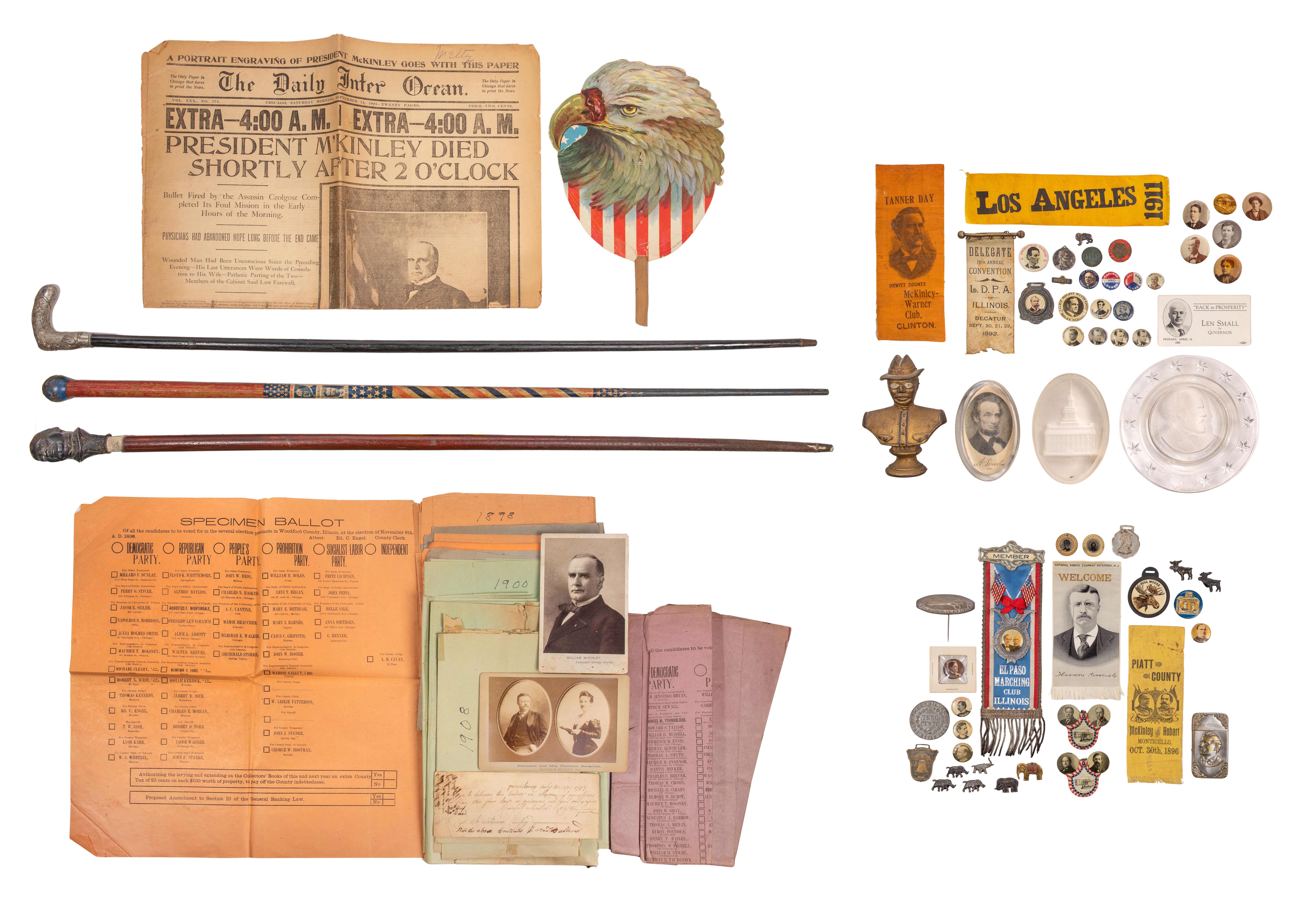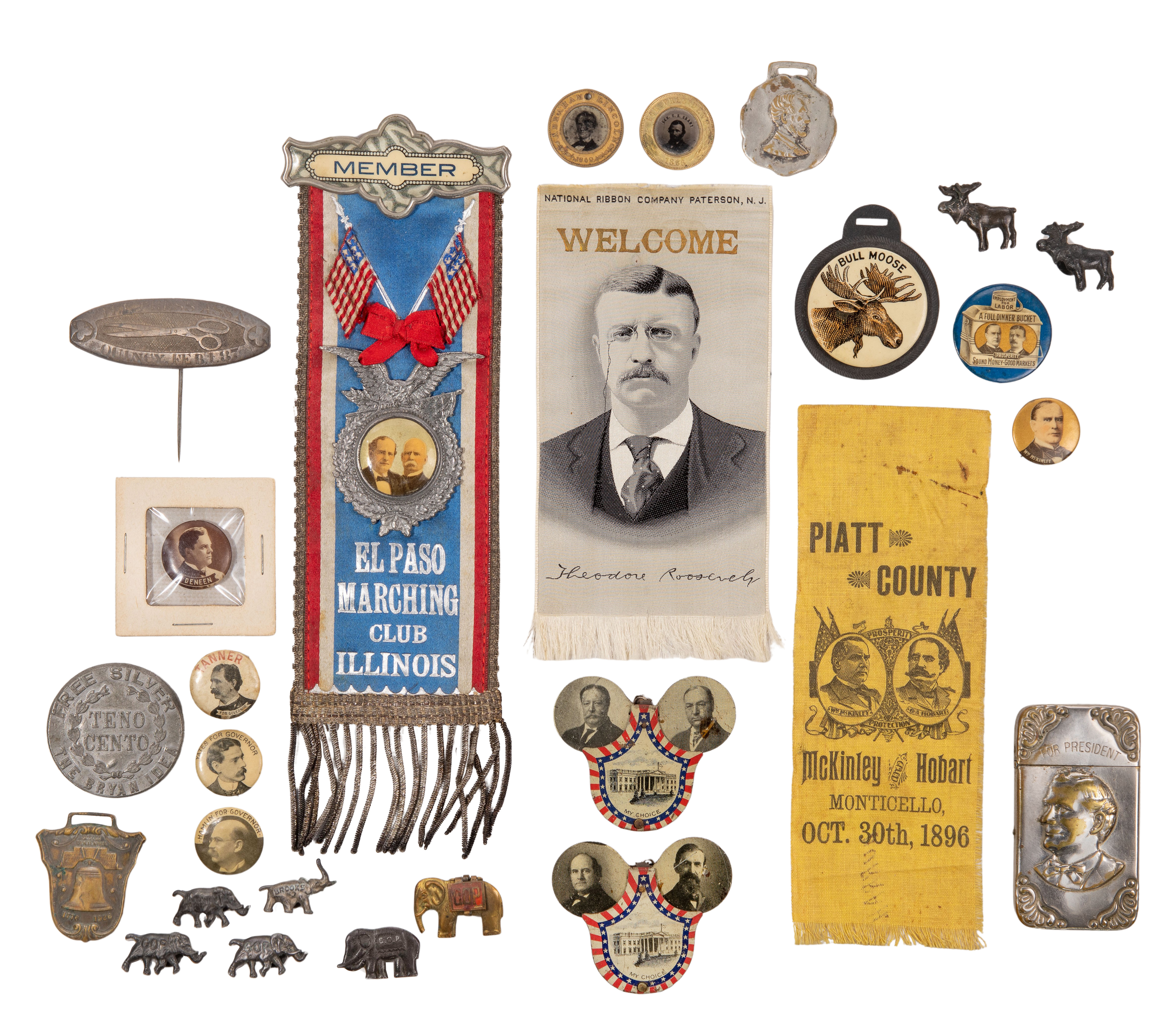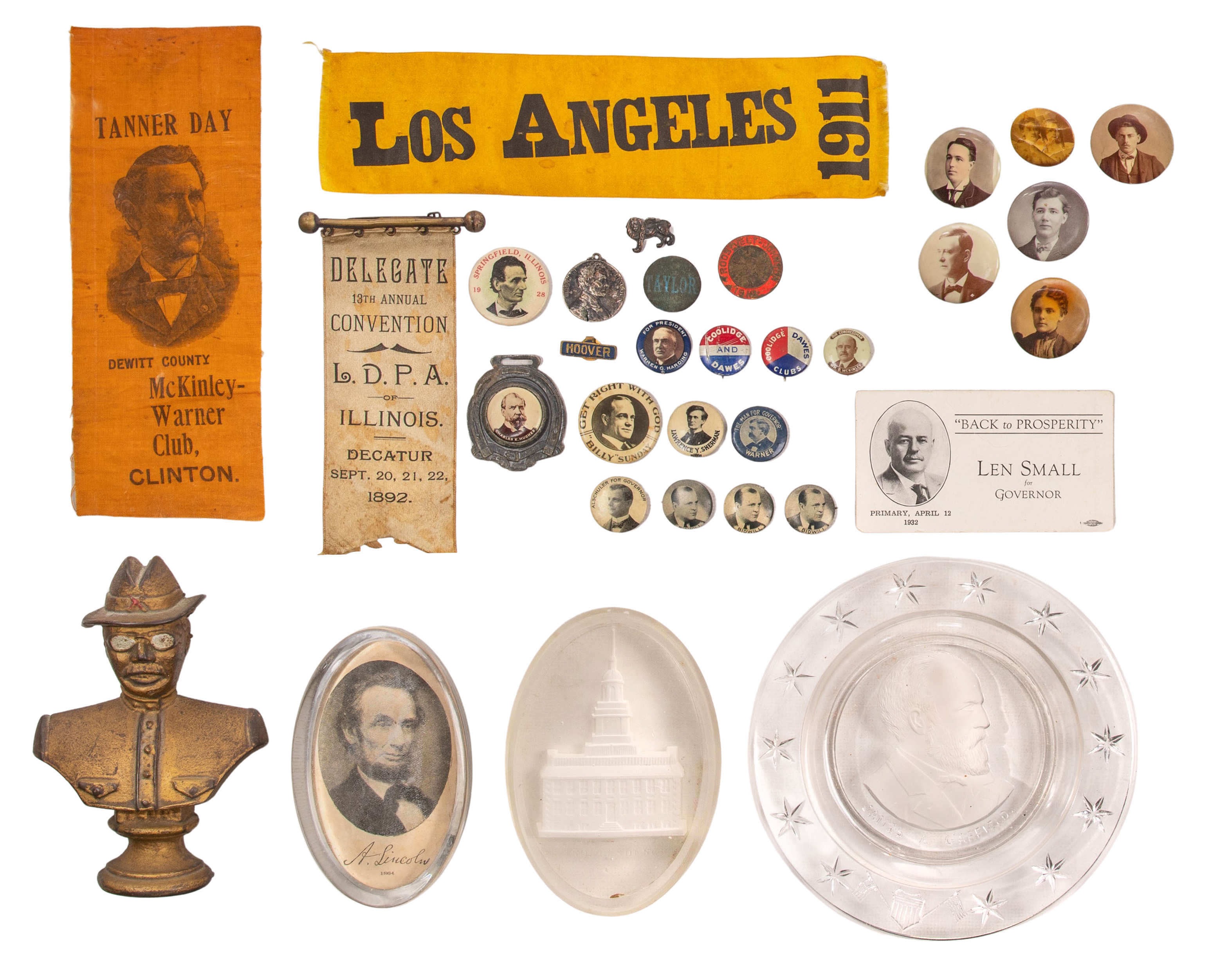 Approximately (40) items including (3) canes, (6) GOP pins, (2) My Choice pins, (2) Progressive Party pins, a 1868 Grant for President ferrotype pin, a 1860 Abraham Lincoln and Hannibal Hamlin ferrotype pin, a Deneen button, a 1887 Illinois Press Association pin, a Theodore Roosevelt ribbon, a Piatt County McKinley and Hobart ribbon, a El Paso Marching Club Illinois ribbon, a Bryan’s Idea of Coinage token, buttons, ballets, ephemera and (2) glass objects