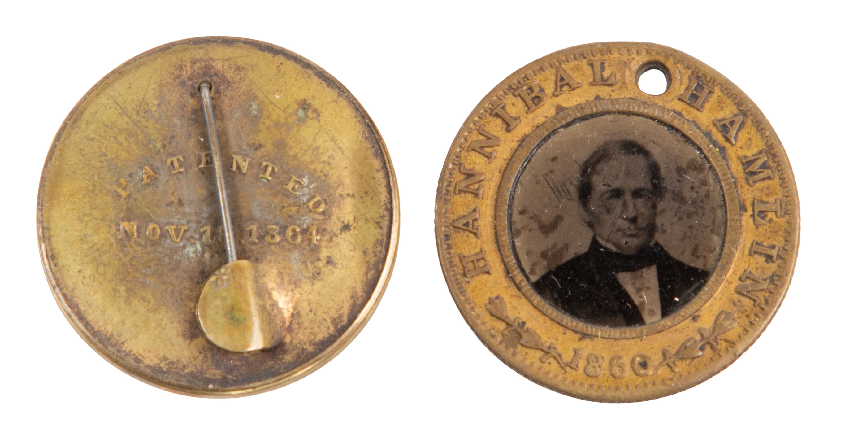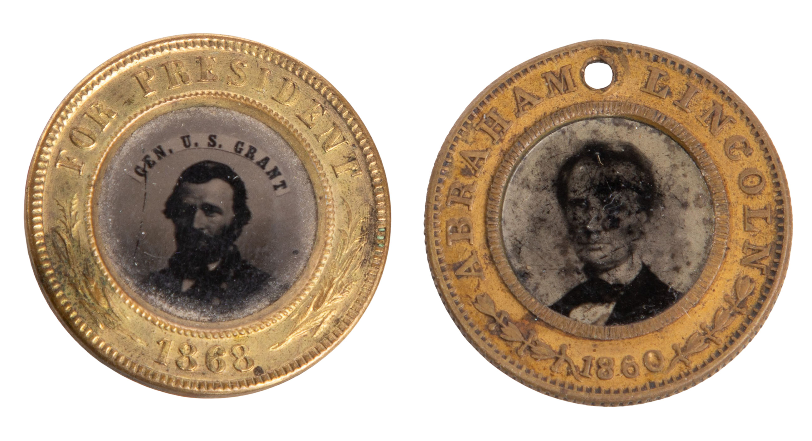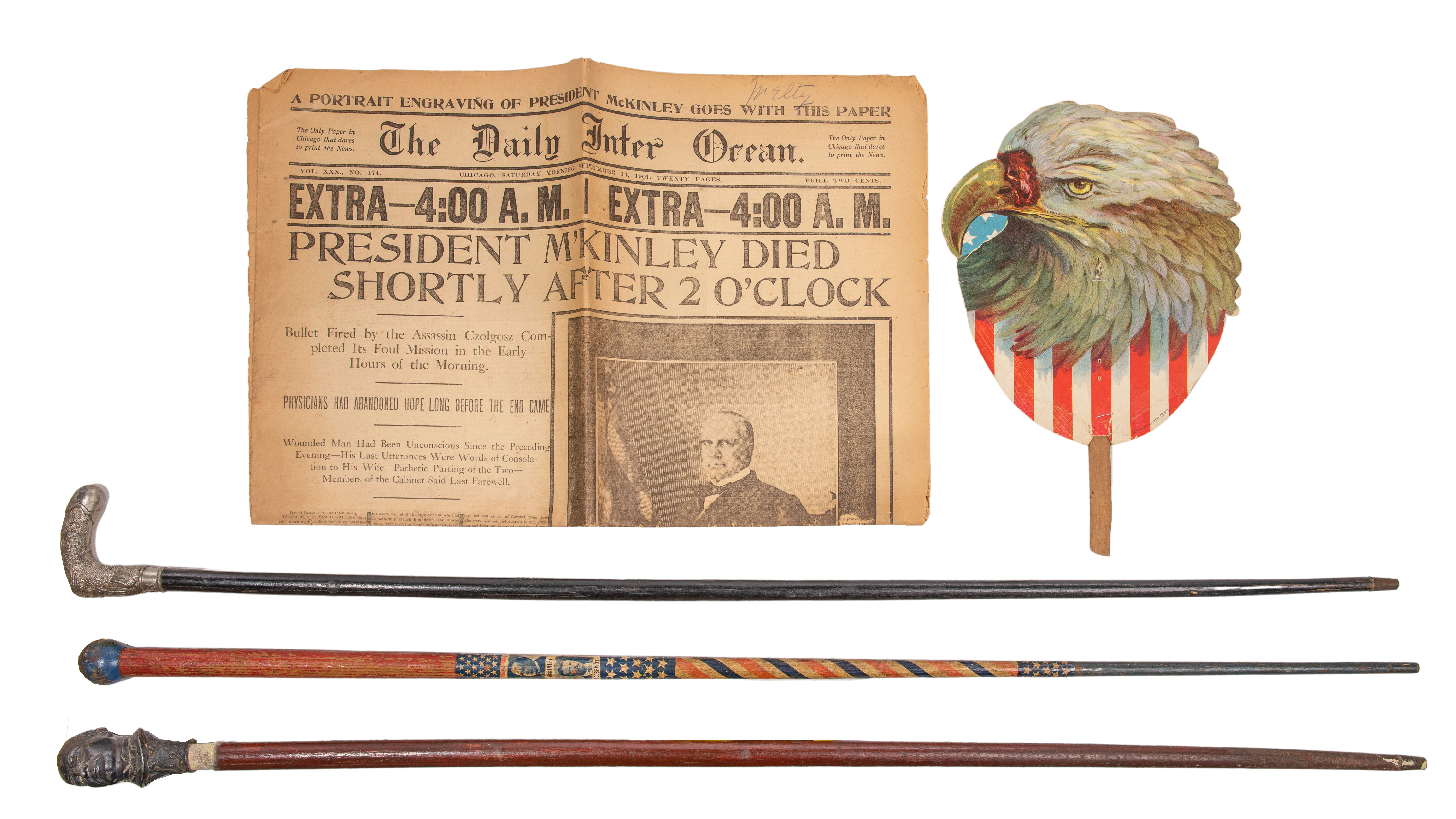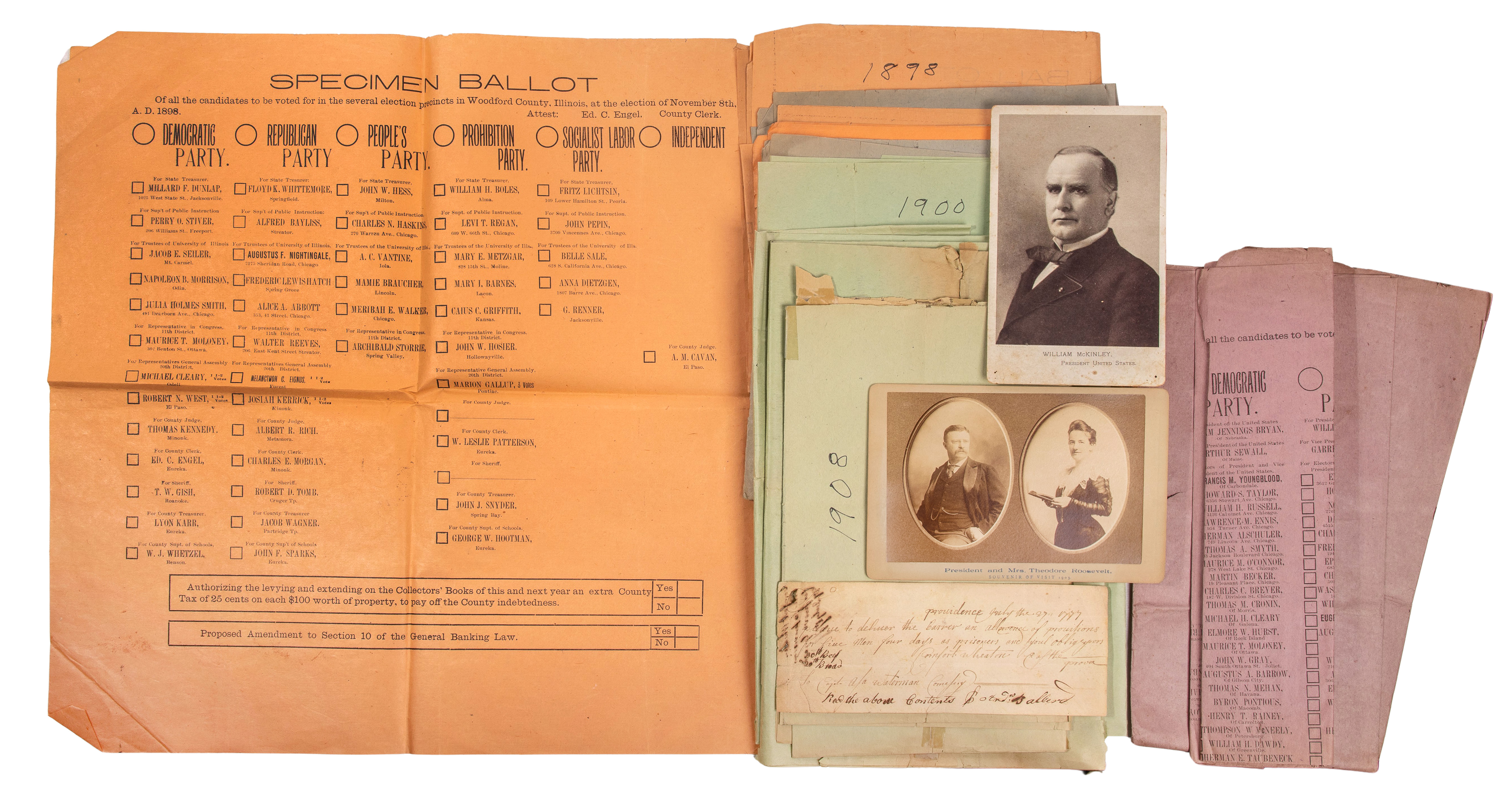 Approximately (40) items including (3) canes, (6) GOP pins, (2) My Choice pins, (2) Progressive Party pins, a 1868 Grant for President ferrotype pin, a 1860 Abraham Lincoln and Hannibal Hamlin ferrotype pin, a Deneen button, a 1887 Illinois Press Association pin, a Theodore Roosevelt ribbon, a Piatt County McKinley and Hobart ribbon, a El Paso Marching Club Illinois ribbon, a Bryan’s Idea of Coinage token, buttons, ballets, ephemera and (2) glass objects