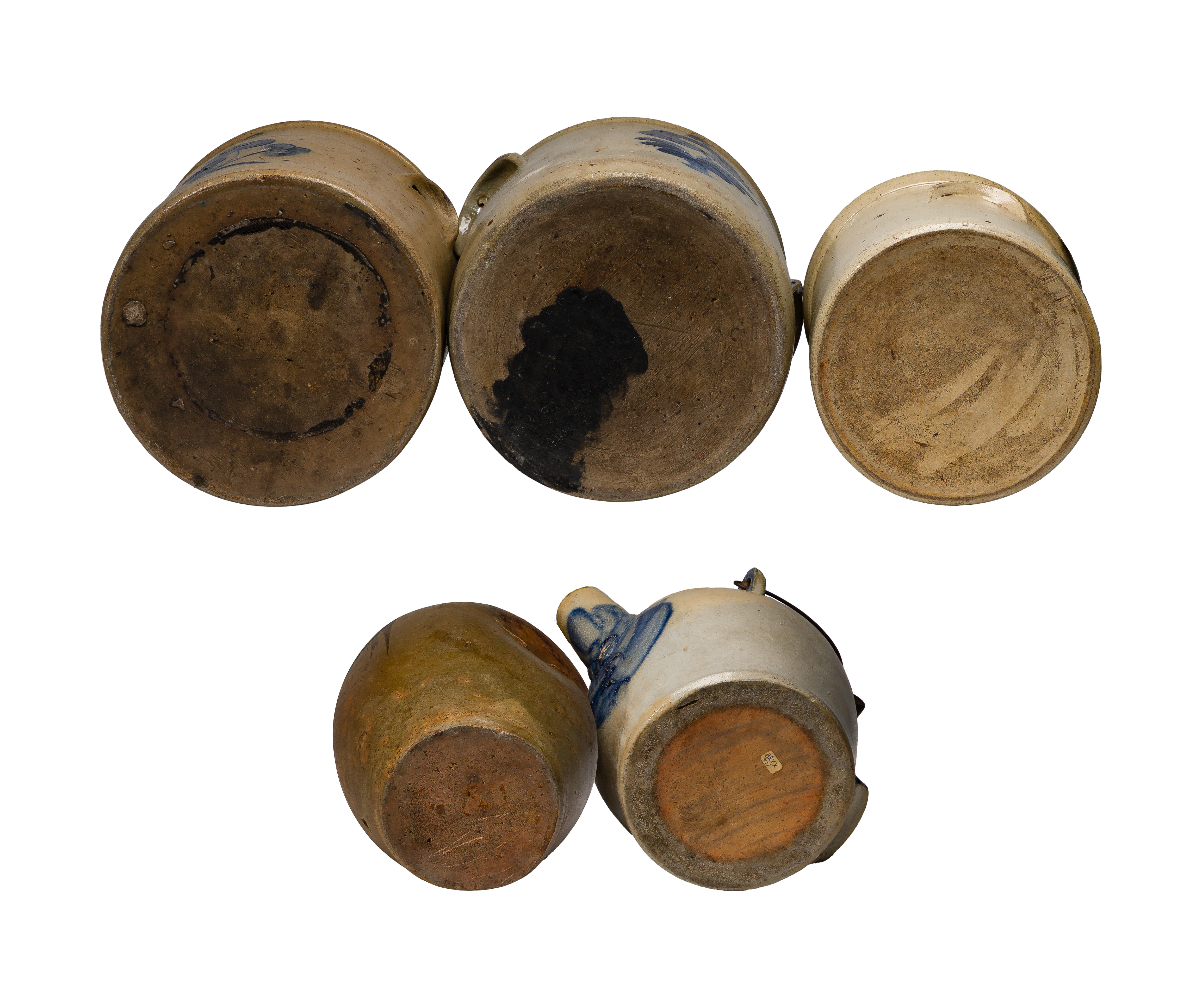 (5) items, all decorated in cobalt, including a batter / syrup jug having wood handle, spout and a turkey tail, a one handled jug, a gallon crock having two handles and an avian decoration, (2) two-gallon crocks, each having two handles and a rounded lip, all unmarked