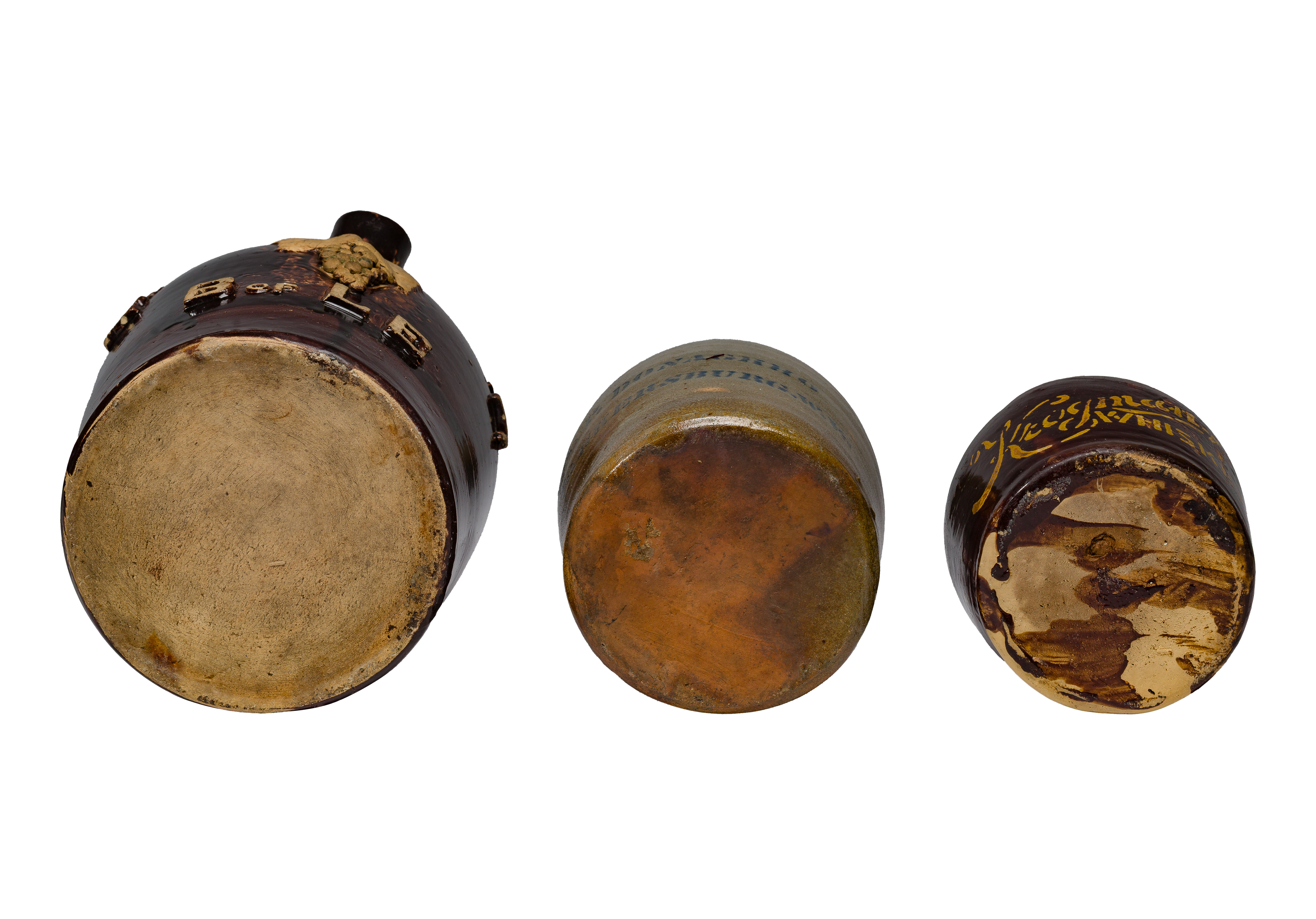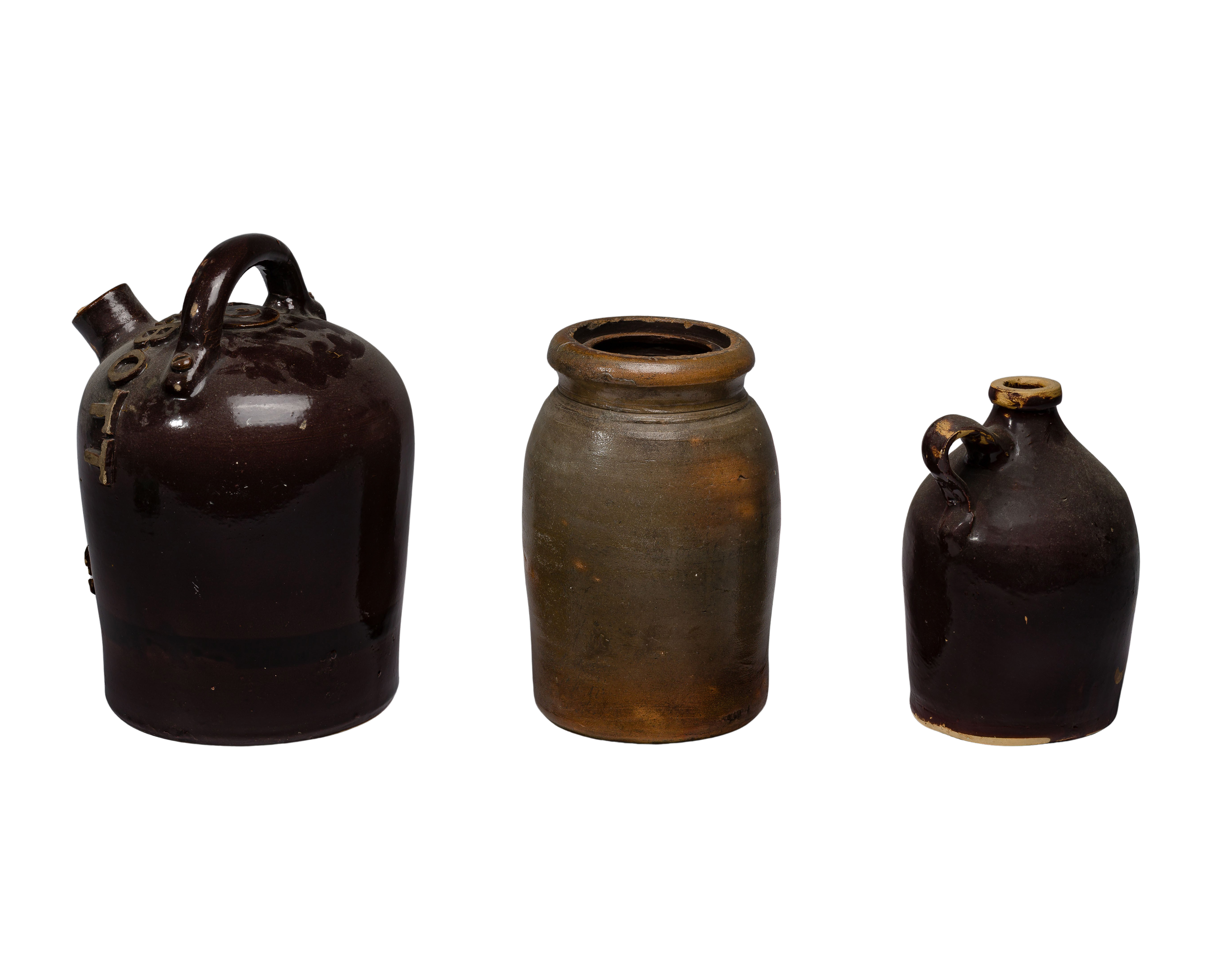 (3) items including a jug having spout, handle on top and a bunch of grapes on the front marked ‘R.D. Talbott B of LE’ (Brotherhood of Locomotive Engineers), a brown jug labeled ‘Krogman Whiskey’ in yellow and a marked ‘A. P. Donaghho’ salt glazed crock
