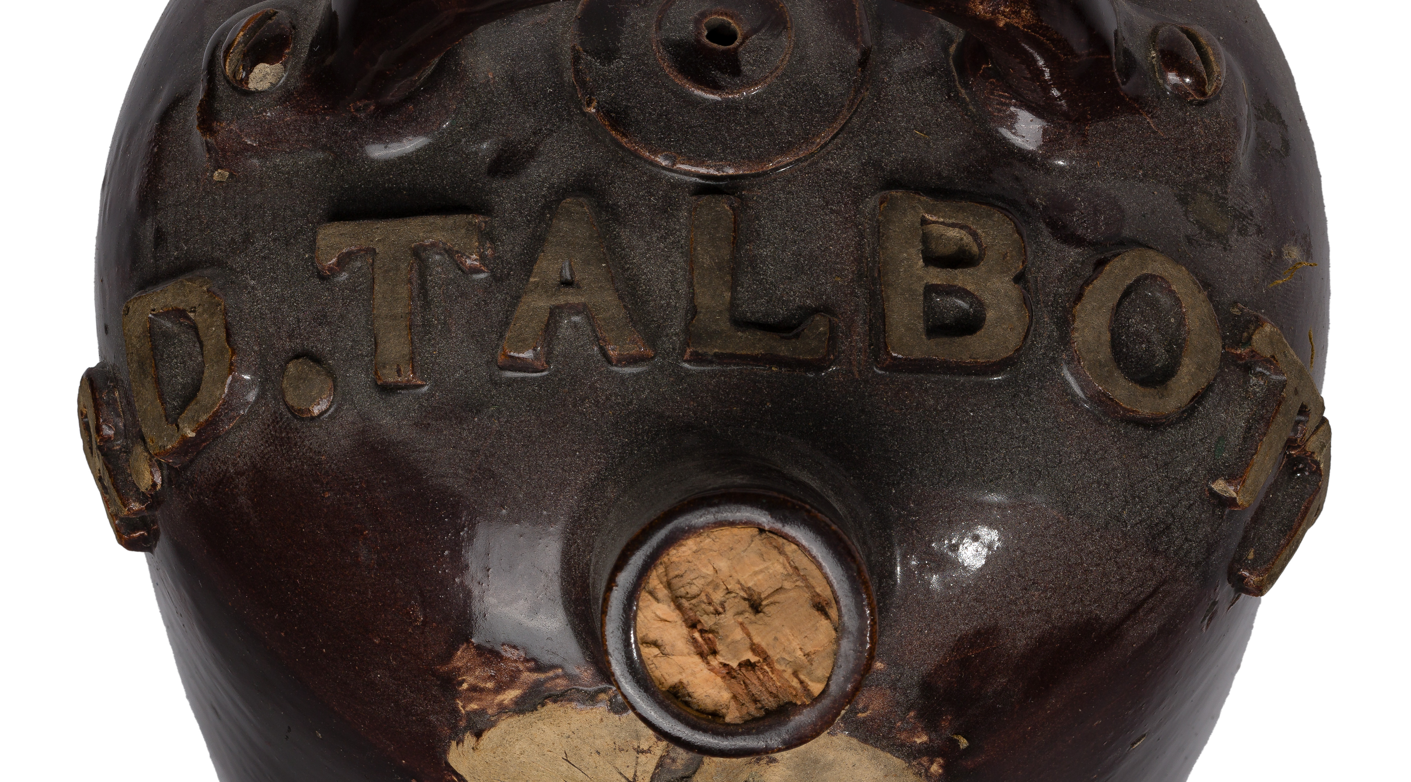 Condition: overall light to moderate wear consistent with normal use, chips, nicks scratches, areas of missing glaze, stains overall, Talbott having a broken cork in spout, Krogman having smeared glaze on front