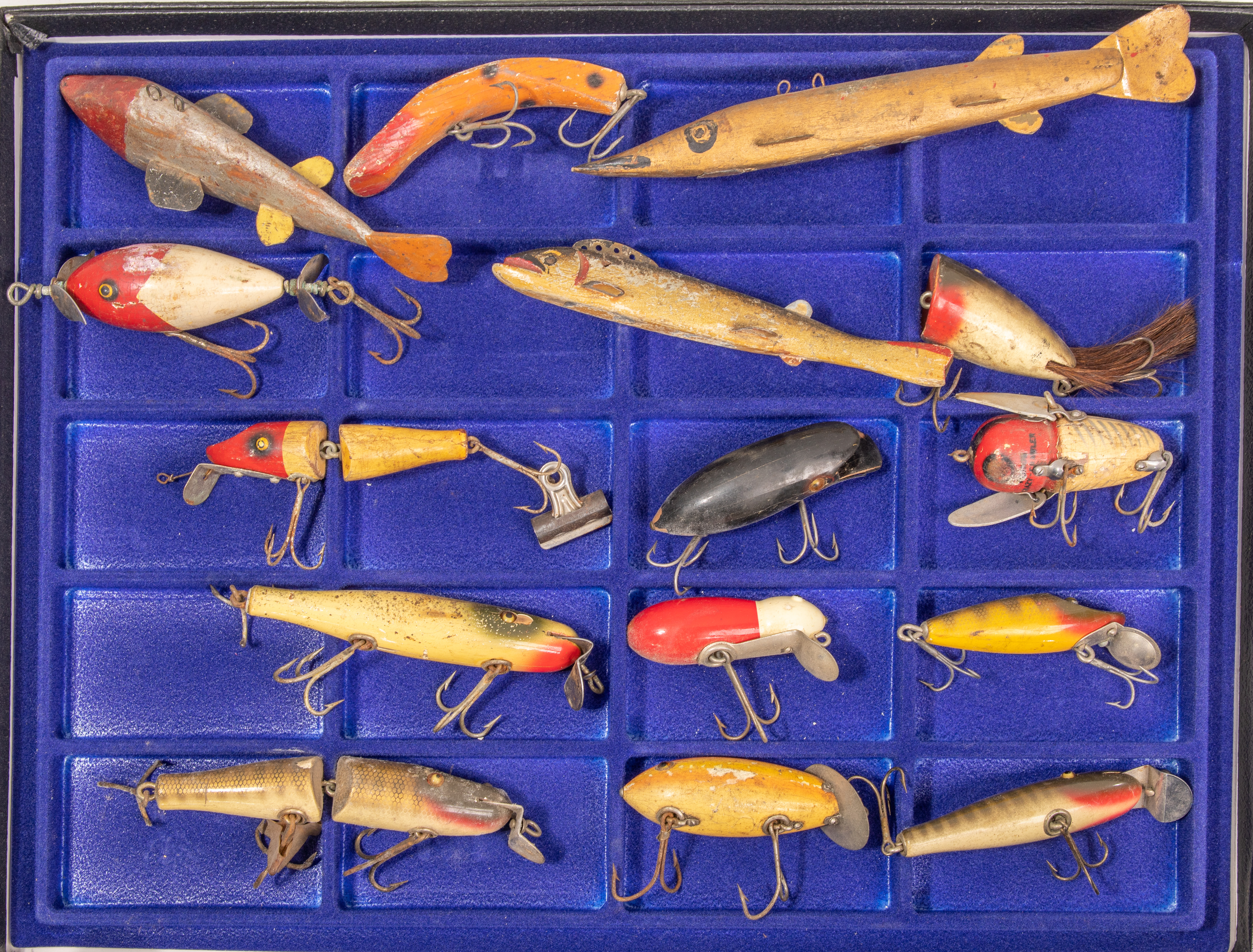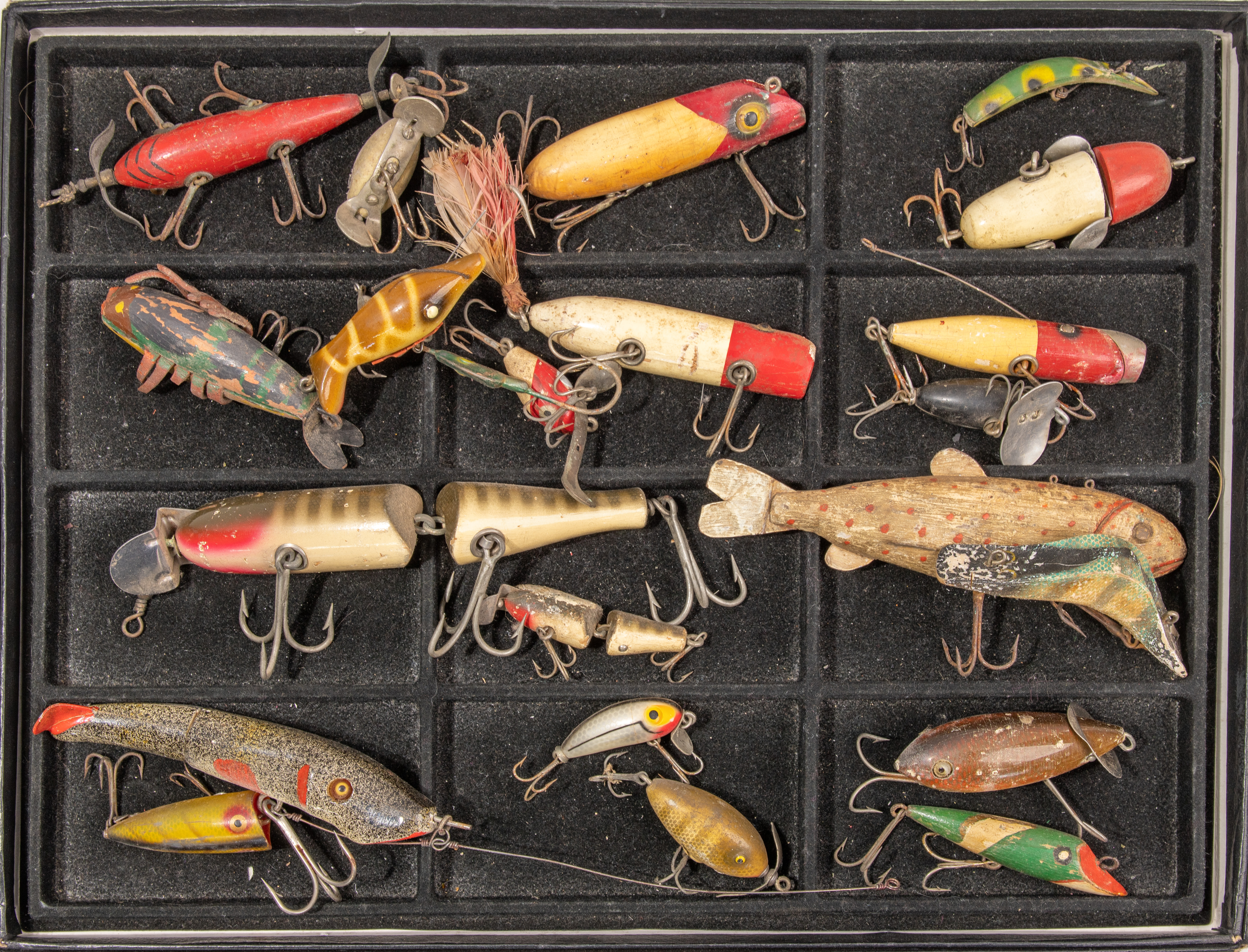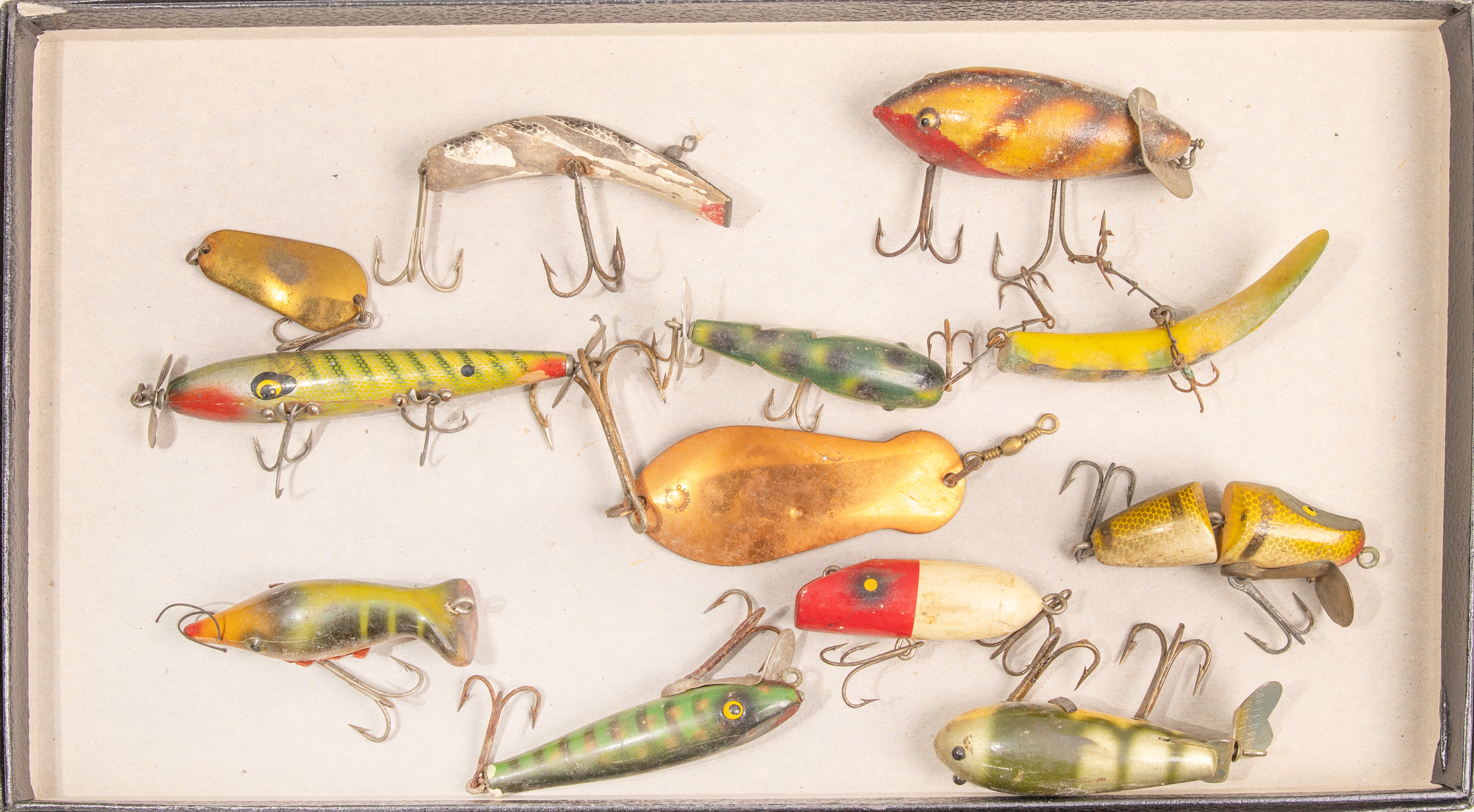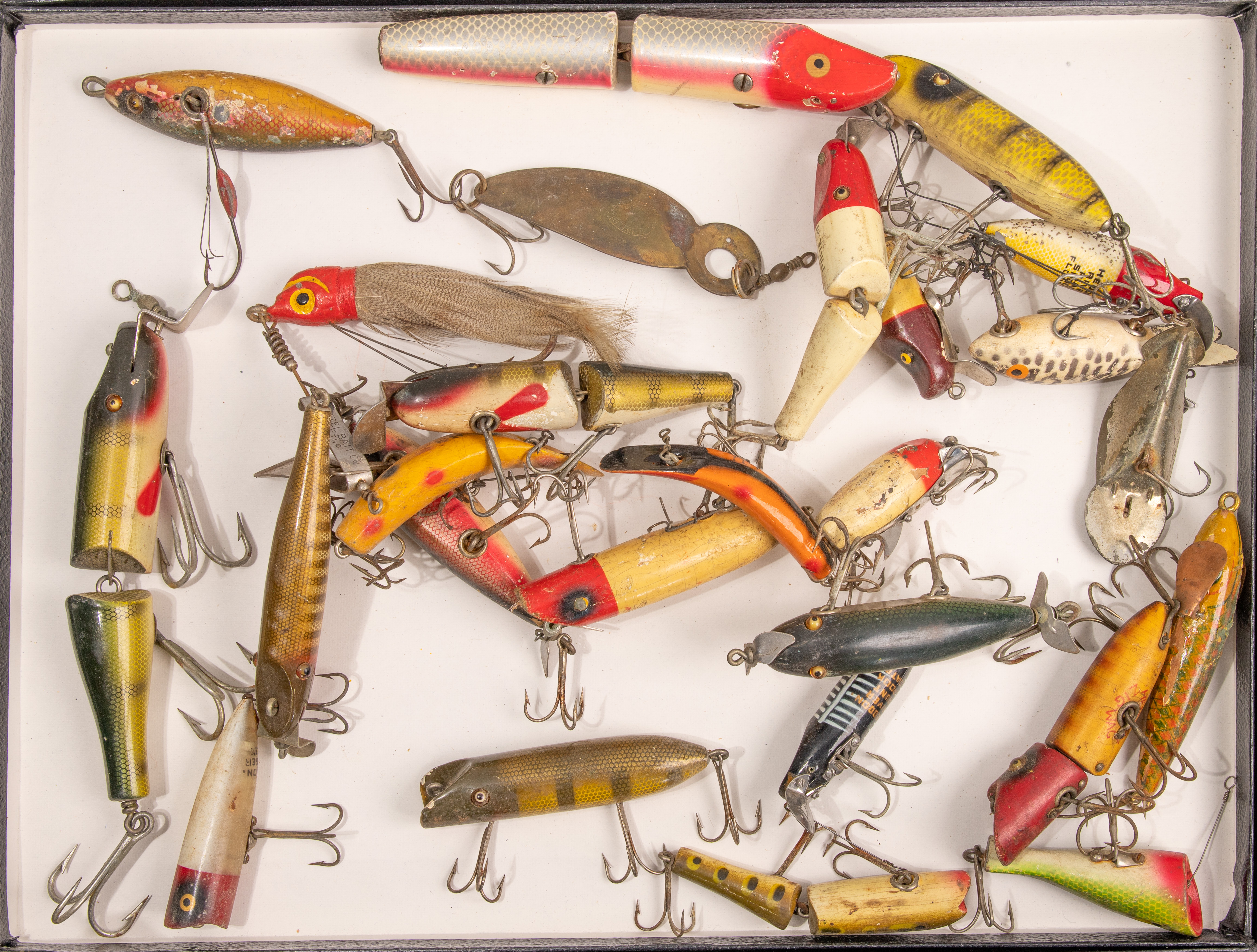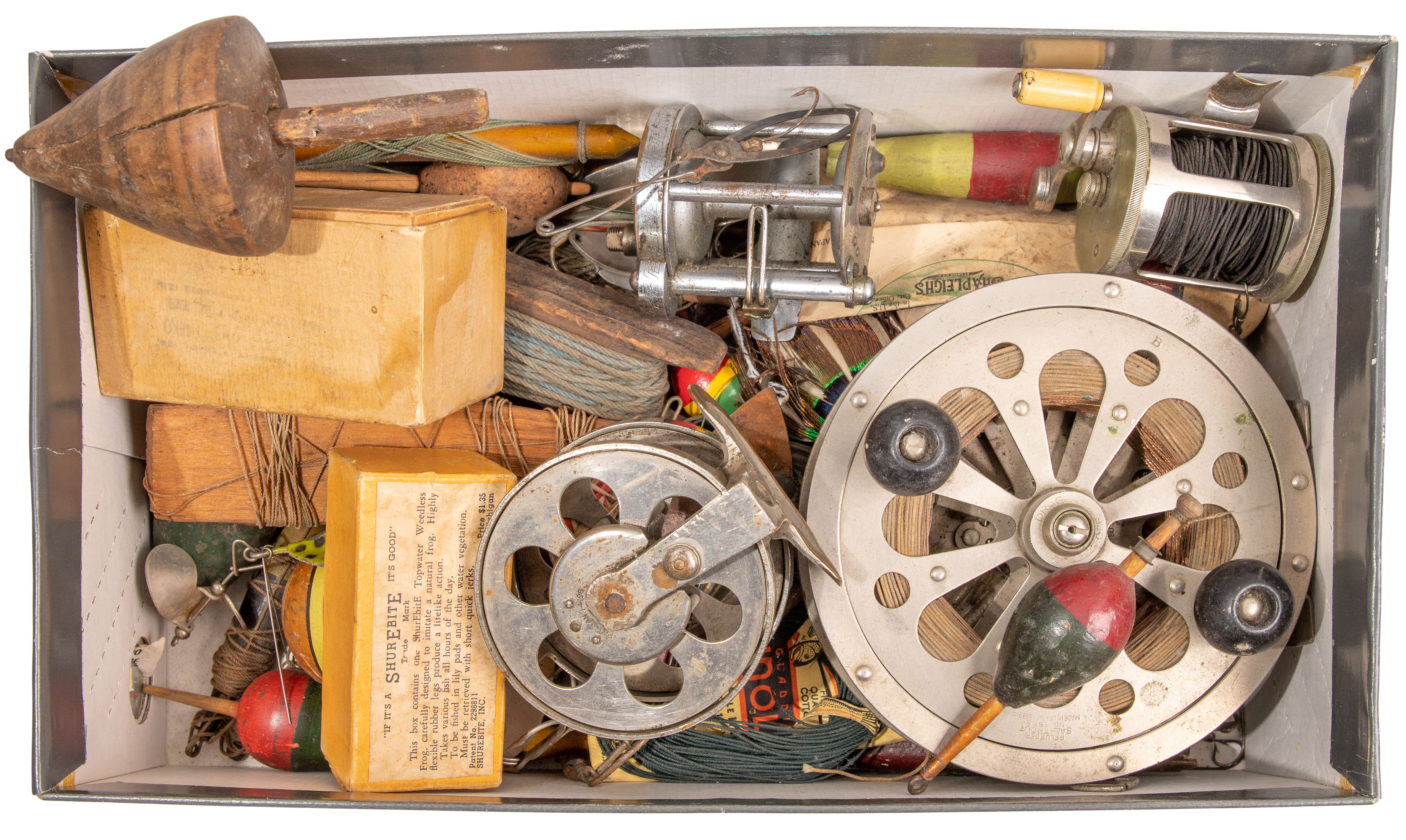 Including approximately (65) fishing lures from Heddon and other makers, a B. F. Meeks & Sons No.33 reel, a Shurebite frog with box, a Deep-O-Bob with box and an assortment of accessories