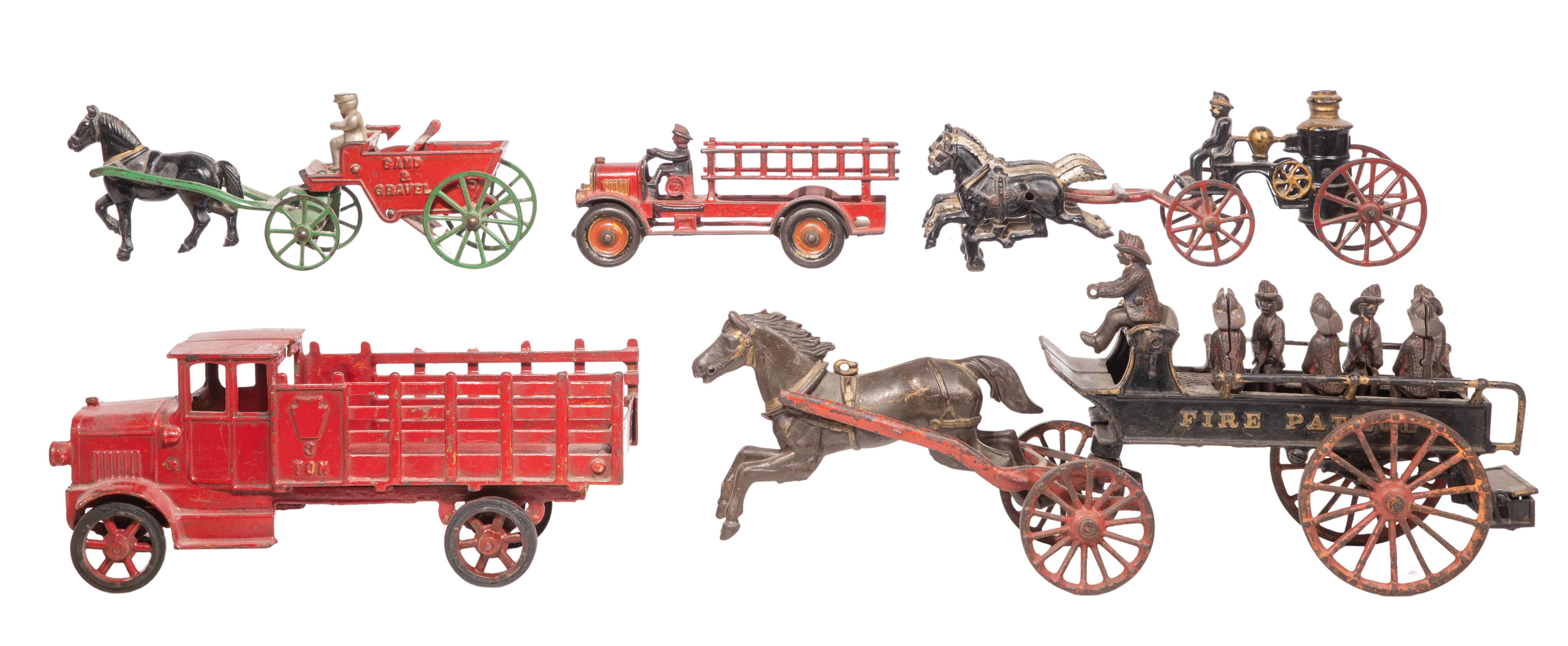 (5) items including a Packard 3-ton dump truck, a Hubley ladder truck, an Ives horse drawn fire squad wagon, a horse drawn fire pumper and a horse drawn dump cart