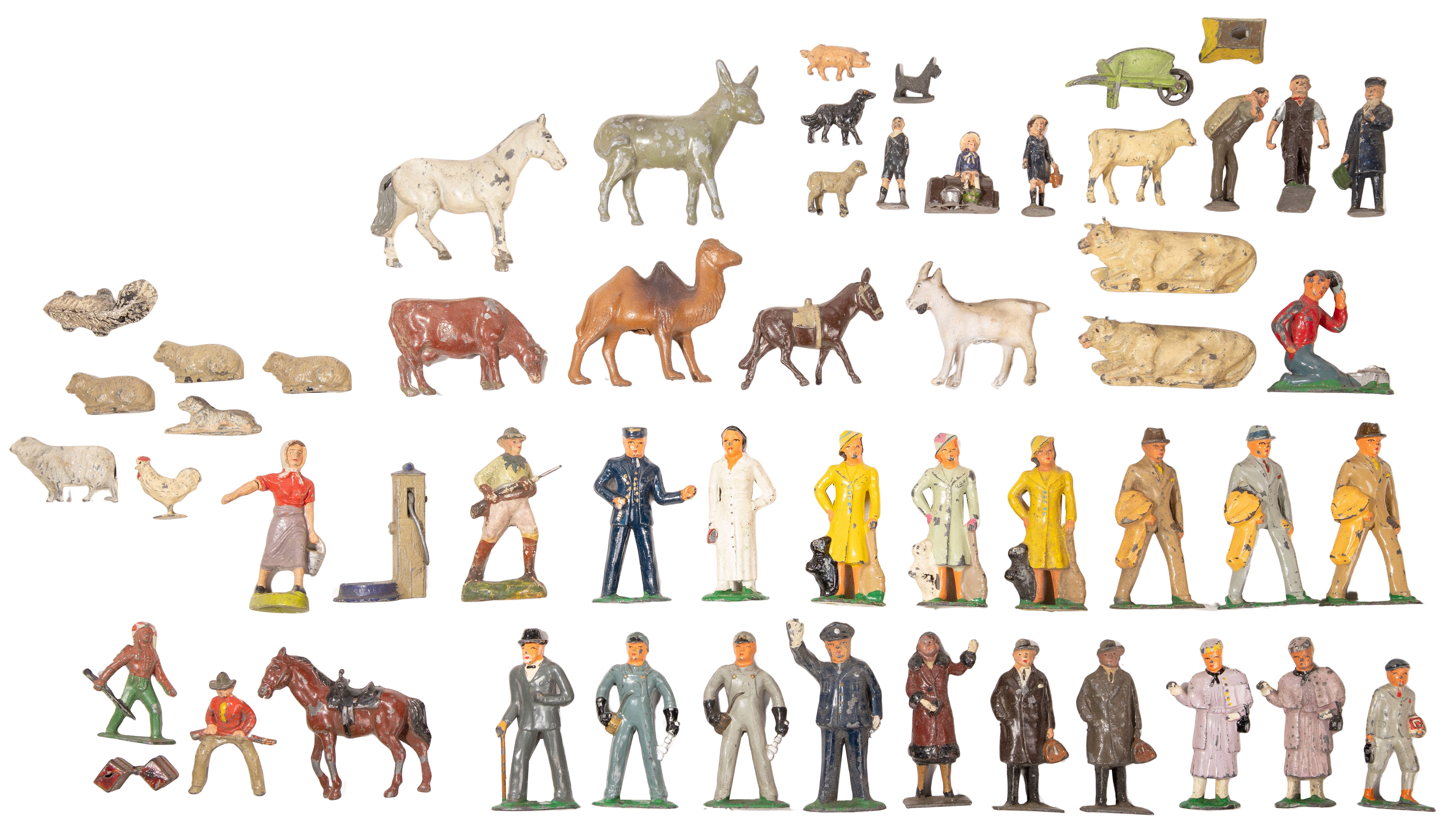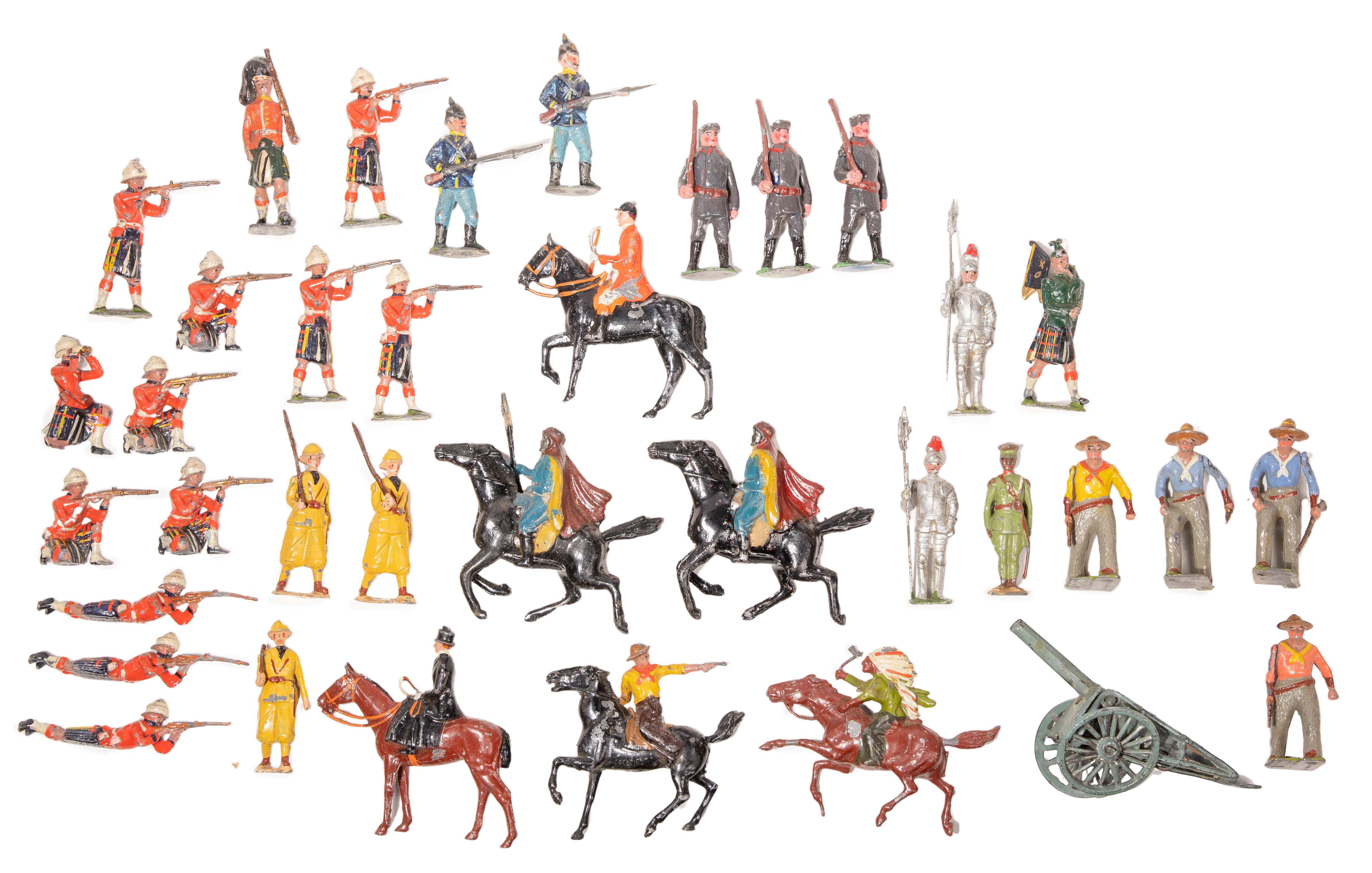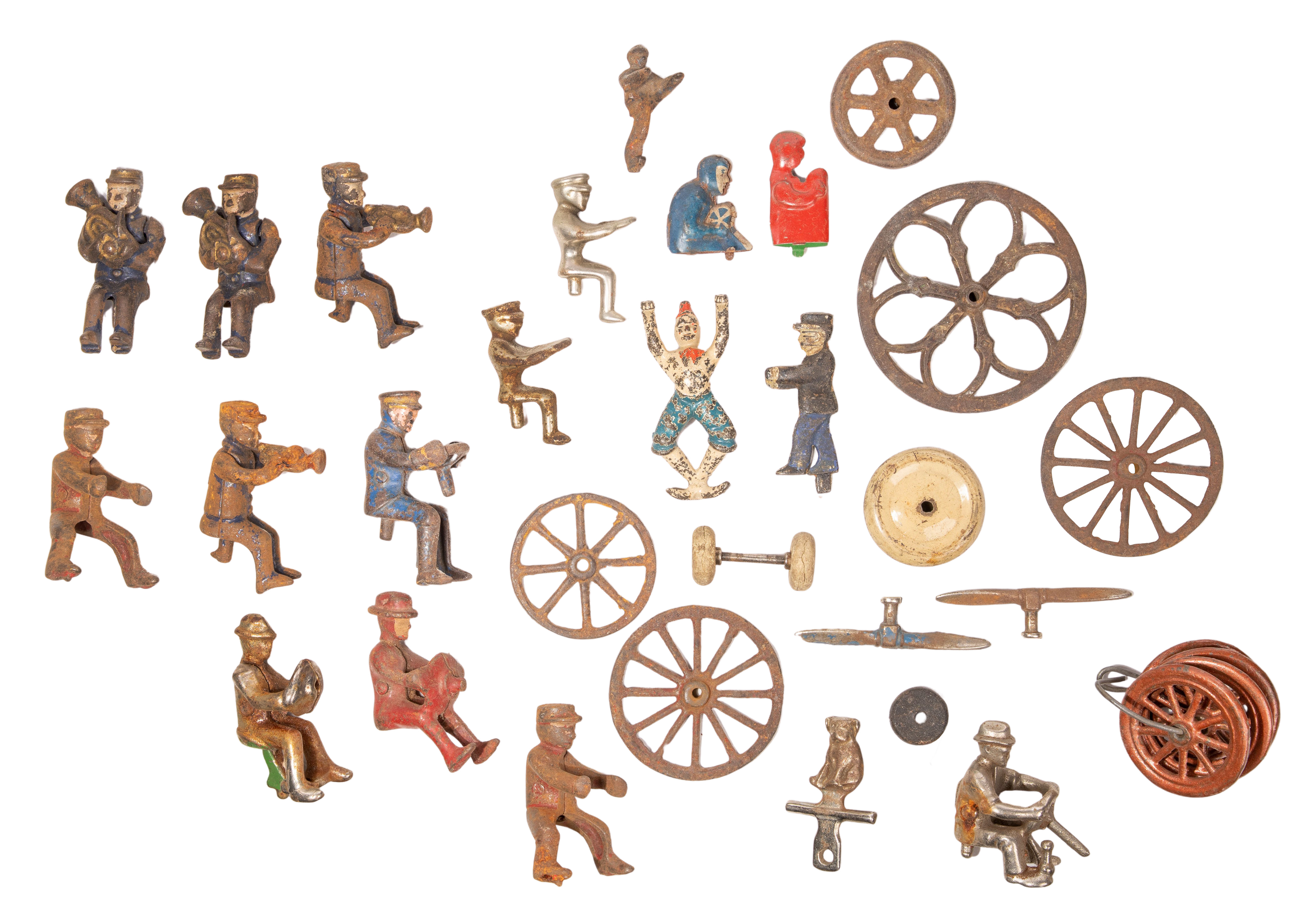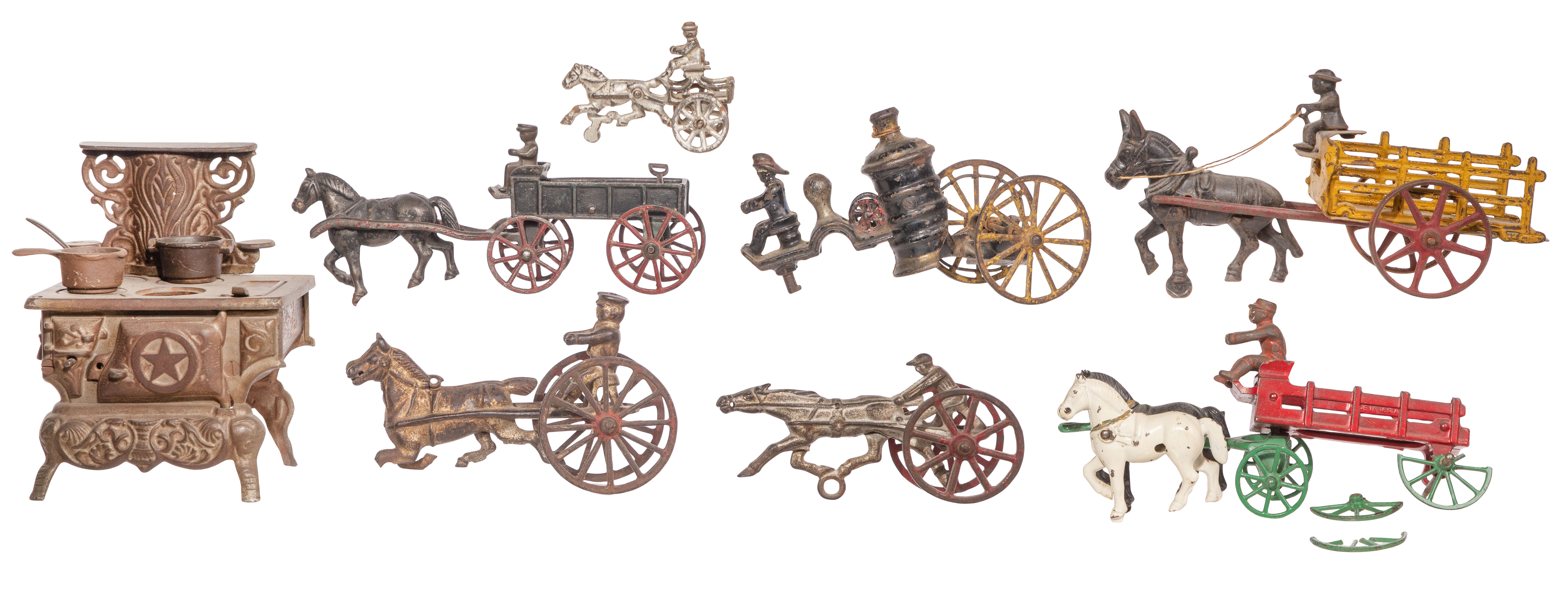 Approximately (150) items including horse drawn cars, a sample stove, toy soldiers and a box of random cast iron parts and pieces