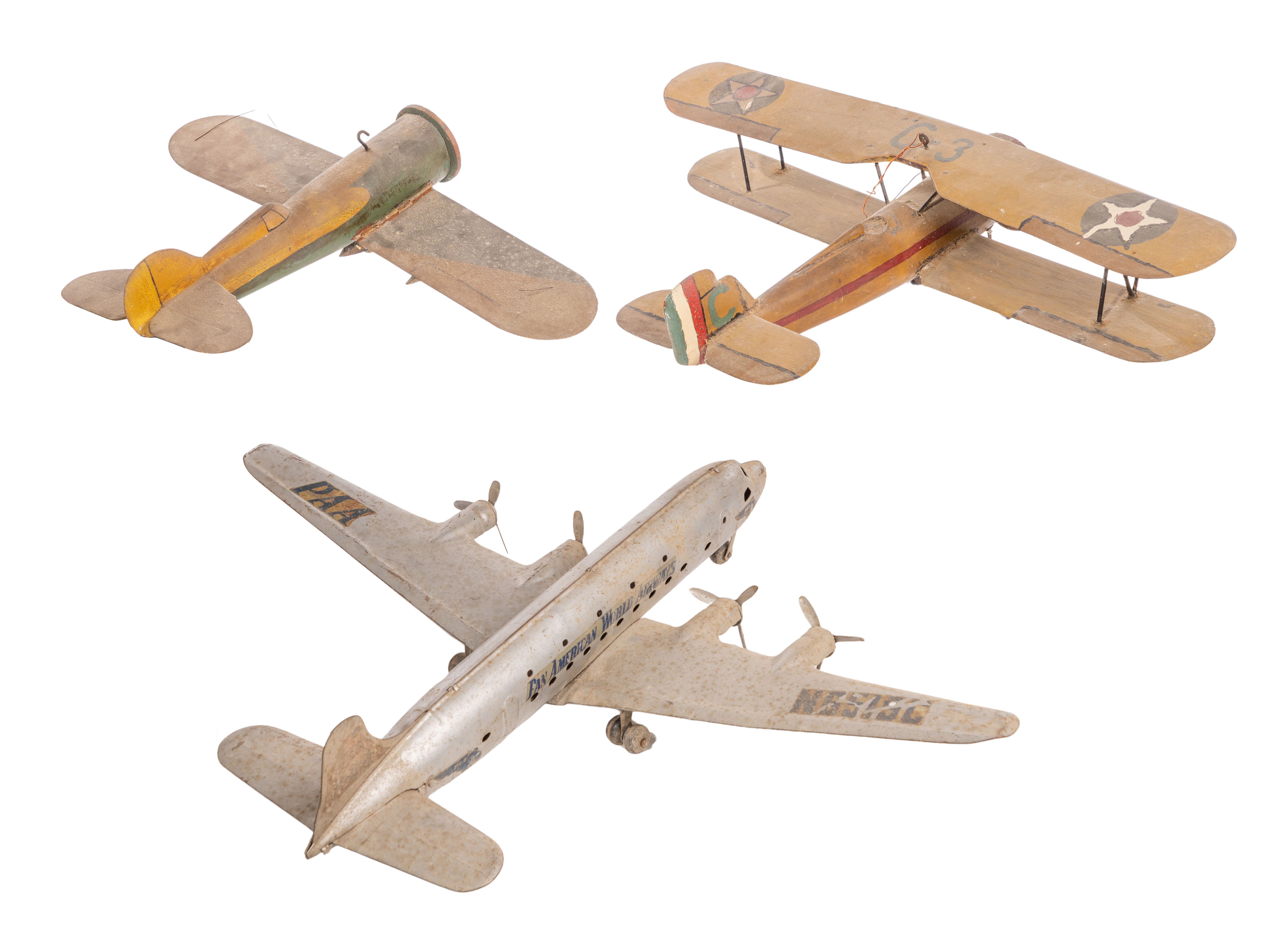 (3) items including a Marx pressed metal DC4 Pan Am toy airplane having original decals, wood airplanes including a bi-wing stamped ‘Invader’ on propeller and a fragmented fighter plane