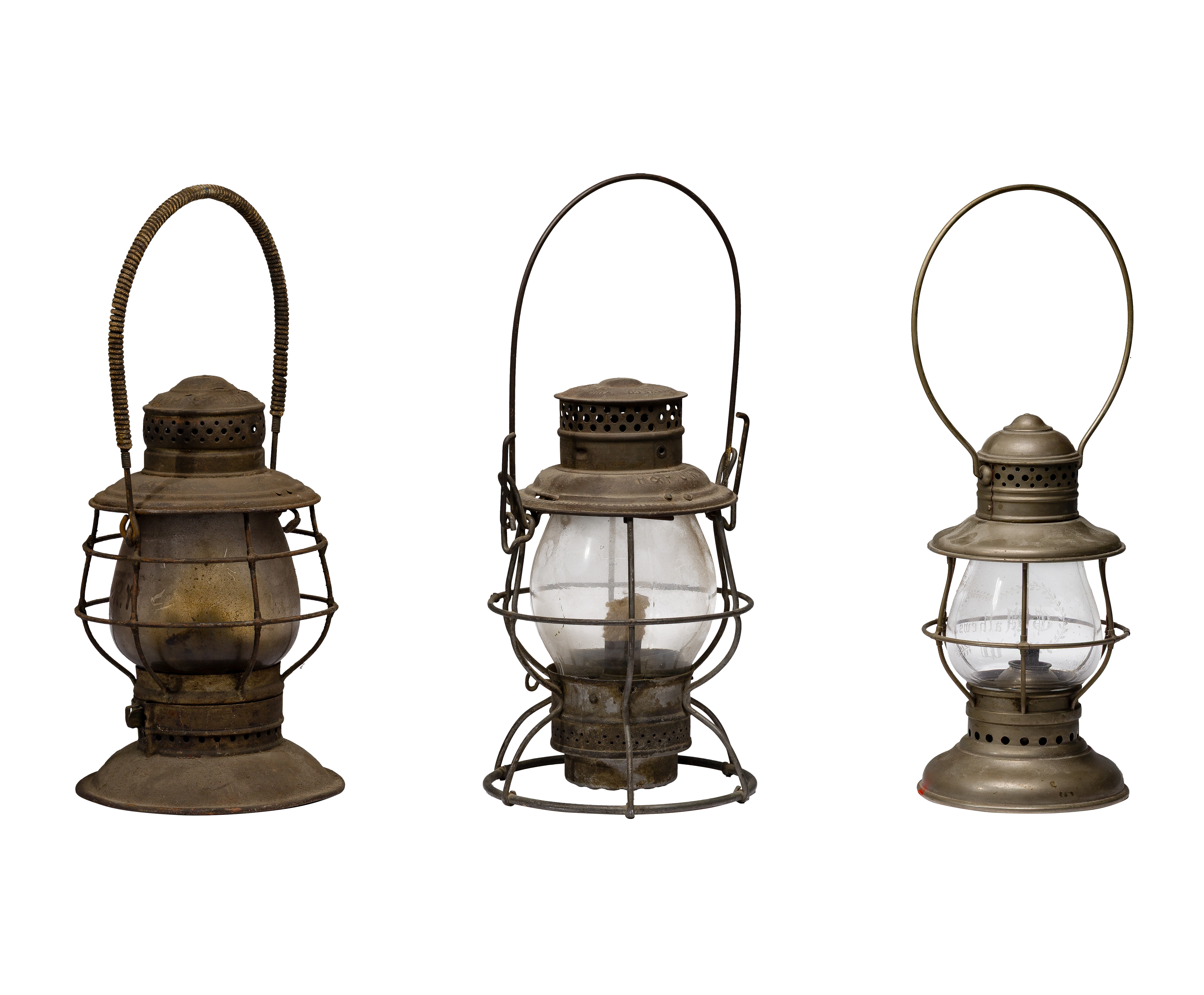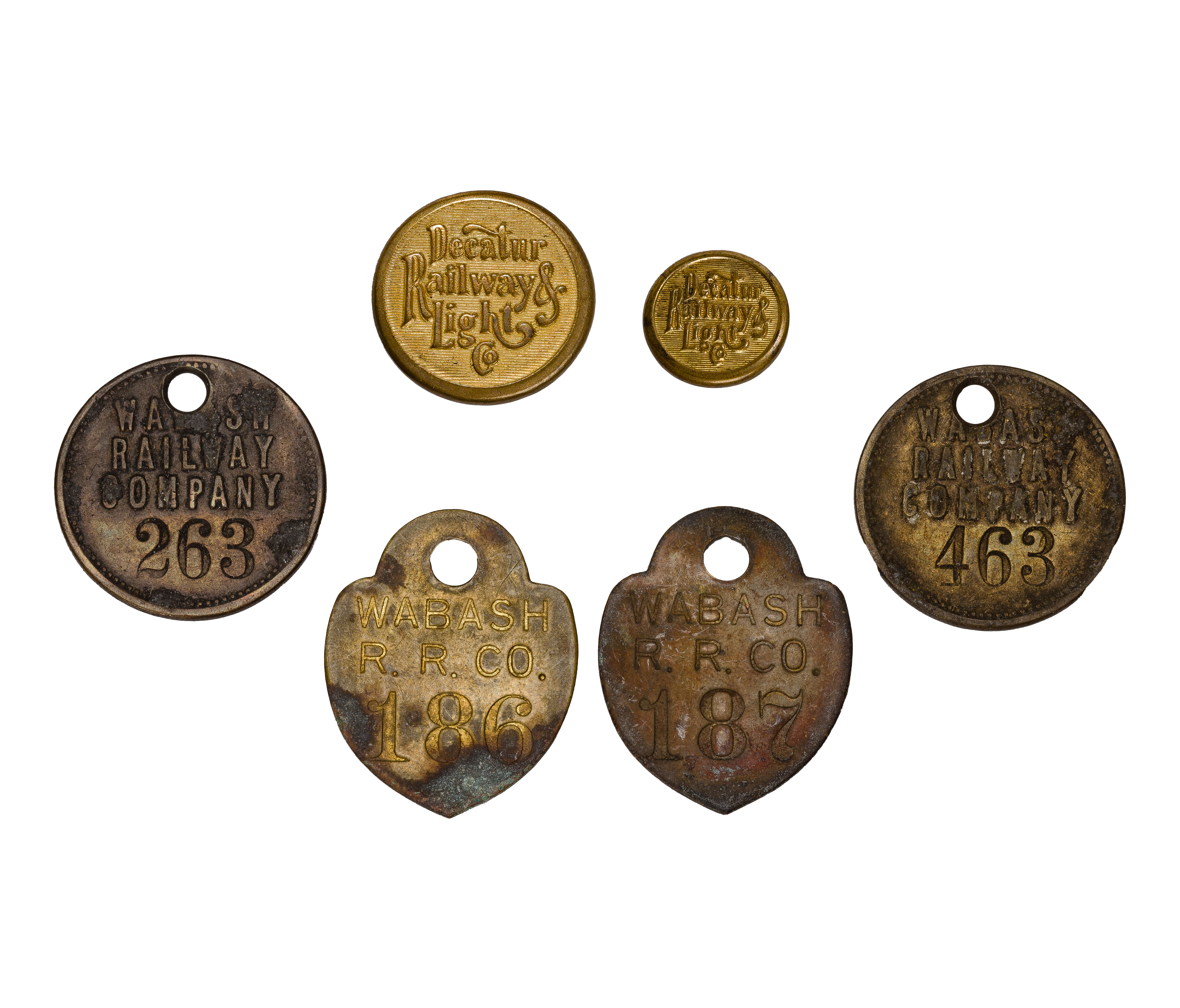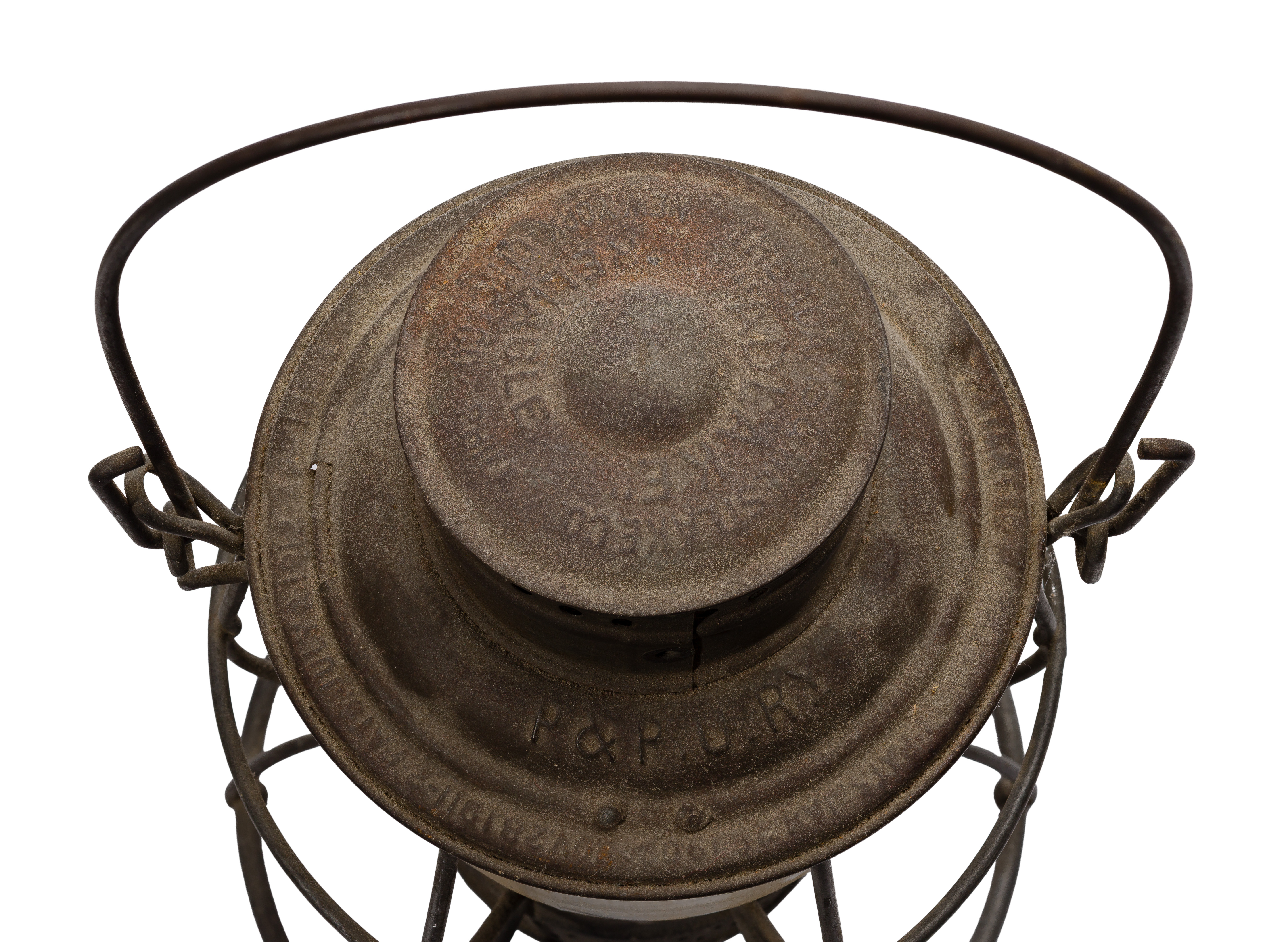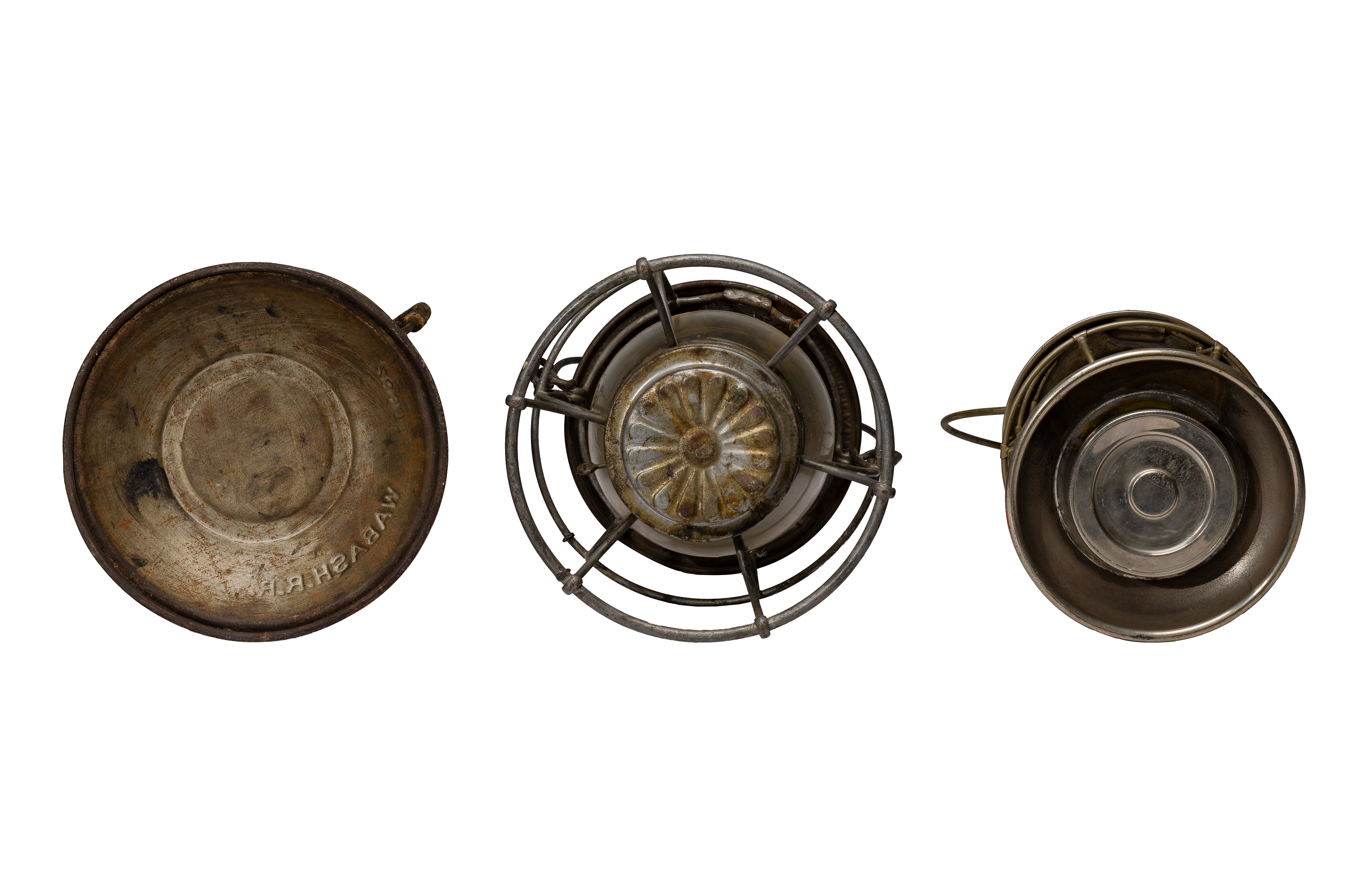 (9) total items including a Handlan and Buck lantern body embossed ‘Wabash R. R.’ with a glass insert marked ‘C. & P. R. R.’, an Adam and Westlake lantern having ‘P & P U. R. Y.’ embossed on body and an unmarked lantern having an etched and monogrammed glass insert; together with buttons and railroad tokens