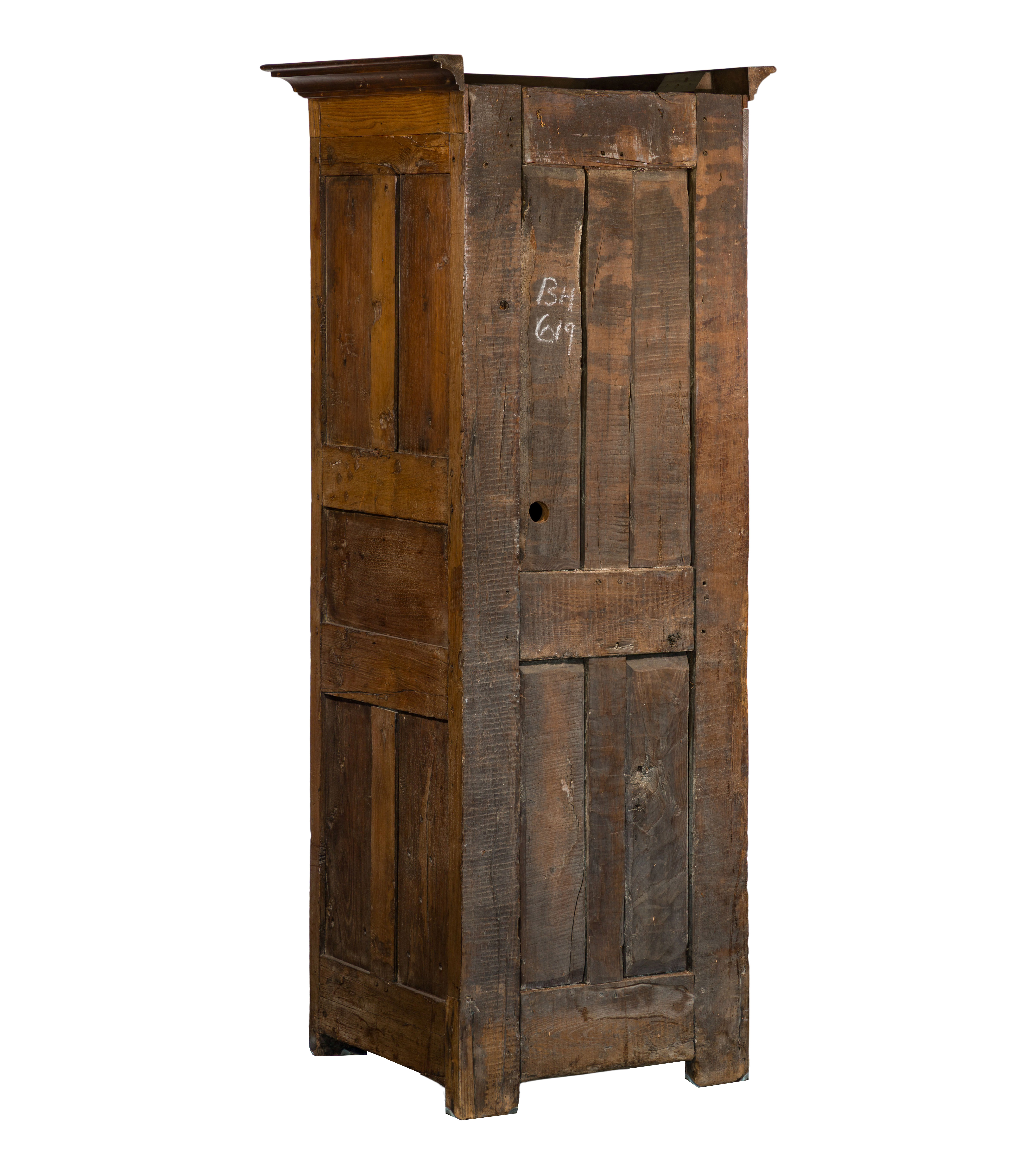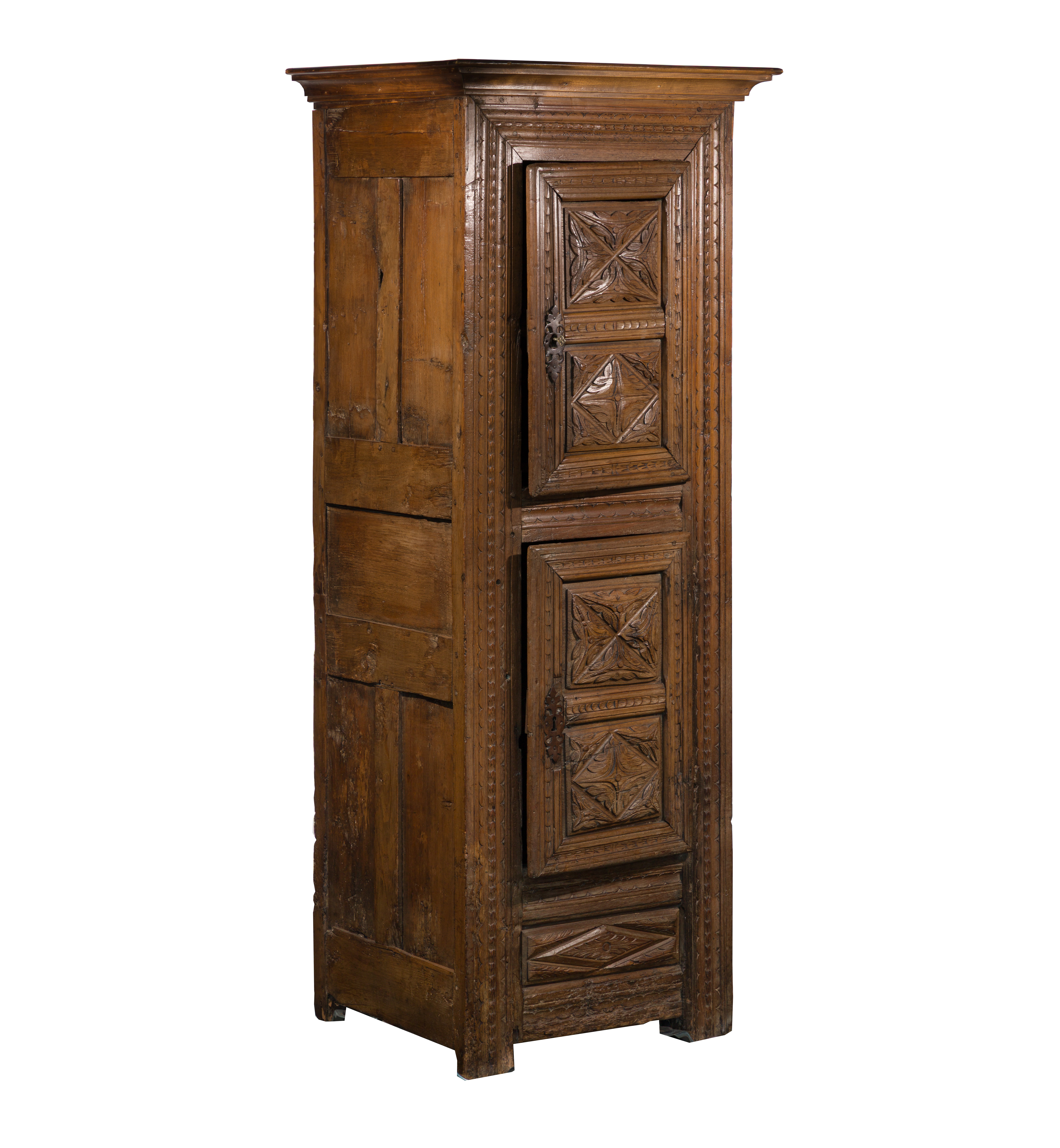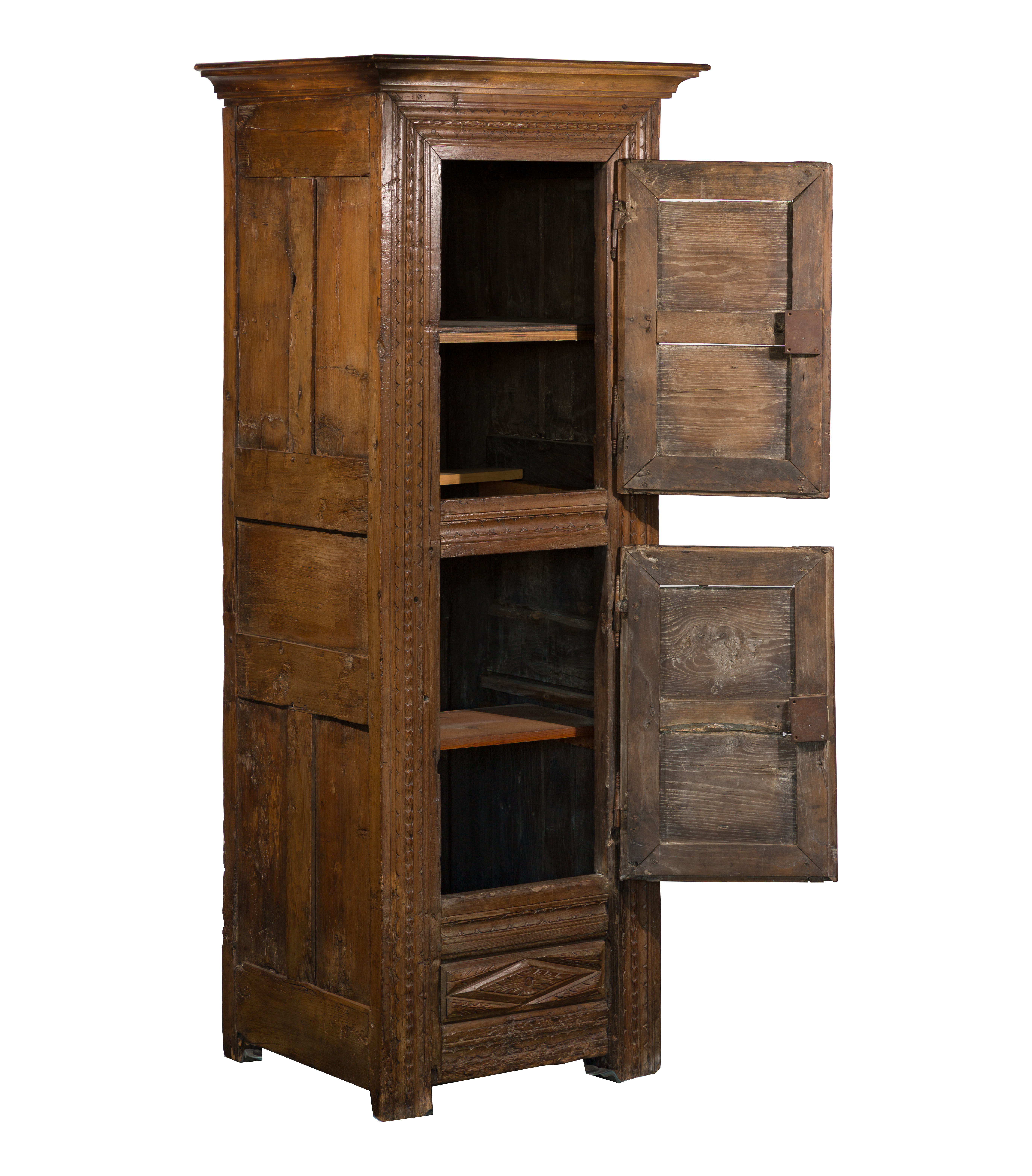 Constructed of carved and chamfered panels, pegged together with wood pins, having two locking doors including a key