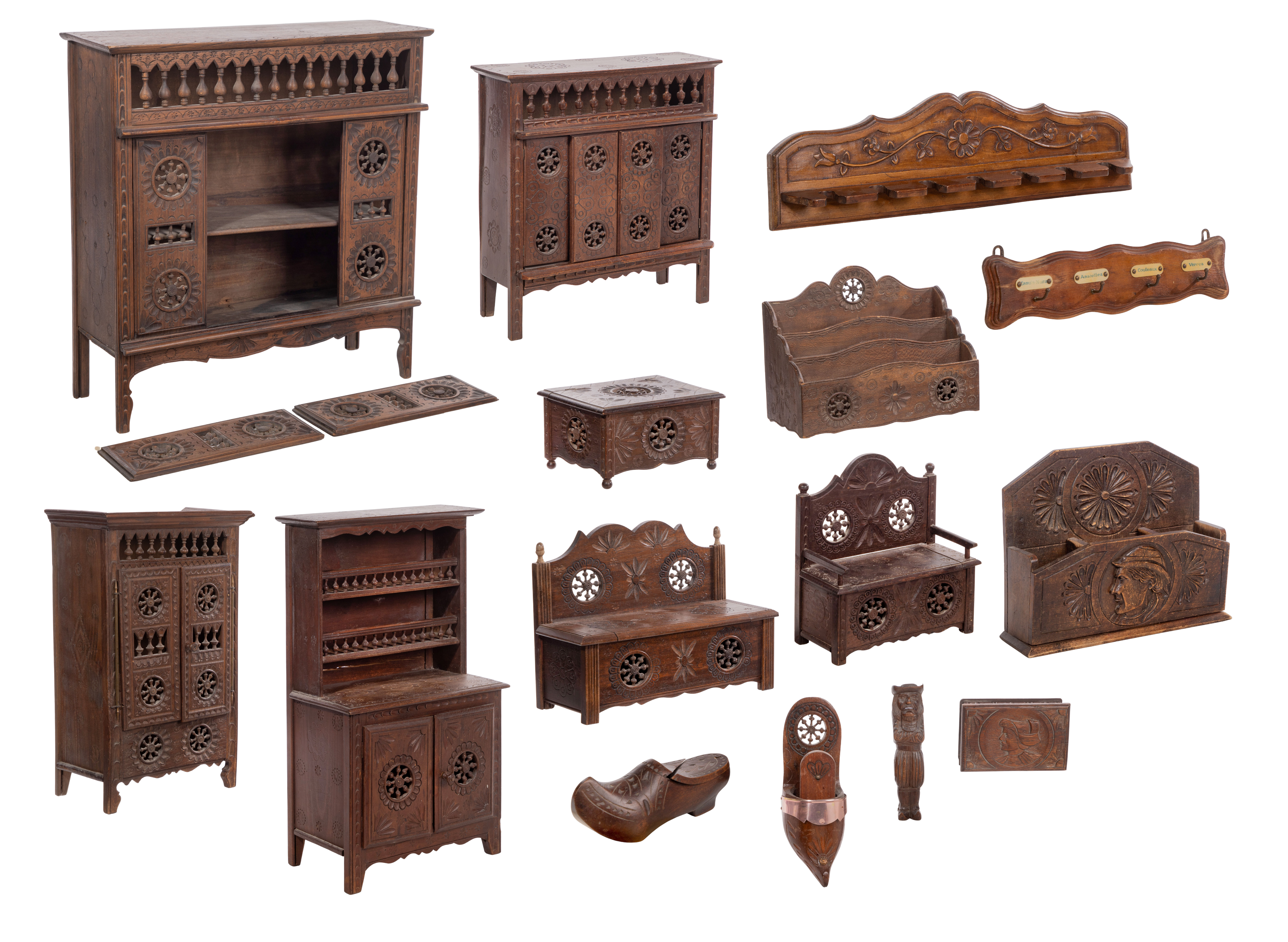 (15) total pieces including diminutive pieces from Brittany, France, having hand-carved designs in classic symbols such as pinwheels, ball and stick and incised flowers; together with wall hooks, desk items and shoe maintenance items