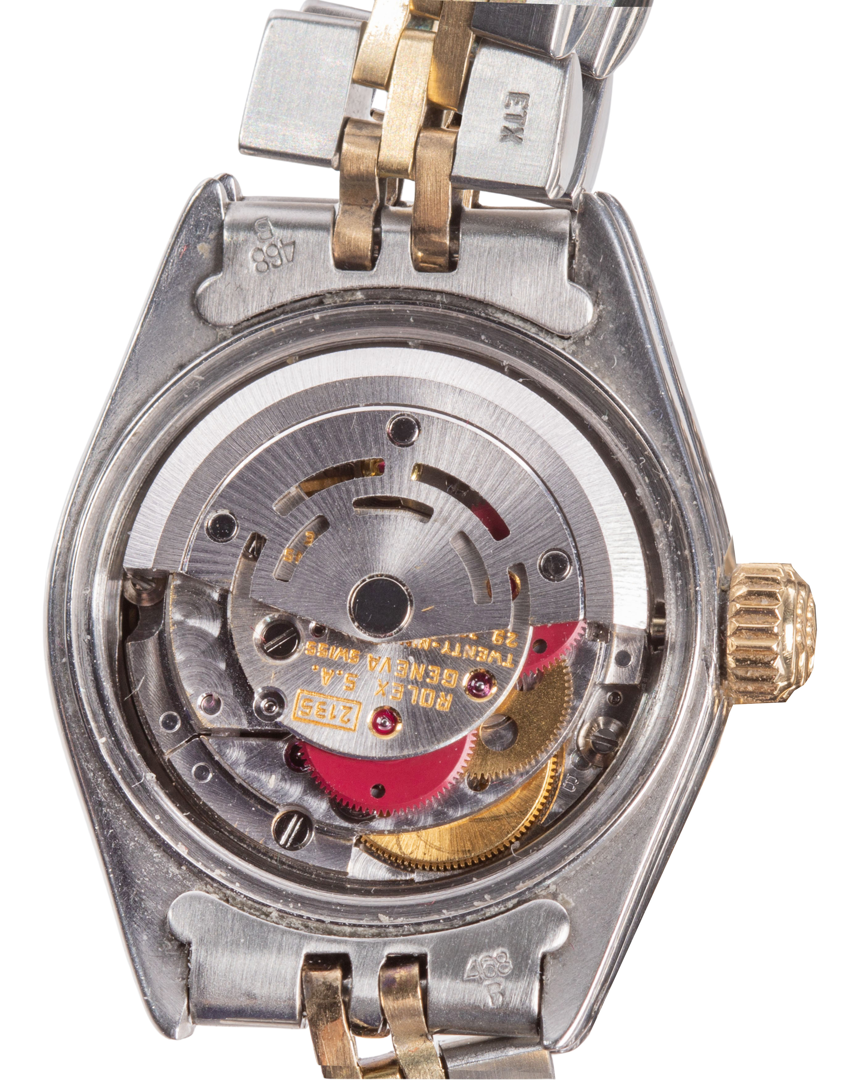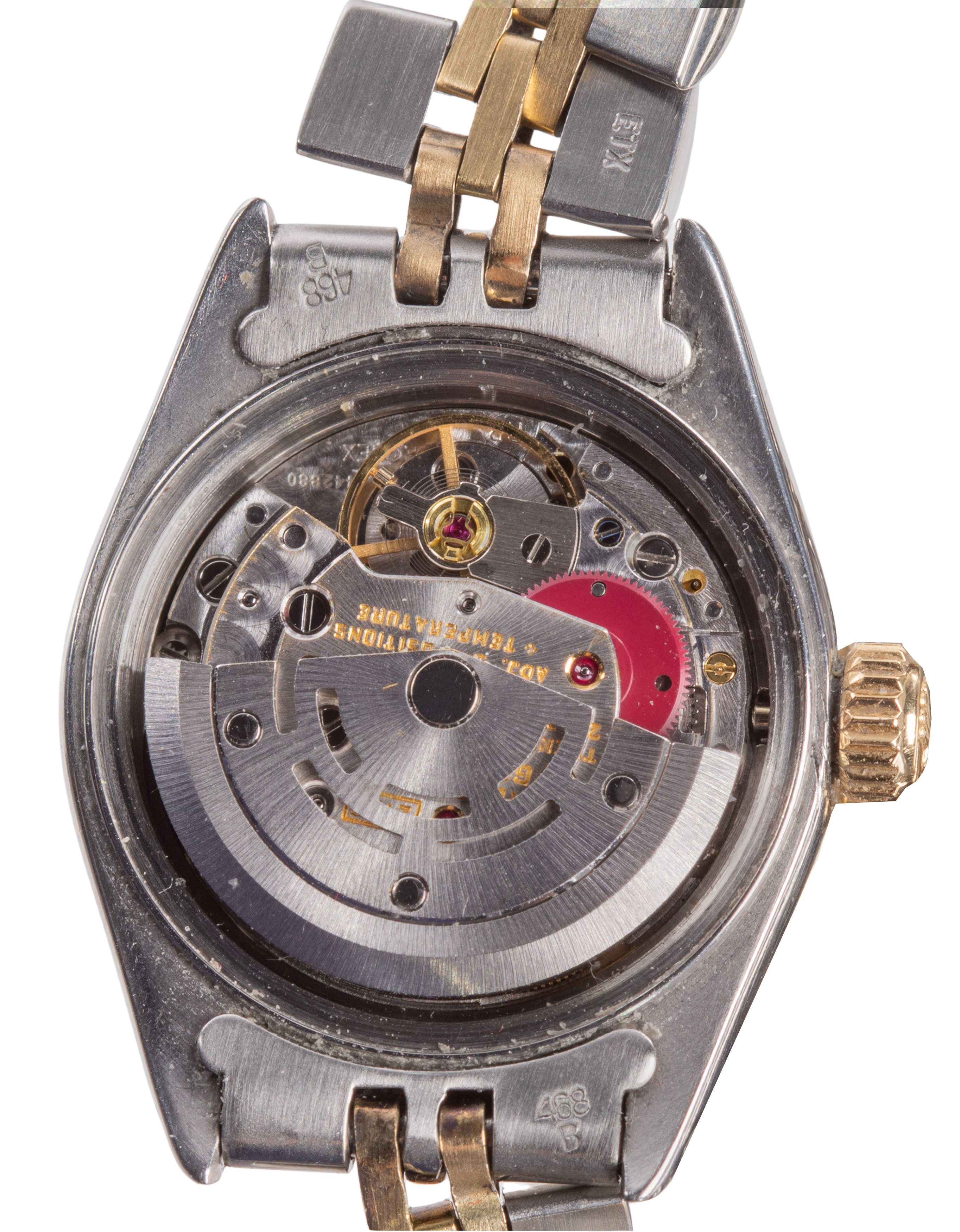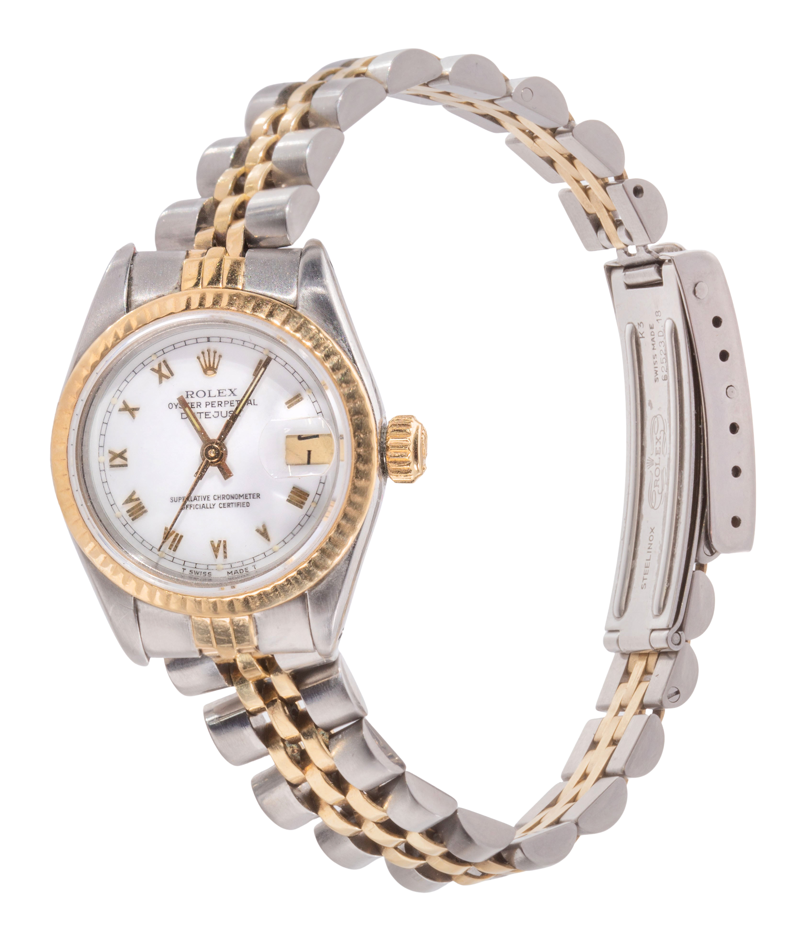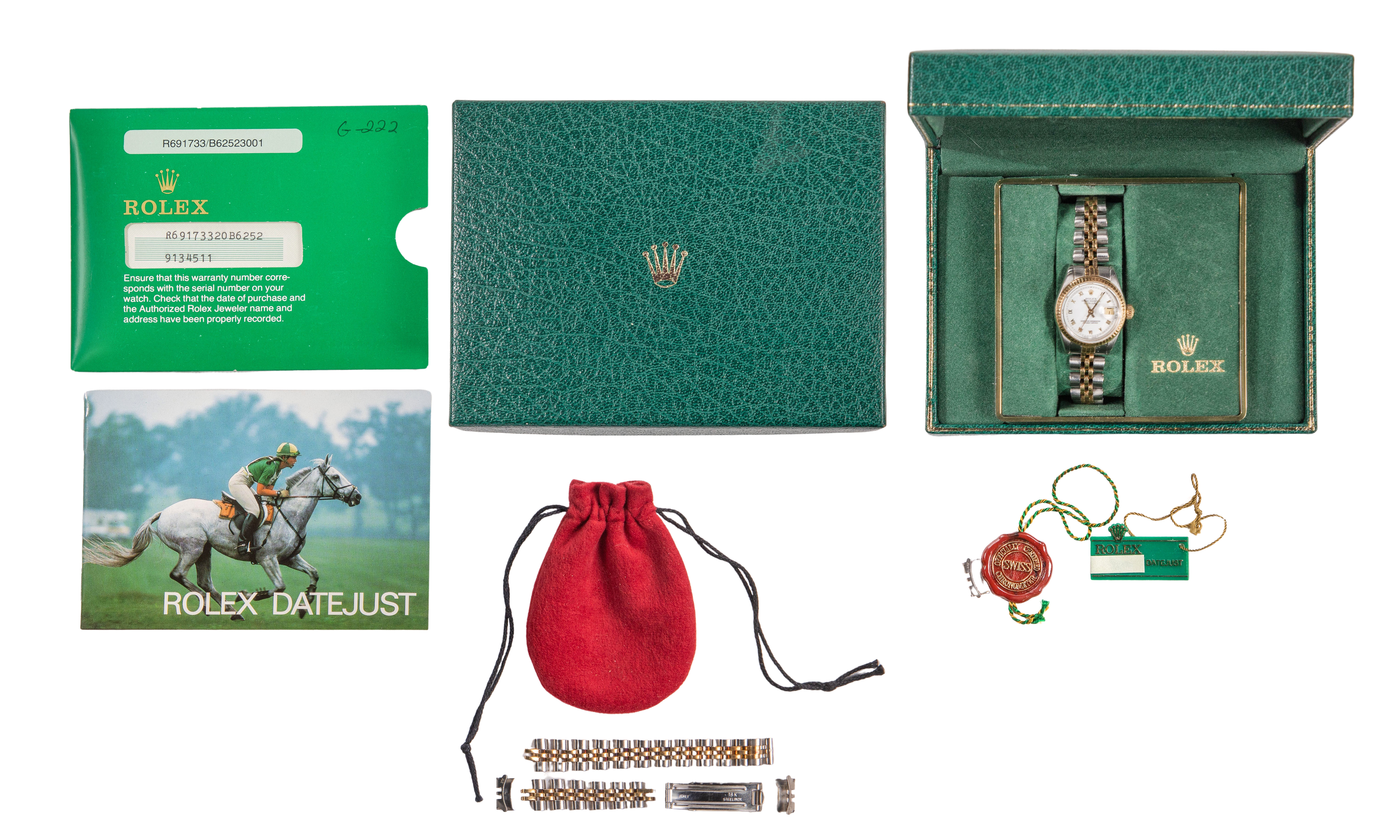 Serial #9134511 having a gold fluted bezel and stainless steel case, white tone dial, tapered hands, stick indexes, magnification date window at 3-o’clock, marked crown, a jubilee steel and gold band having a deployment clasp, including original boxes, tags extra links and paperwork