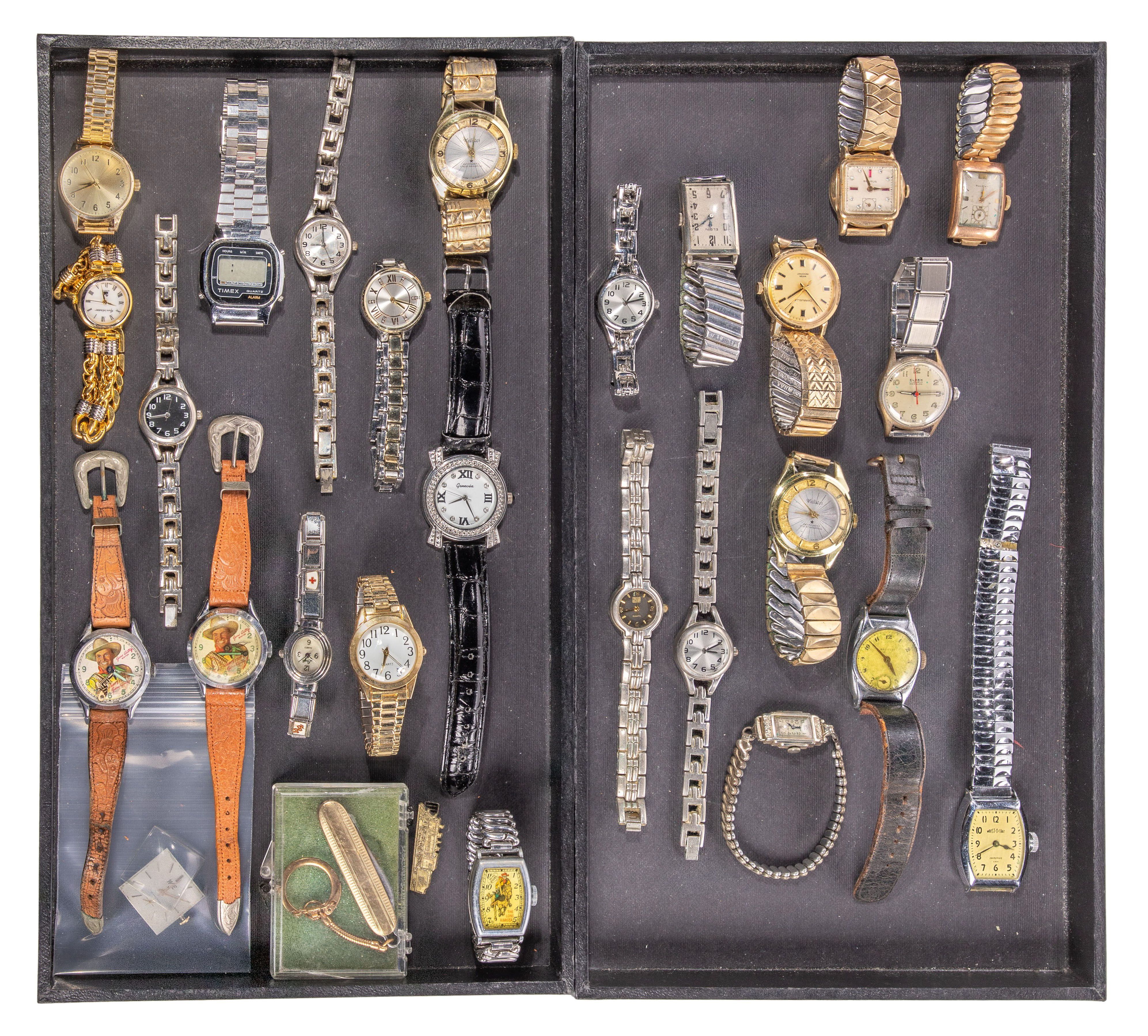 (28) total items including (2) Gene Autry, a Roy Rogers as well as Elgin, Bulova, Caravelle, having various styles of bands, some marked; together with a tie clip, pocket knife and watch parts
