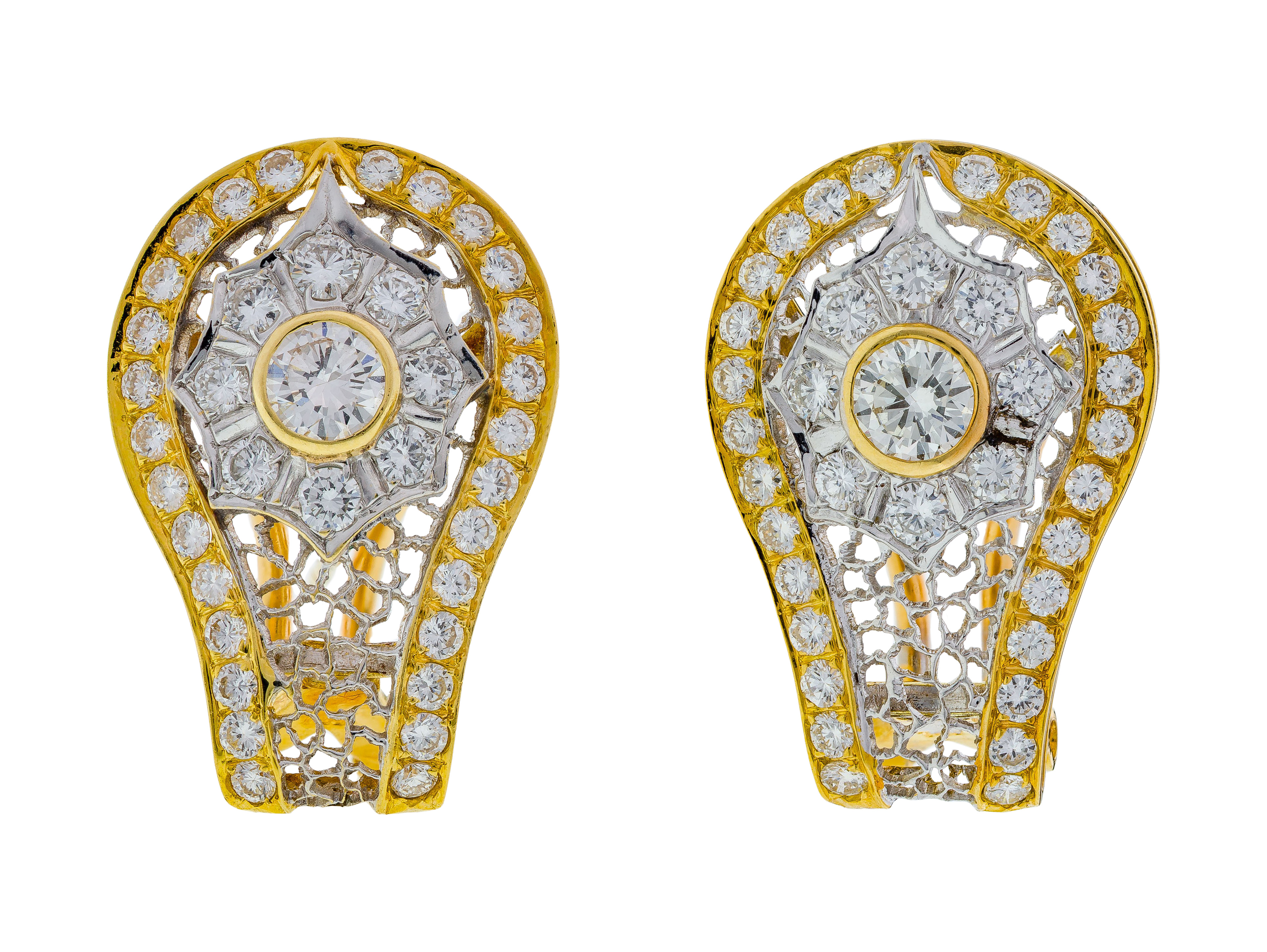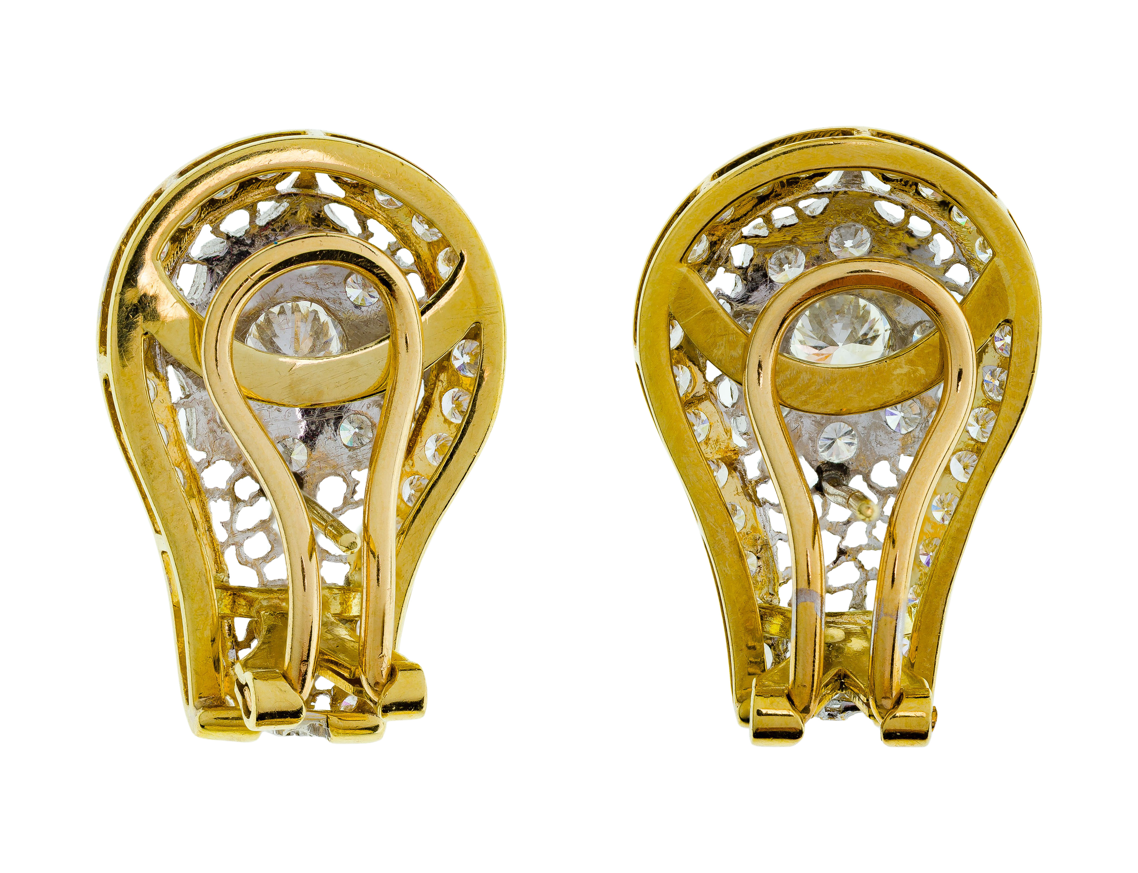 A pair of French clip style, each having round cut diamonds throughout, including a central round cut diamond weighing approximately 0.33 carat and surrounded by eight round cut diamonds within an eight-pointed star on an openwork back within a loop of channel set diamonds, each weighing approximately 1.07 carats total (marked ‘750’)