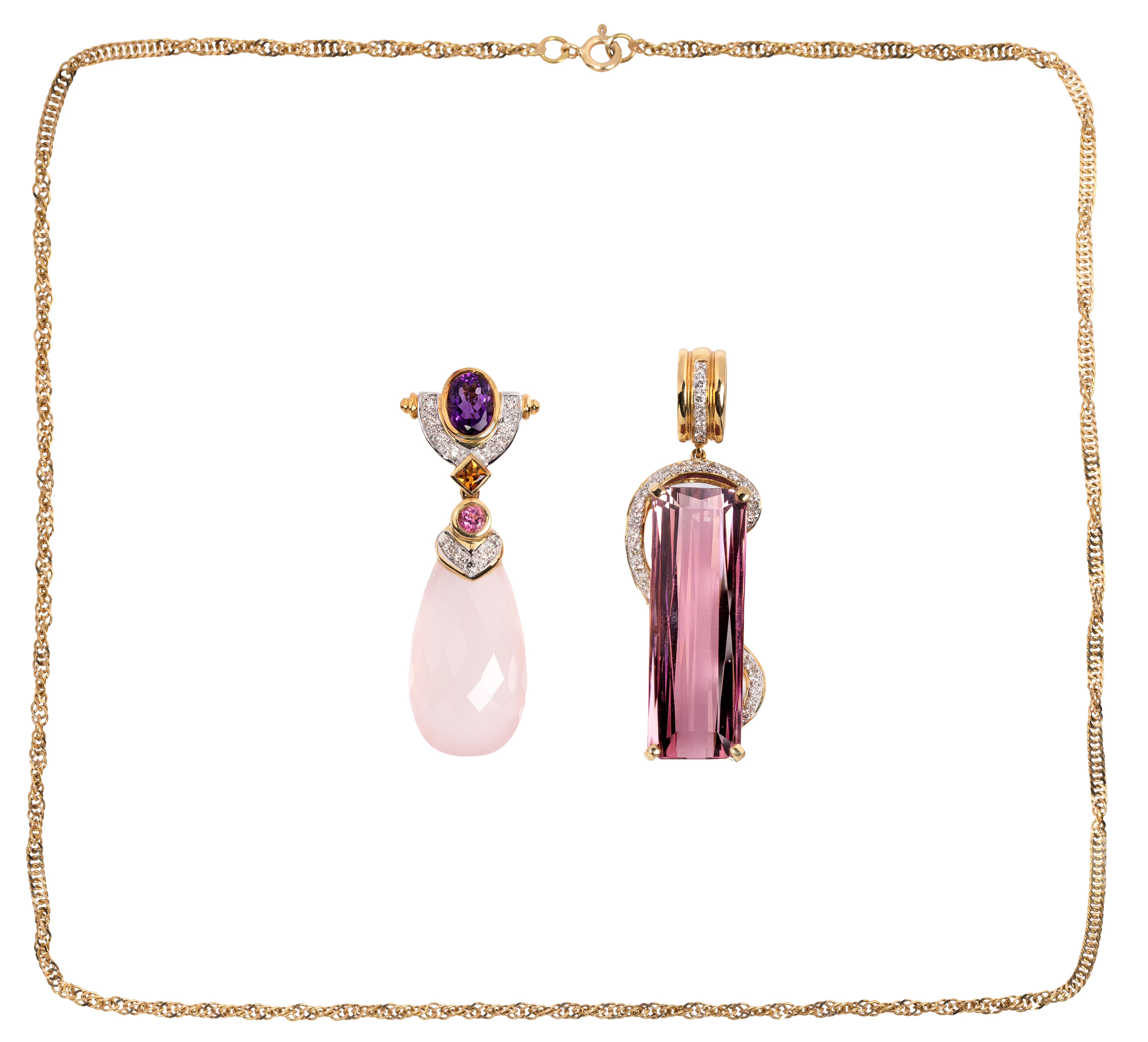 (3) total items including a pendant having a semi-precious faceted pink gemstone (approximately 20 x 14mm) with the drop having a mixed gemstone topper and a pendant having a semi-precious gemstone (approximately 35.4 x 12.3mm) encased in a diamond bezel; together with a twisted rope chain necklace (all marked ’18k’)