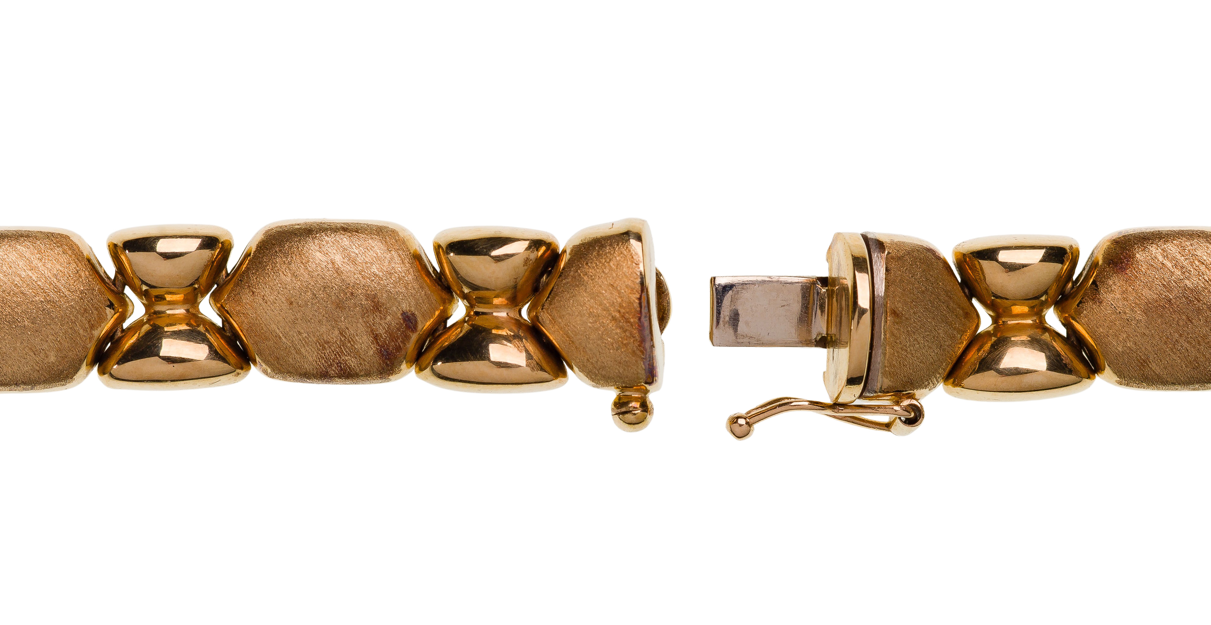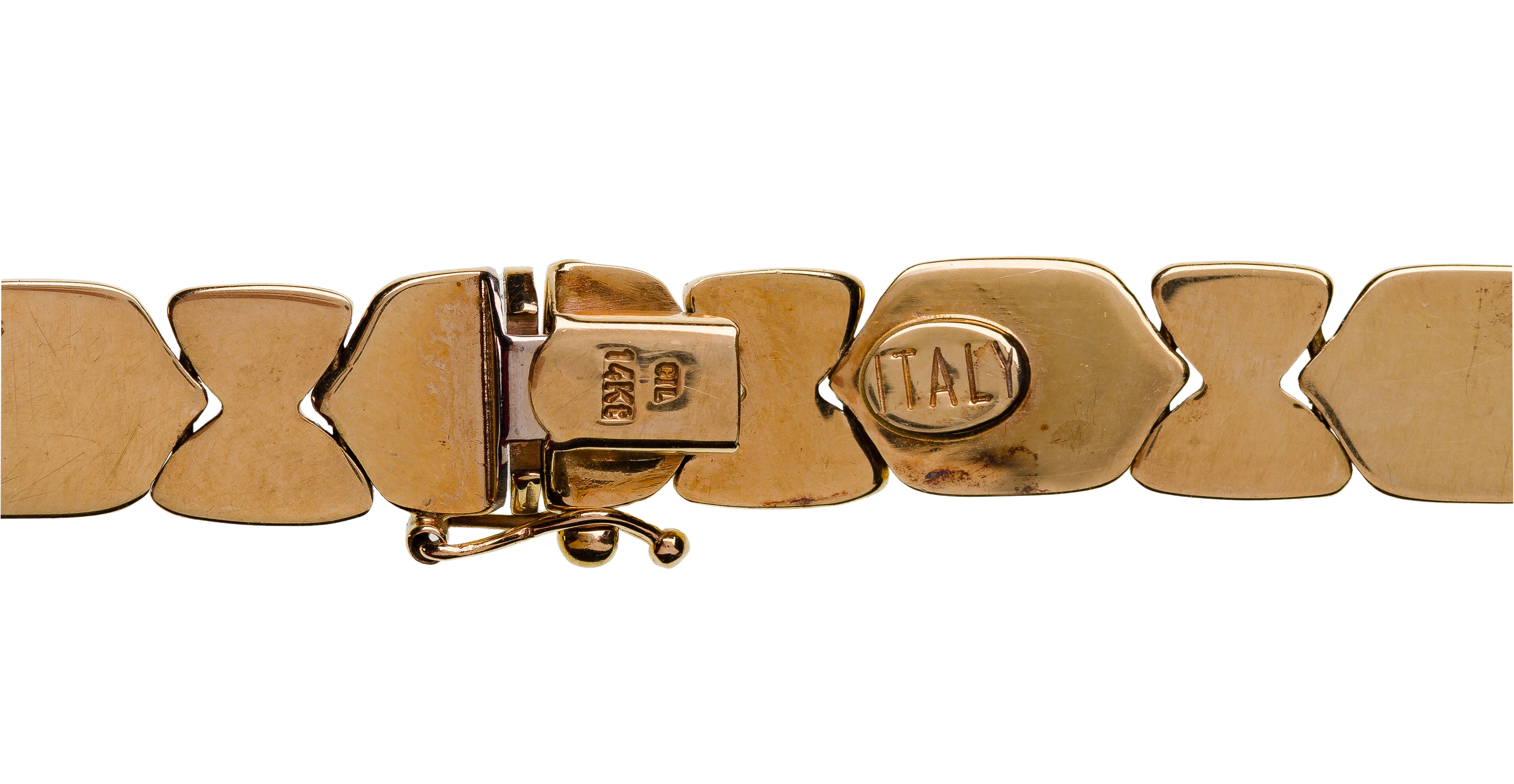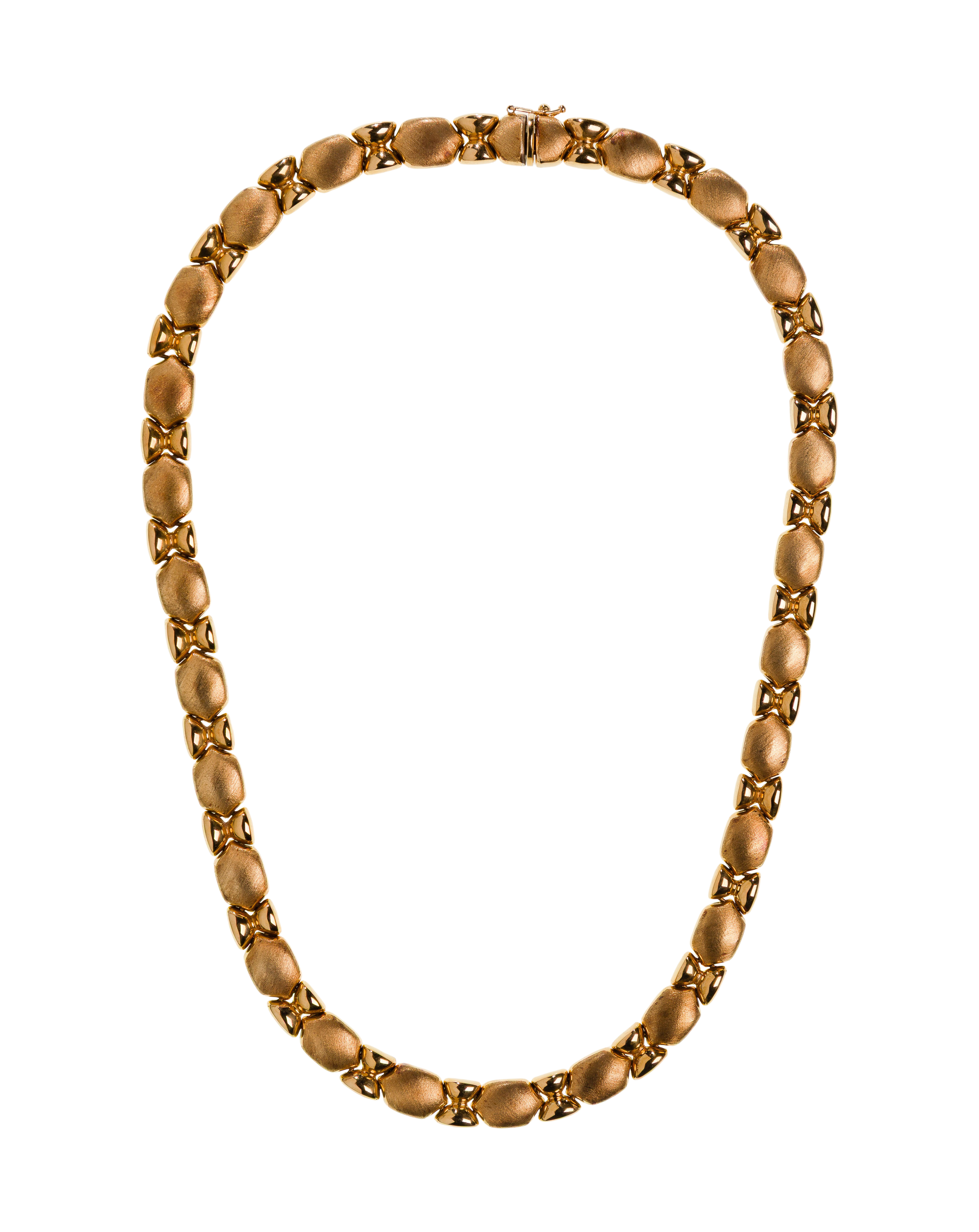 A 0.375-inch wide link style necklace having satin and polished finish and flat backside (marked ’14k’)