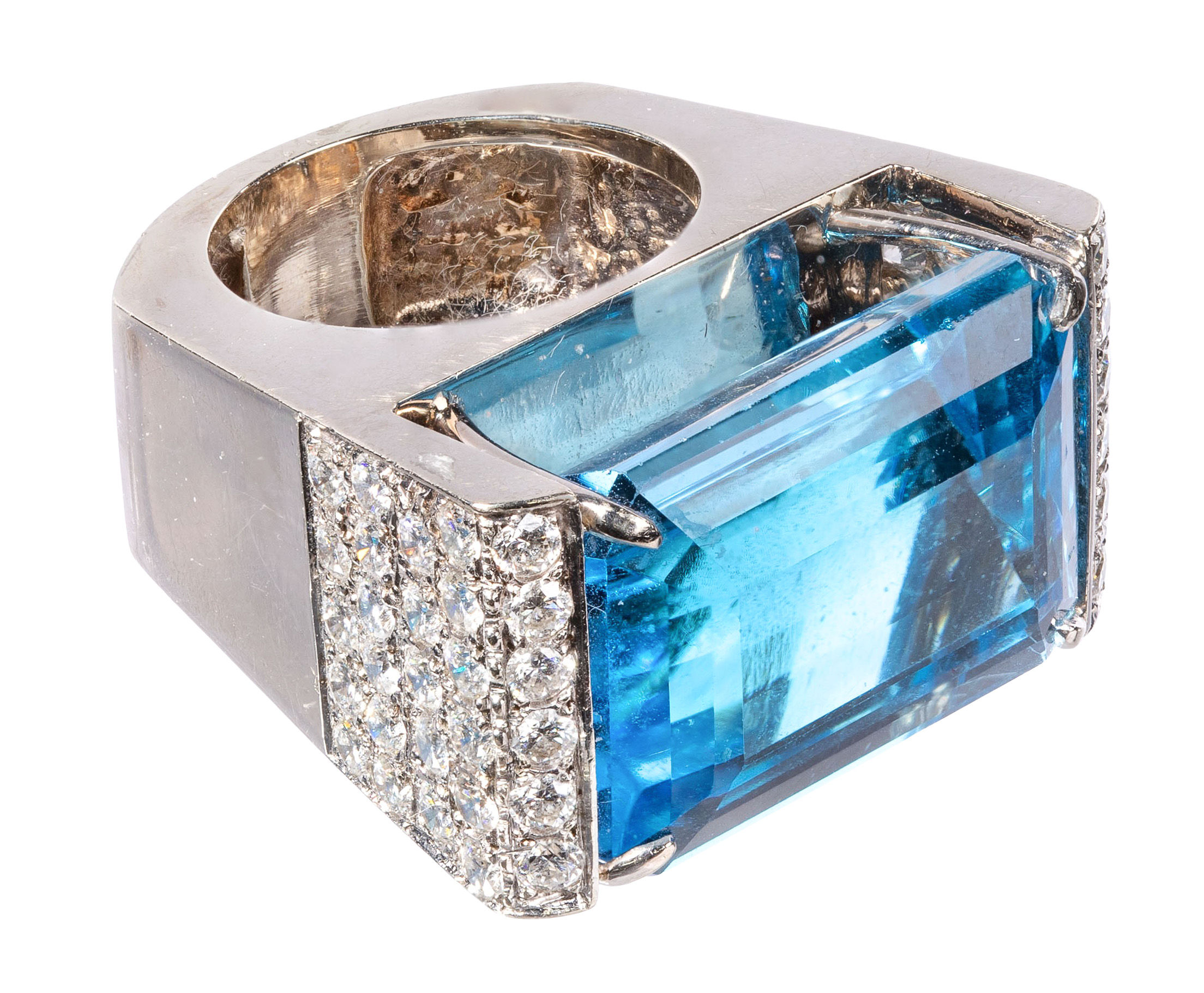 A cathedral style statement ring having an emerald cut blue topaz (approximately 23 x 16mm) flanked on each side by twenty-eight round cut diamonds weighing approximately 3.00 carats total (marked ’14k’), including presentation box, insurance appraisal and gemstone certificate