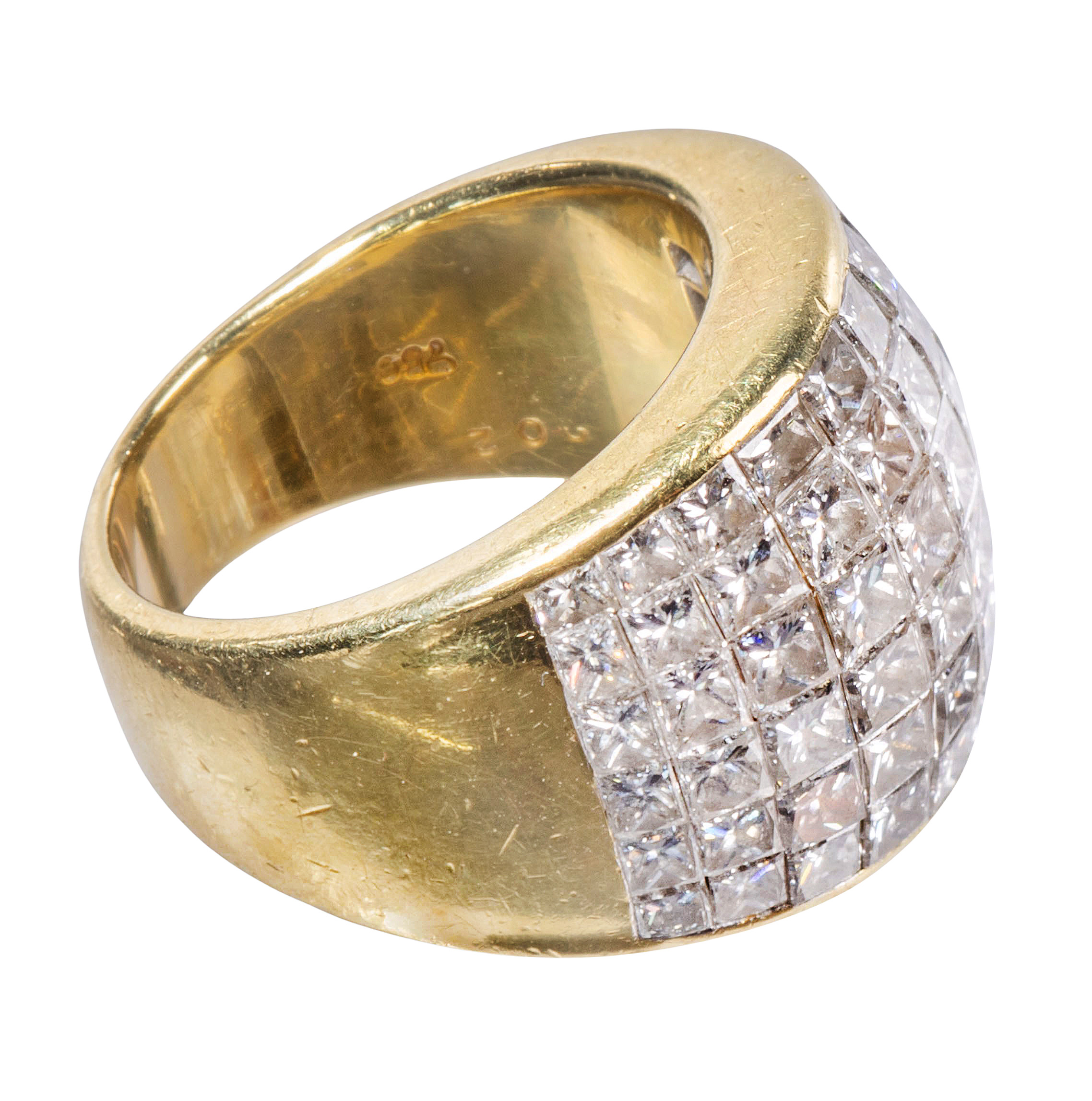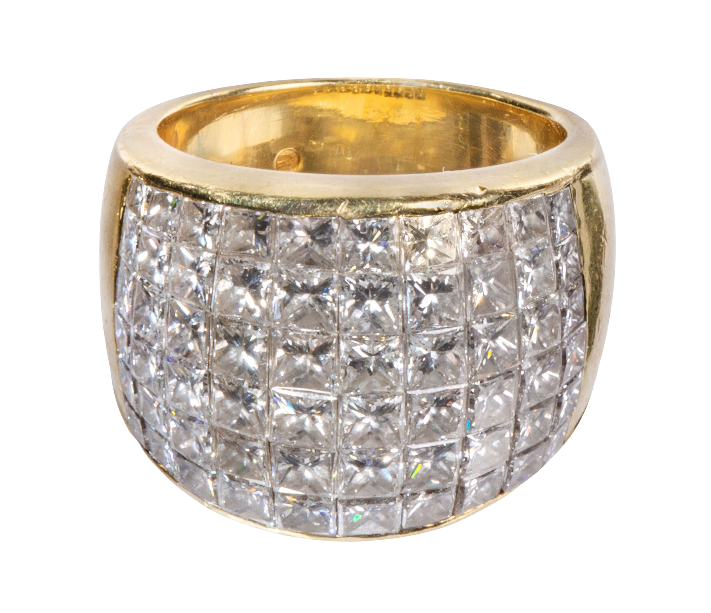 A band style having six rows of ten various size princess cut diamonds weighing approximately 6.0 carats total, average of VS-2 clarity and I-J color across (marked ‘750’), having presentation box and appraisal