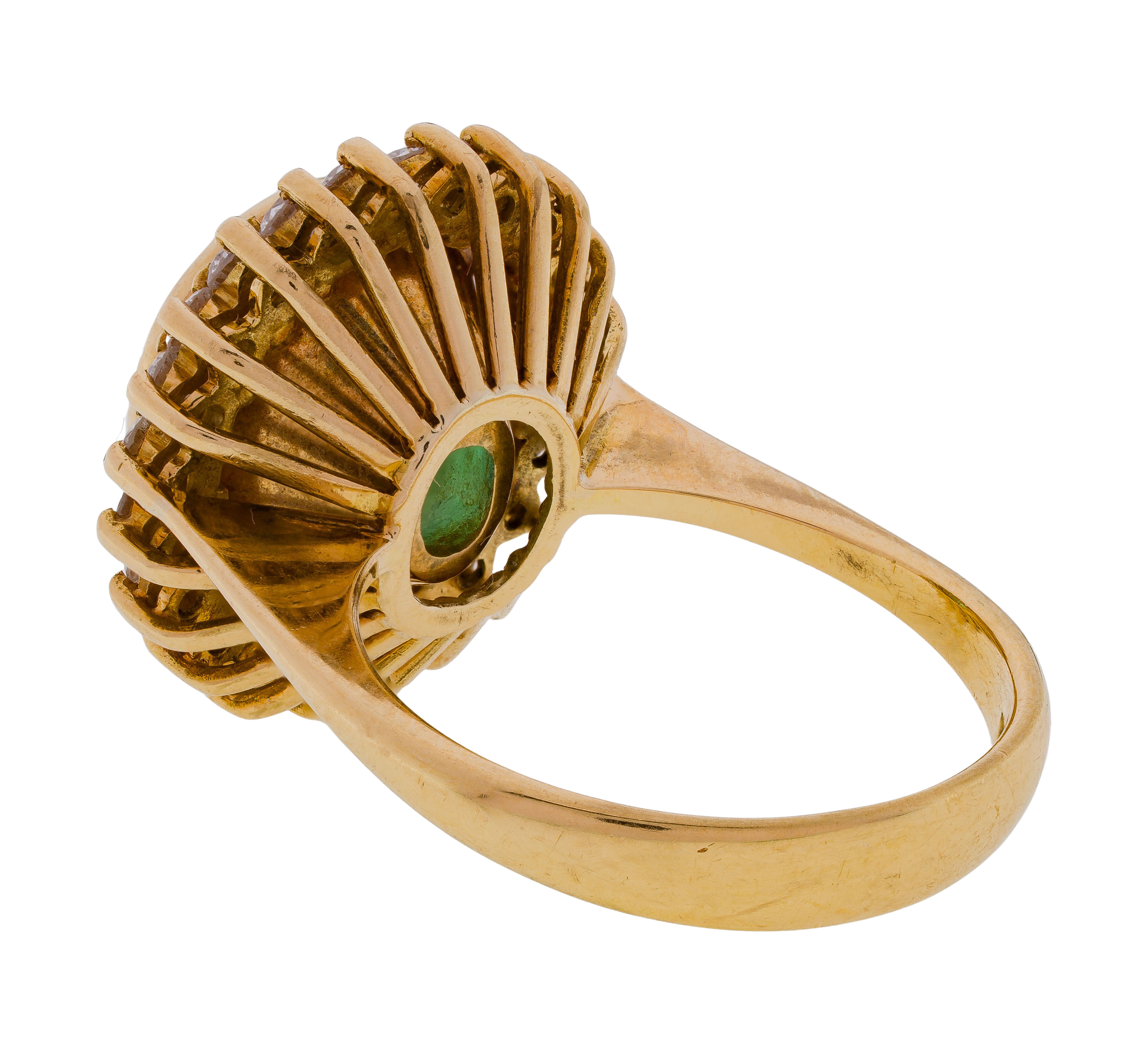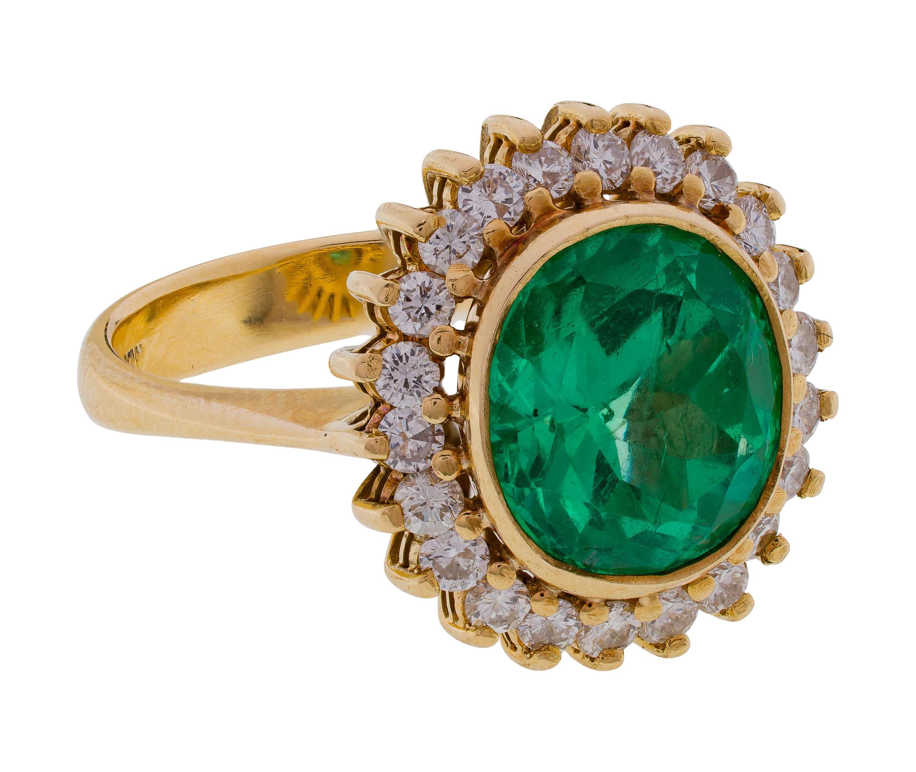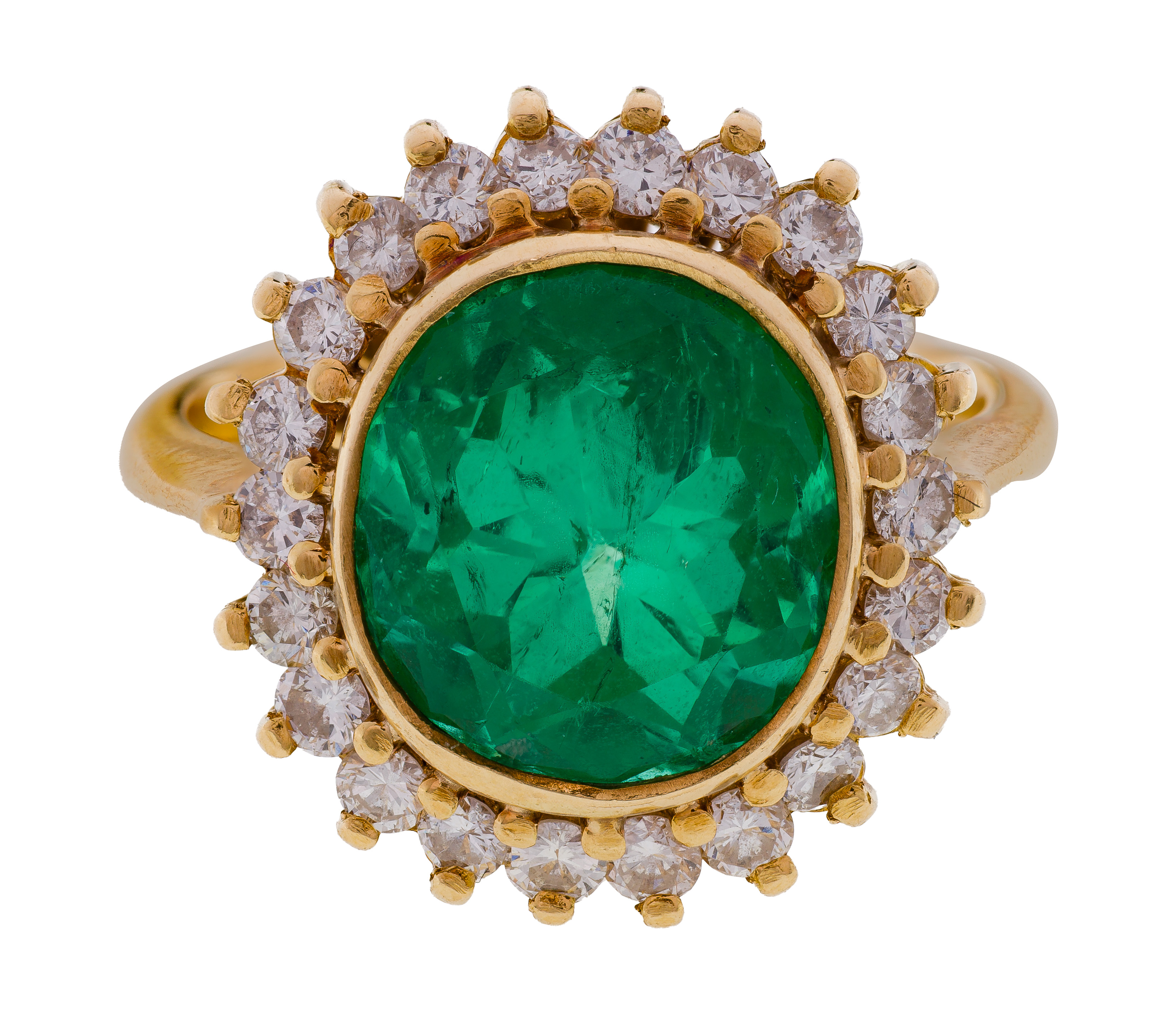 A round cut center emerald weighing approximately 4.09 carats (10.69 x 9.96 x 7.32mm) surrounded by twenty-two round cut diamonds weighing approximately 0.33 carat total (marked ’18k’)